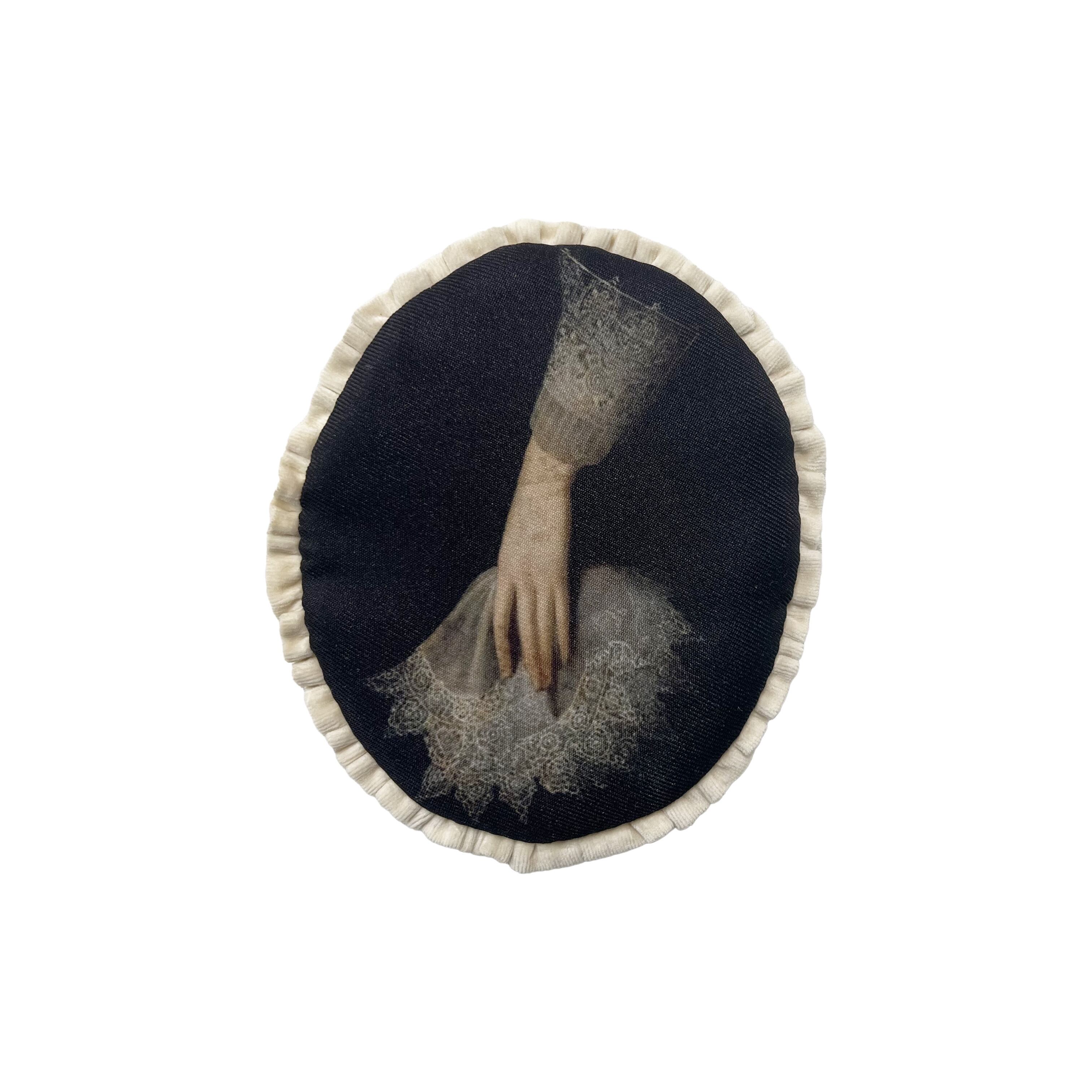 中世の絵画をプリントした生地に、アイボリーのコットンベロア生地でフリルを付けました。