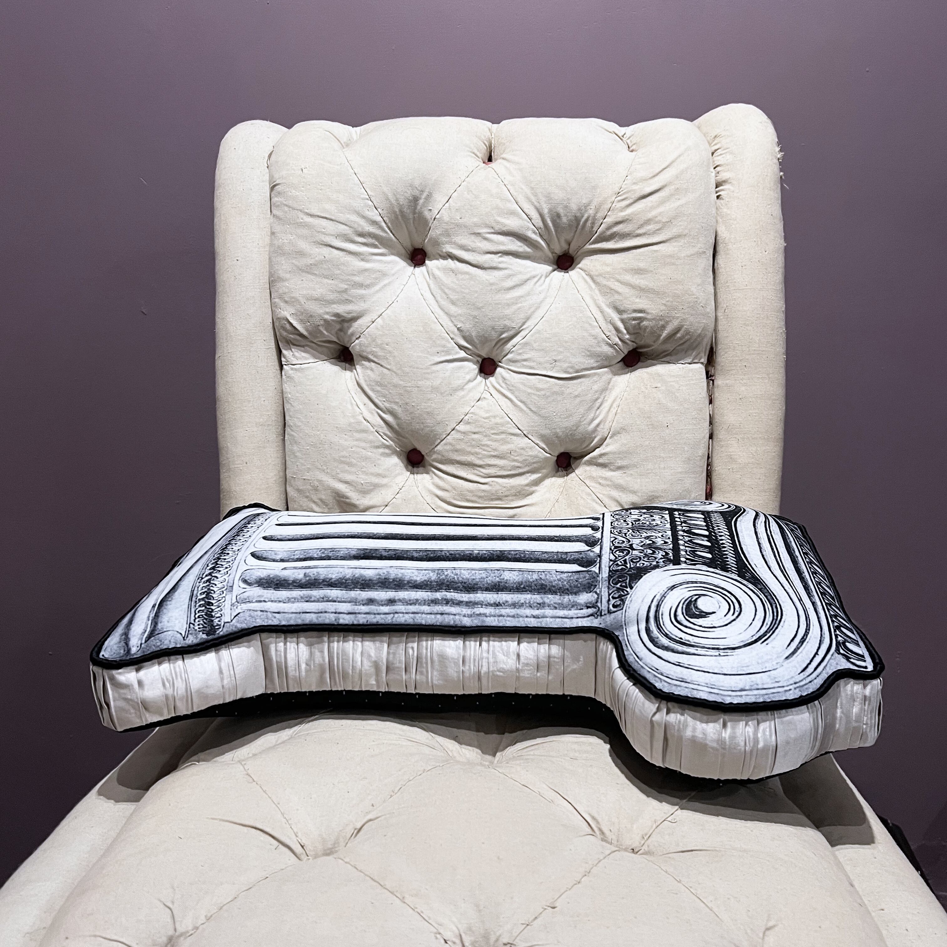 古いイオニア式柱の図面をプリントした生地に、ブラックのサテン生地のパイピングをつけました。
