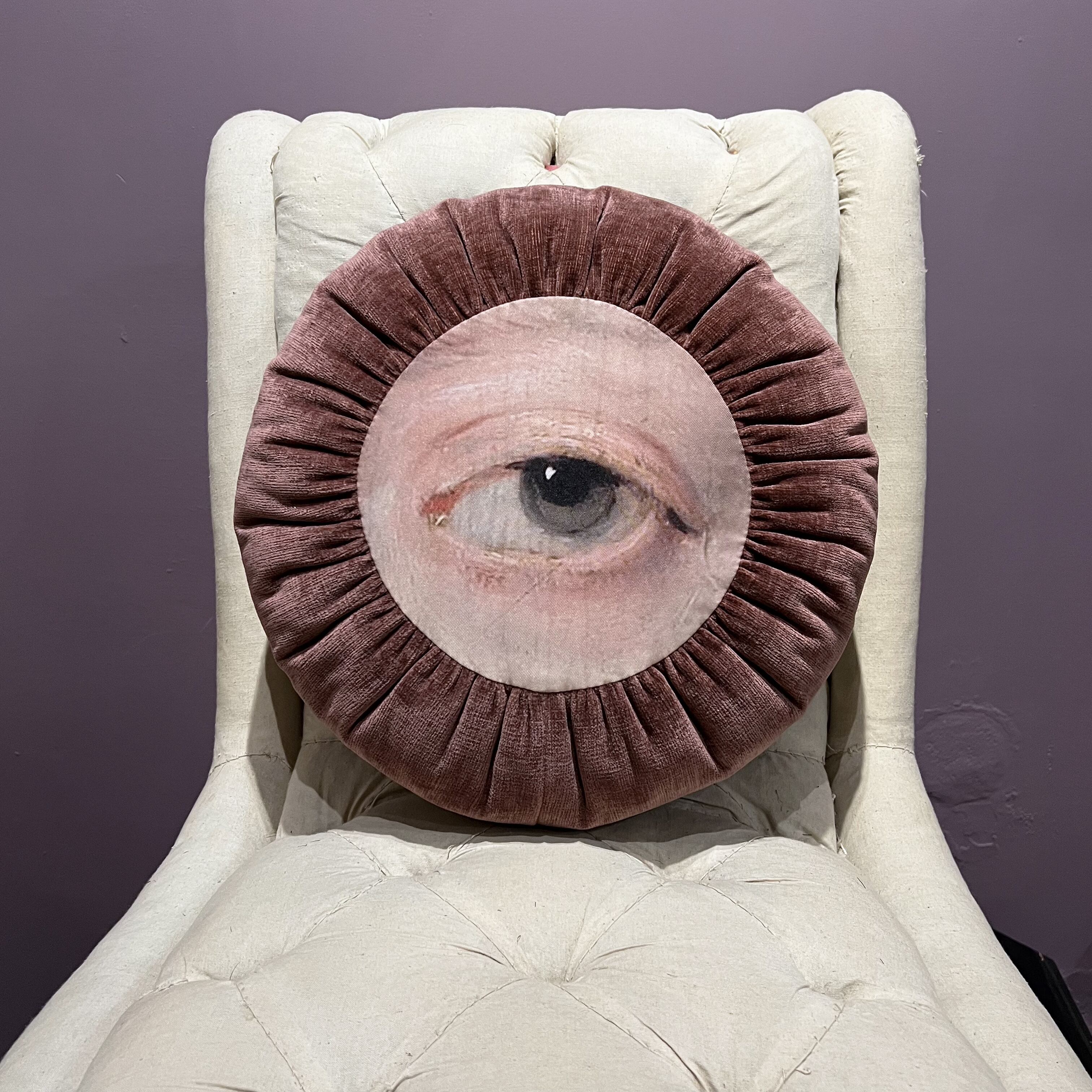 中世の絵画をプリントした生地に、アンティーク感のあるブリックレッド色のシェニール織り生地を合わせました。