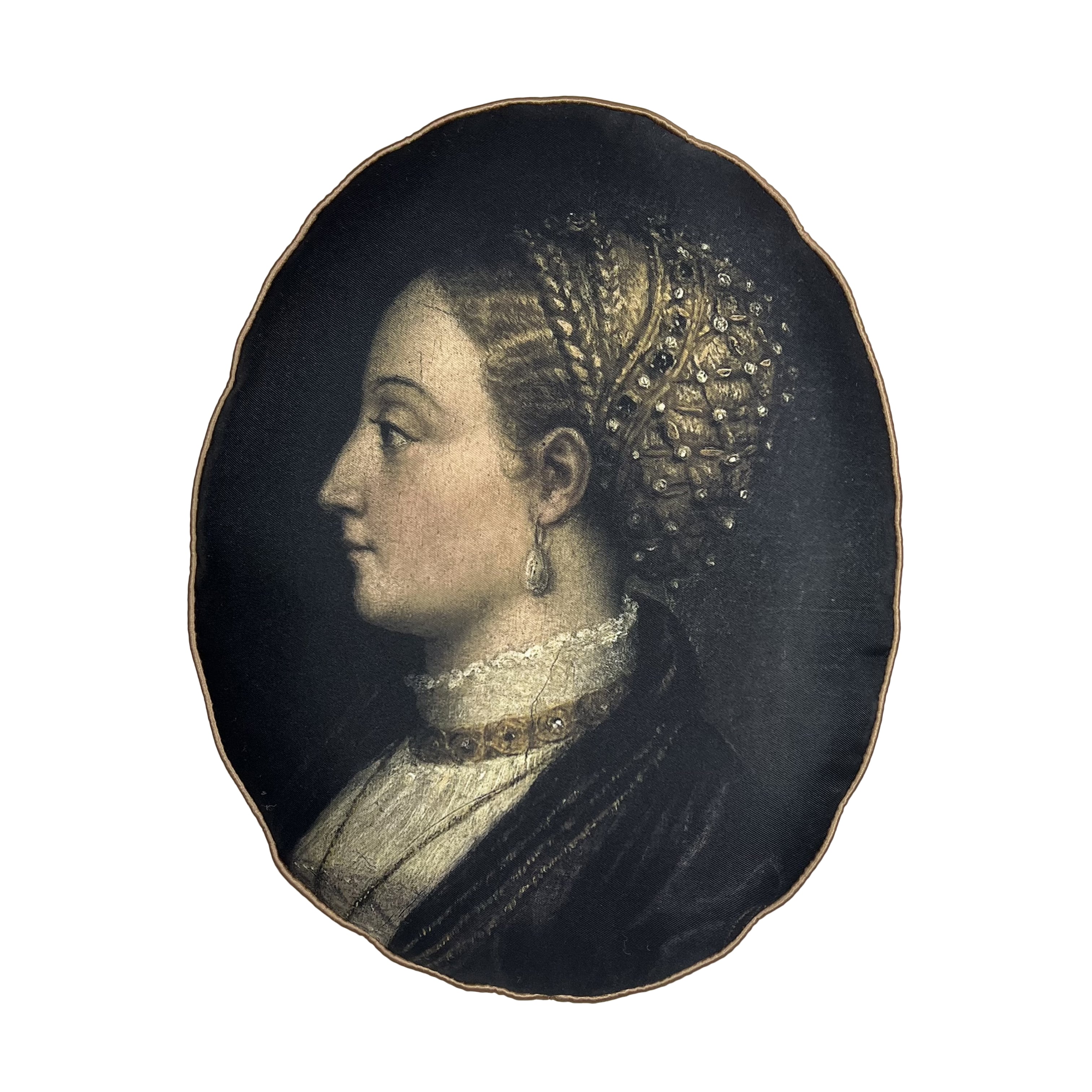 中世の肖像画をプリントした生地に、ゴールドサテンのパイピング、マチはアイボリー色のランダムプリーツのサテン生地を合わせました。