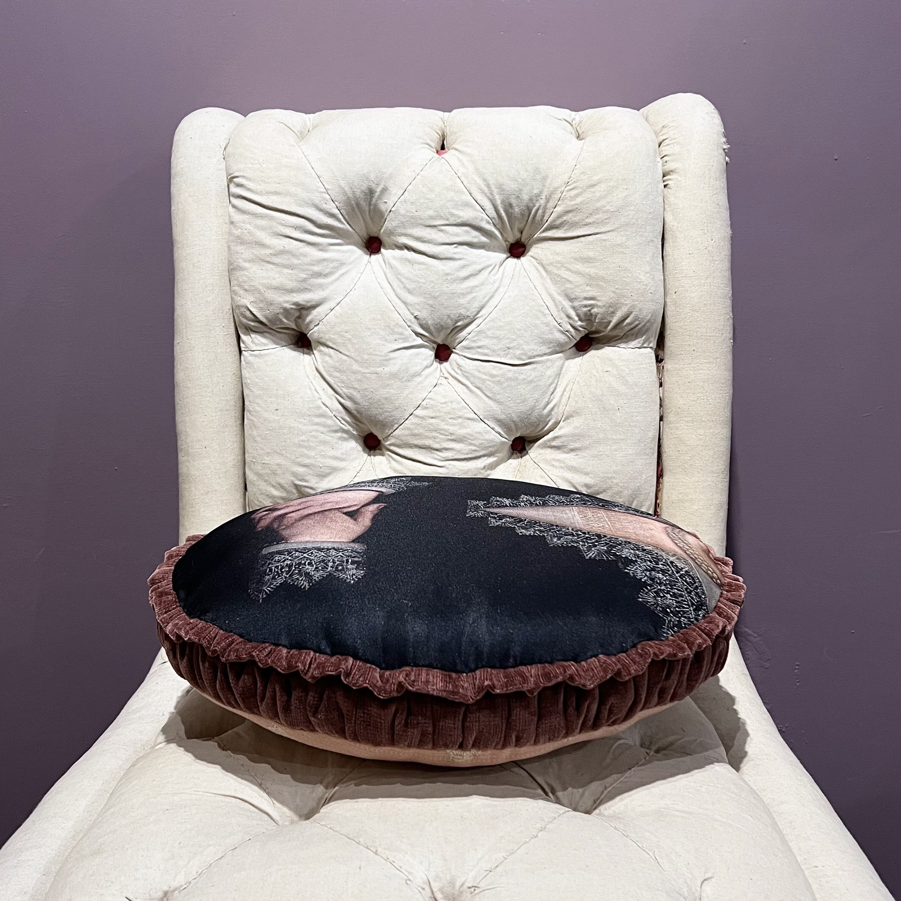 中世の絵画をプリントした生地に、アンティーク感のあるブリックレッド色のシェニール織り生地でフリルとギャザーマチを付けました。
