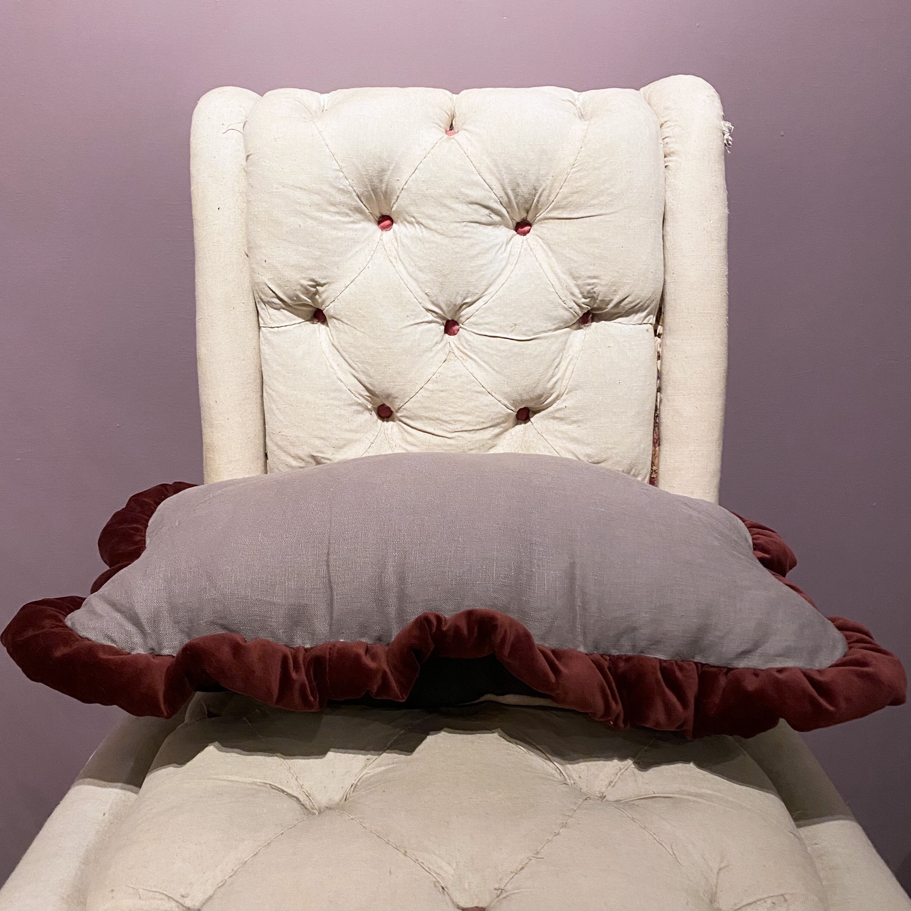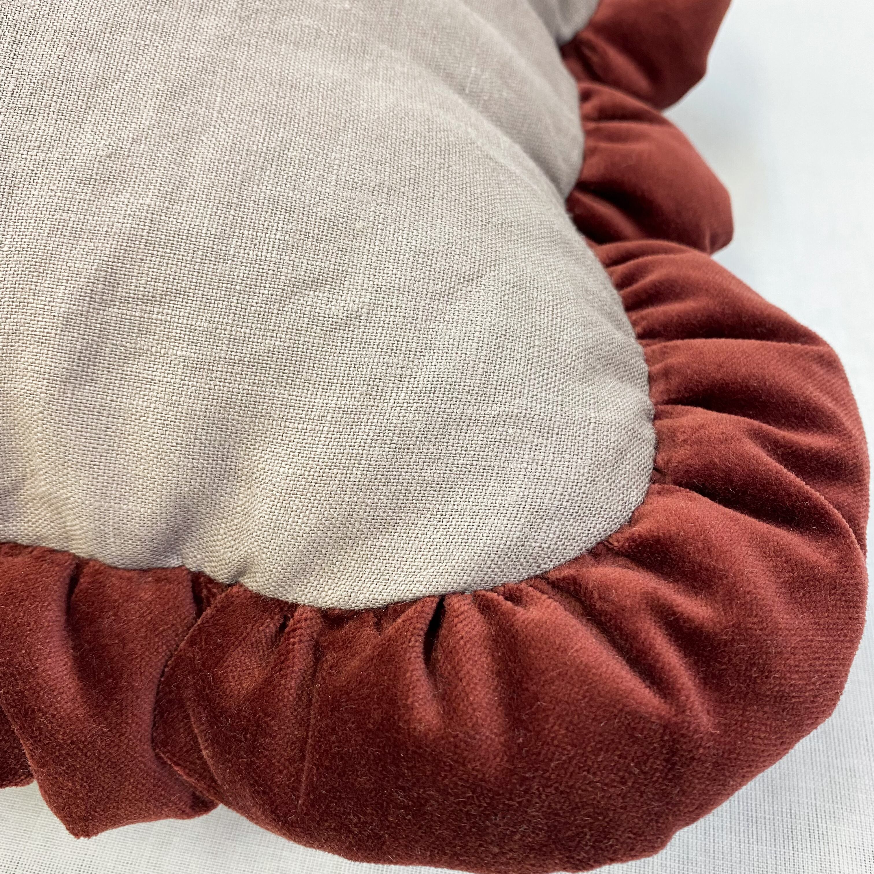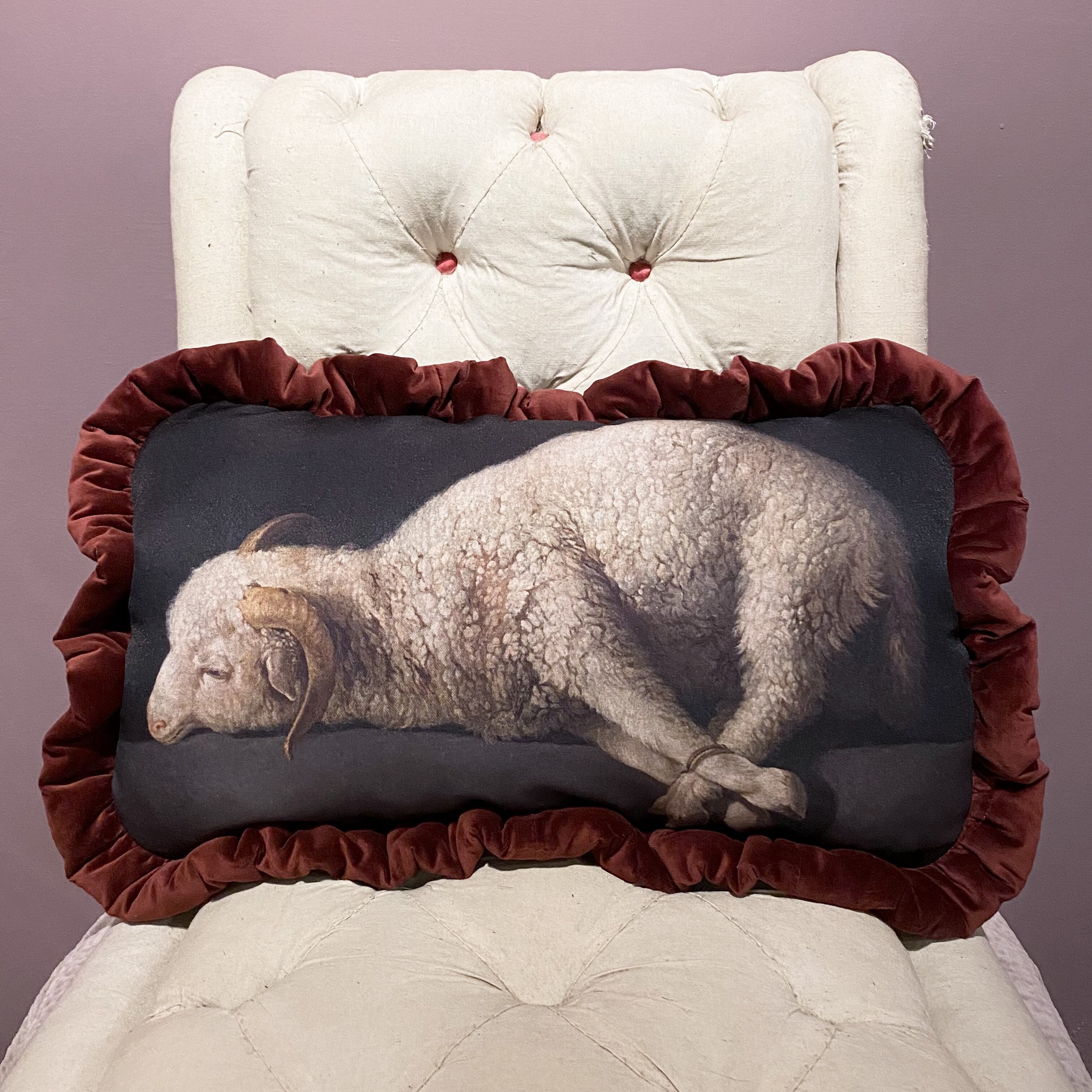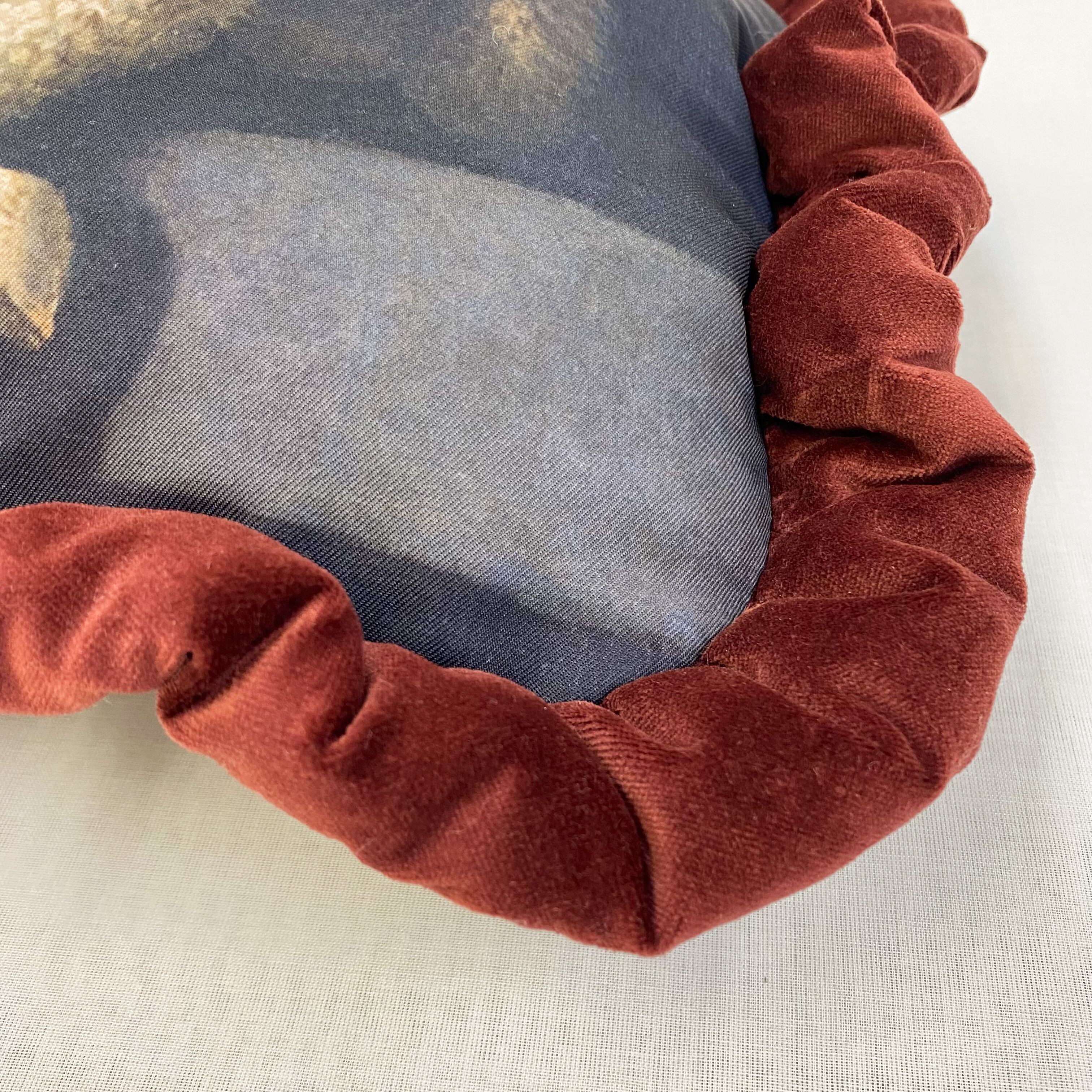 中世絵画の羊をプリントした生地に、レンガ色のベロア生地で中綿入りフリルを付けました。
