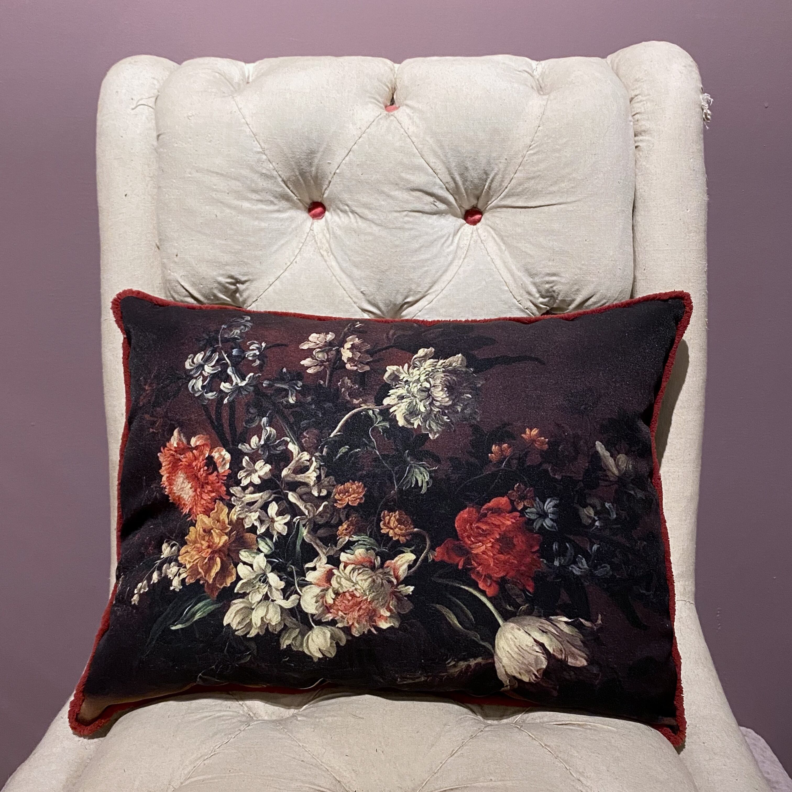 中世の花の絵画をプリントした生地に、落ち着いた赤色のフリンジを付けました。