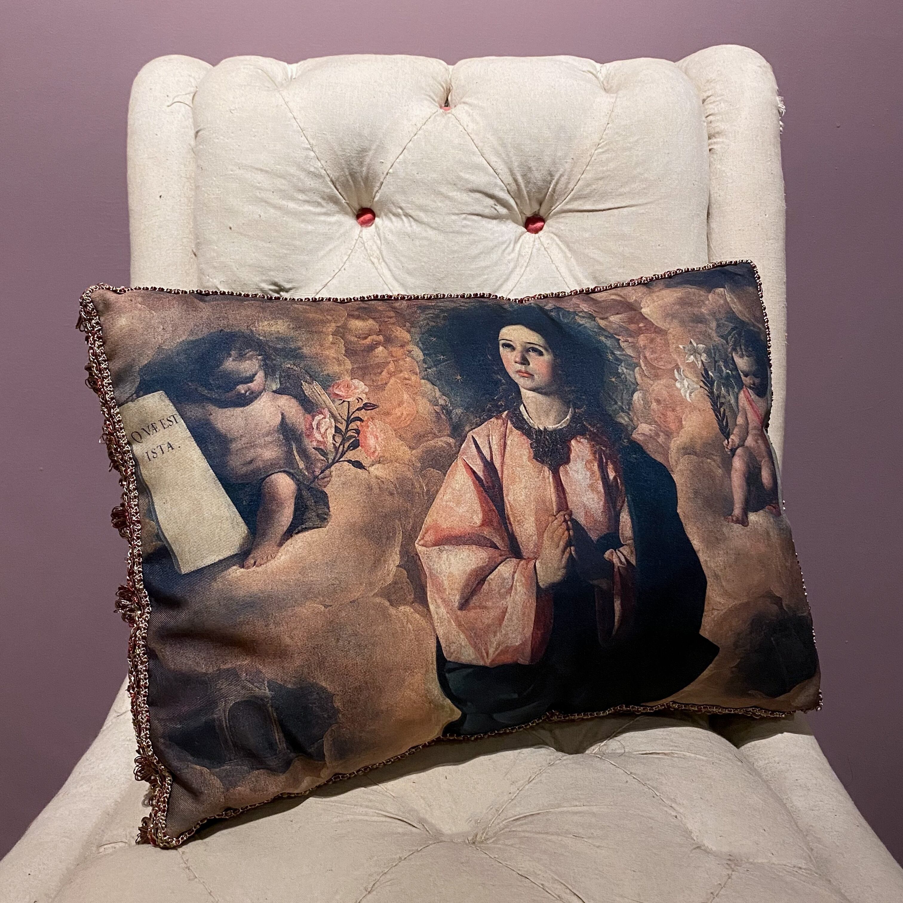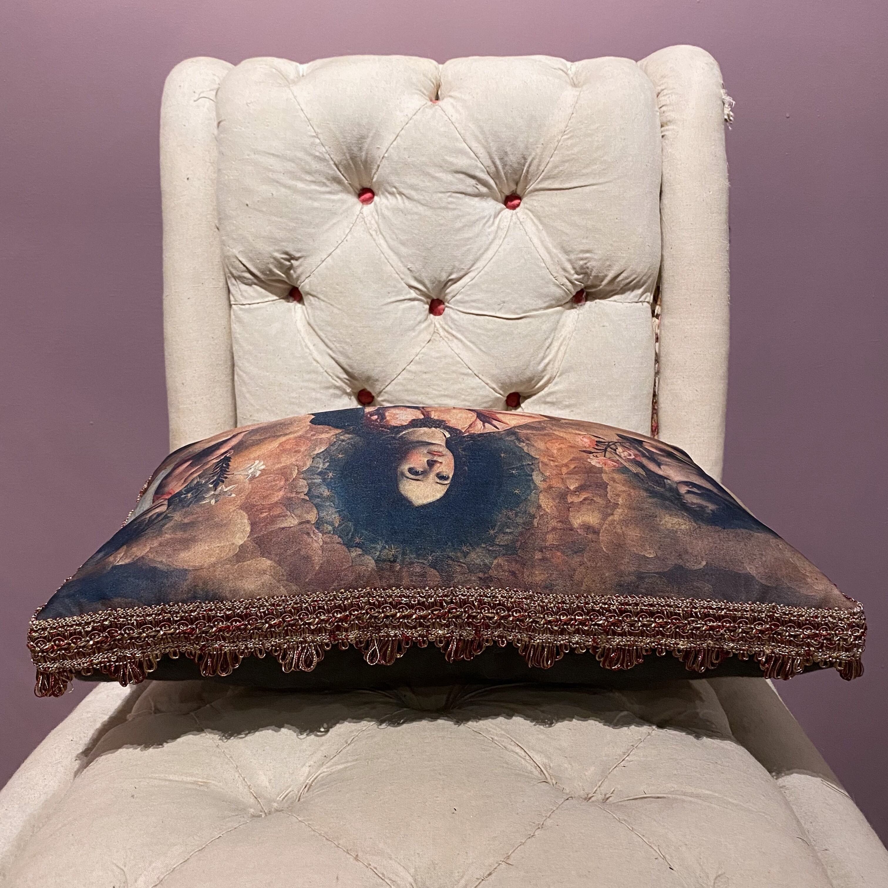 中世の絵画をプリントした生地に、額縁のようにボルドー&ゴールドのブレードを手縫いで付けました。