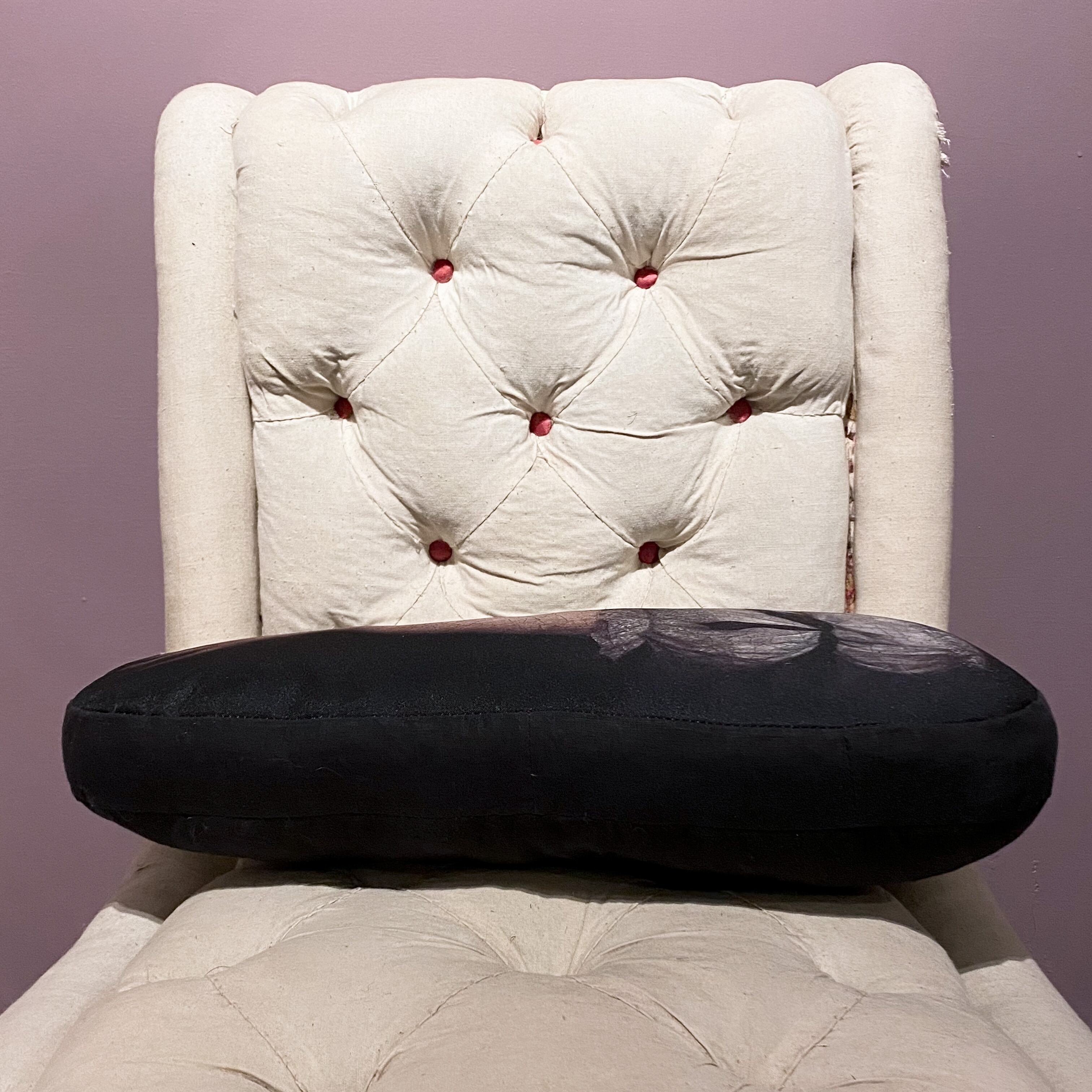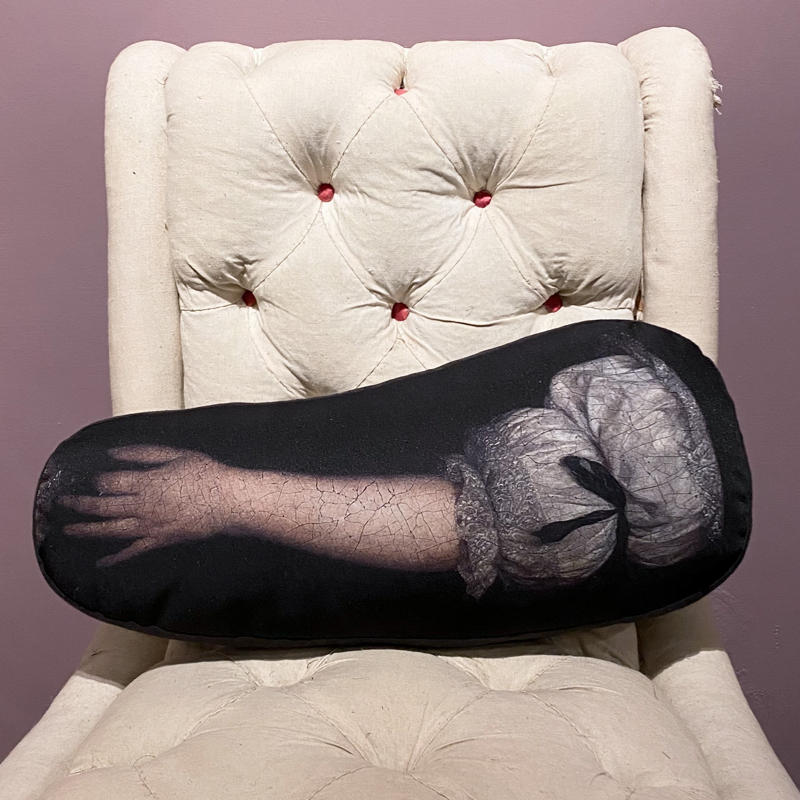 中世絵画の女性の手をプリントした生地を使った変形クッション。