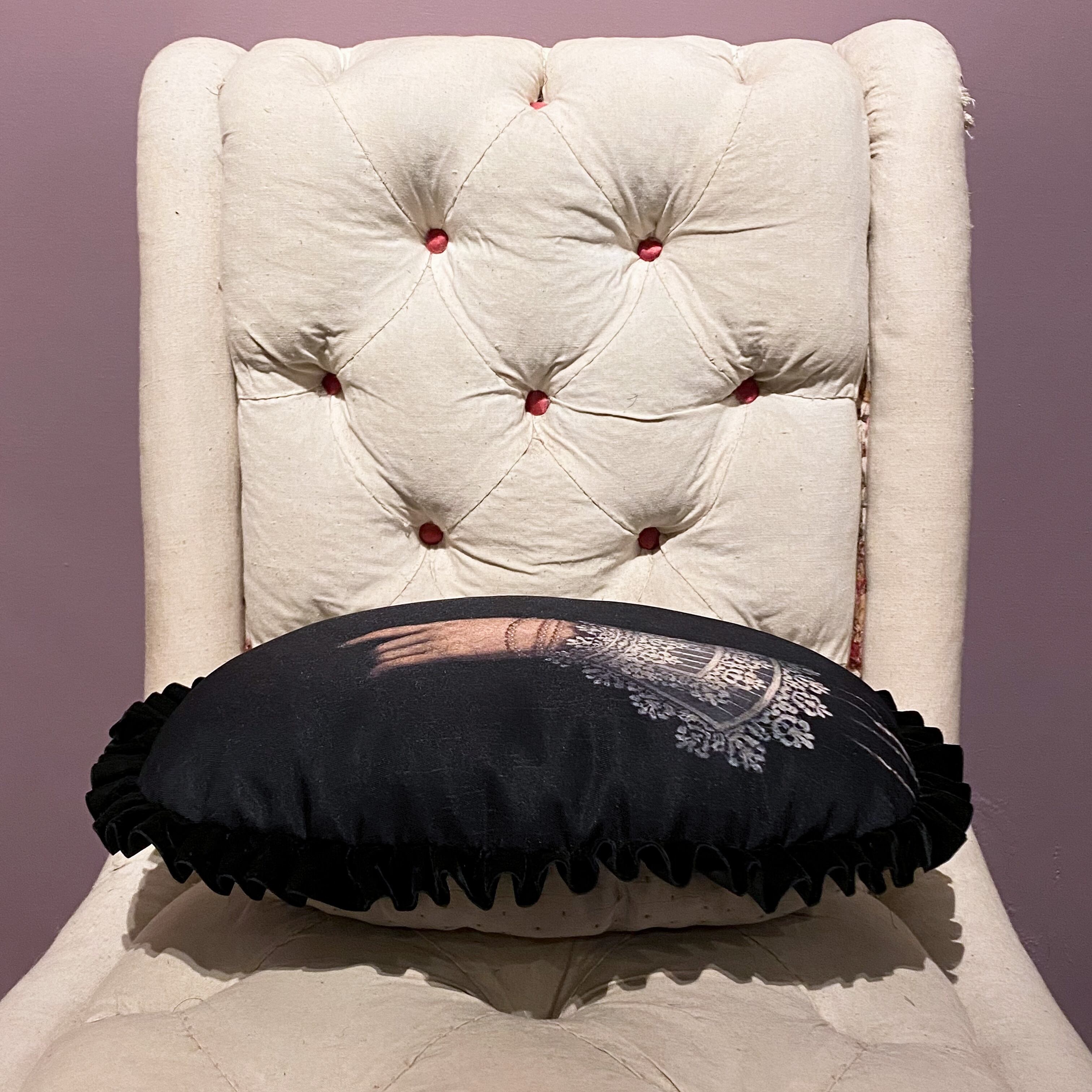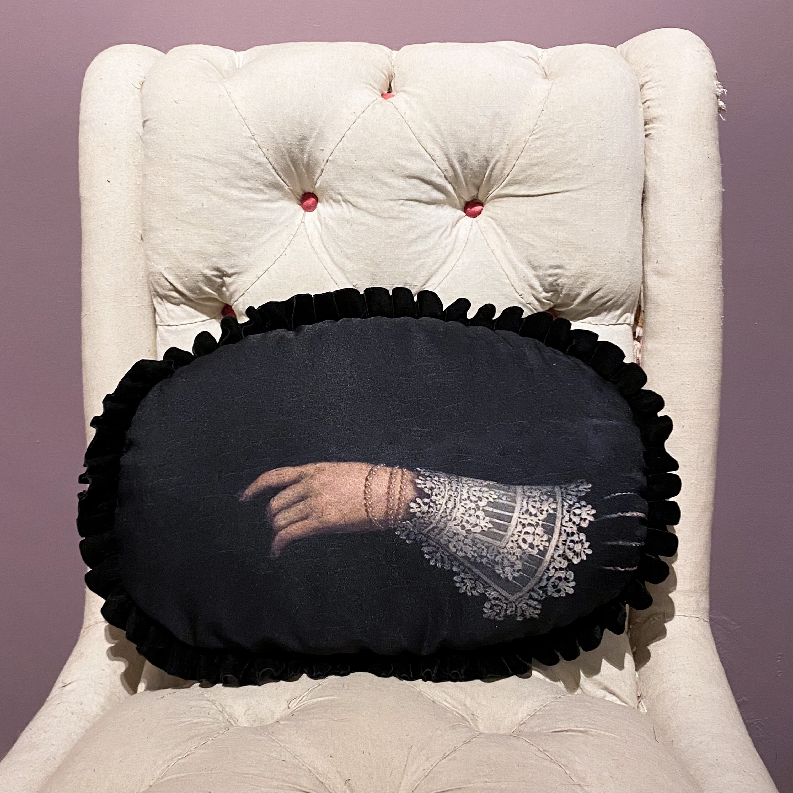 中世絵画の女性の手をプリントした生地に、ベロアのプリーツリボンを付けました。
