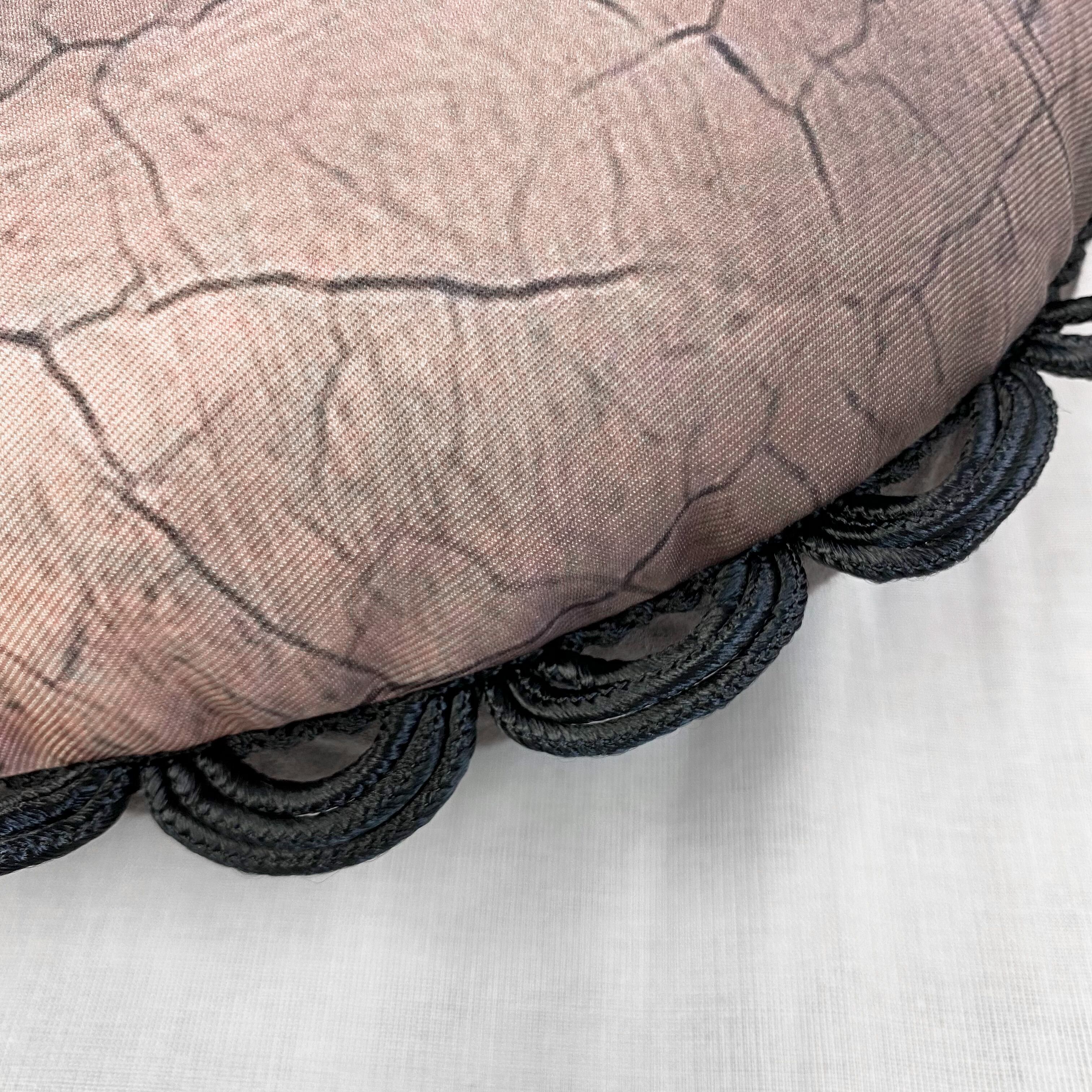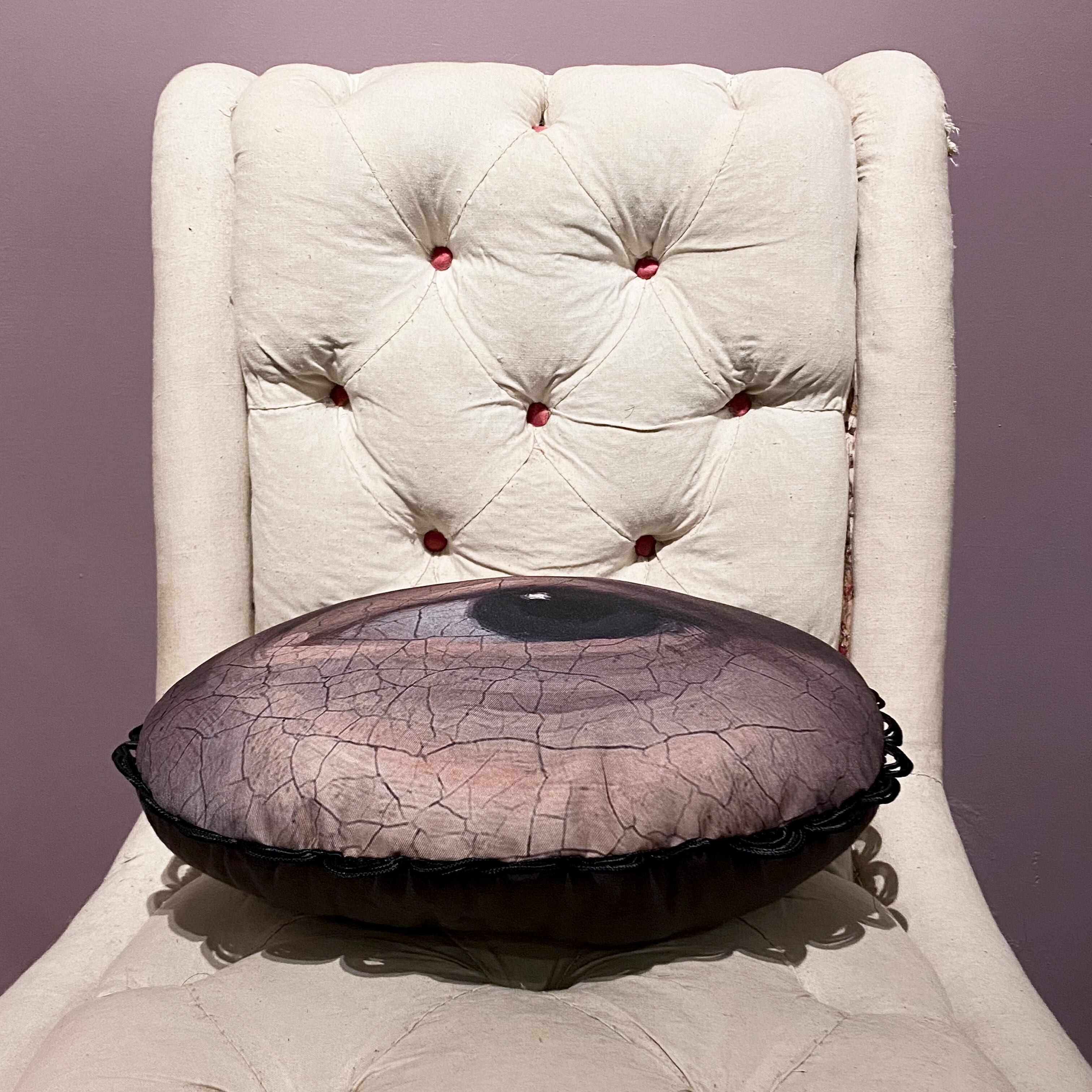 中世絵画の左目をプリントした生地に、ヴィンテージのスカラップフリンジを付けました。