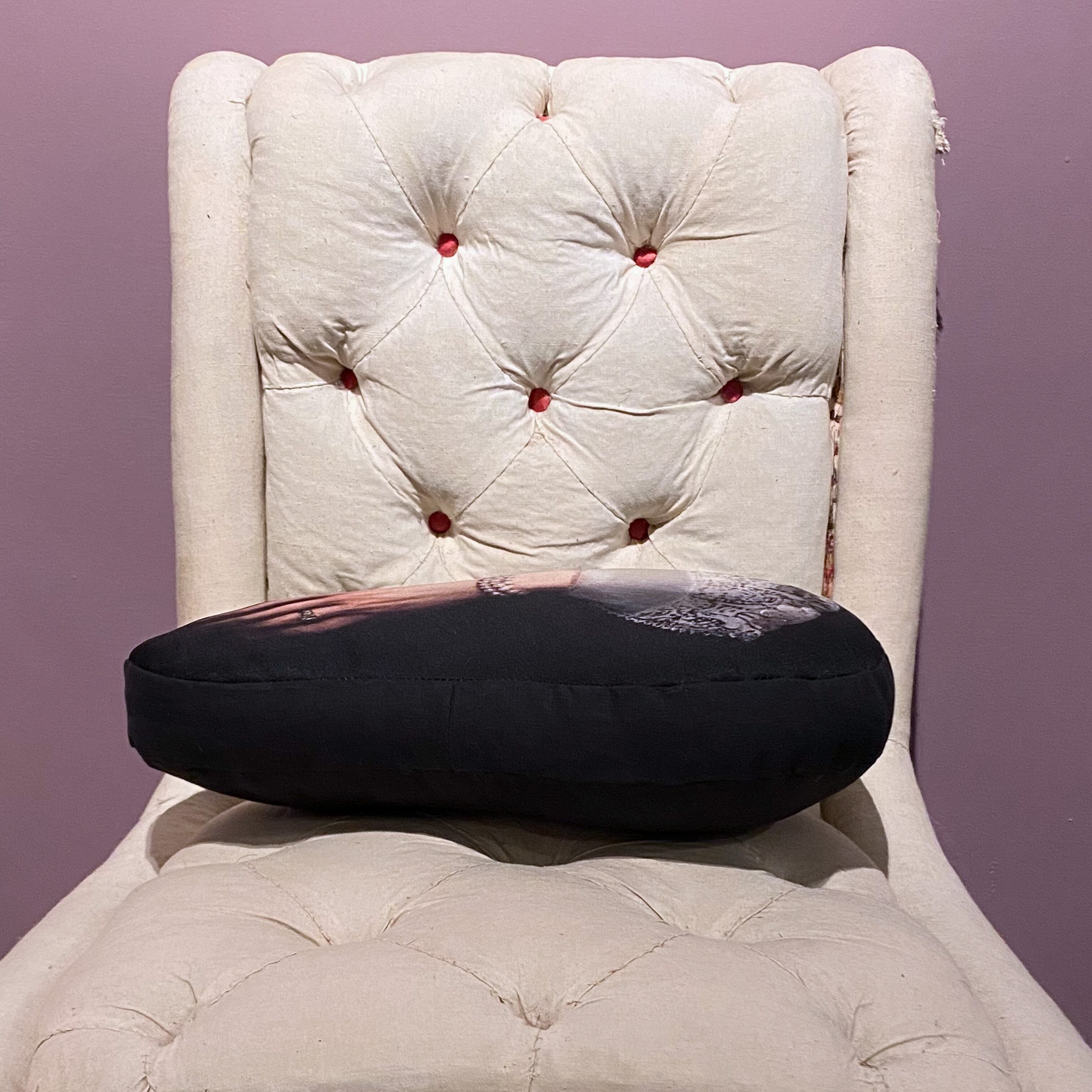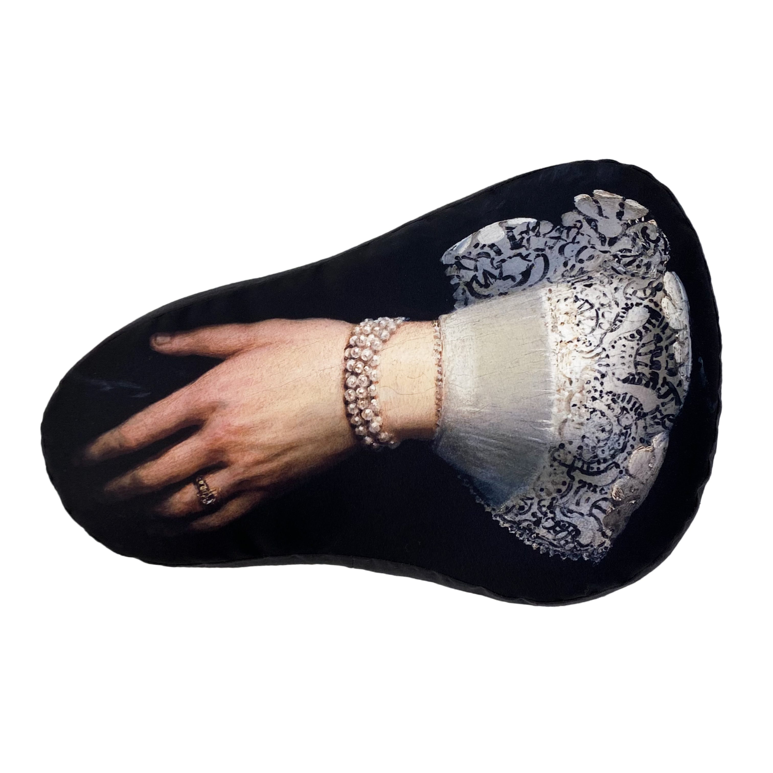 中世絵画の女性の手をプリントした生地を使った変形クッション。