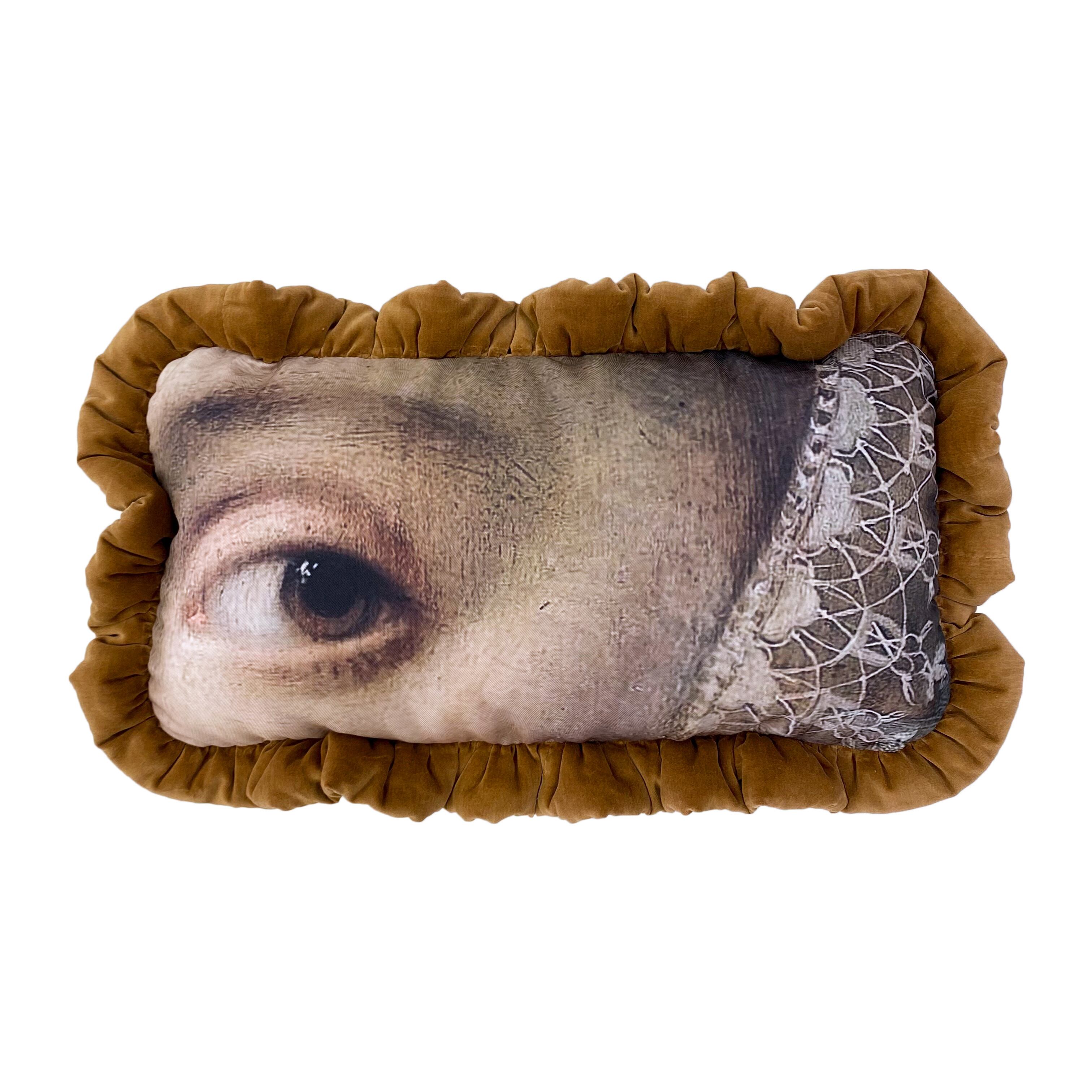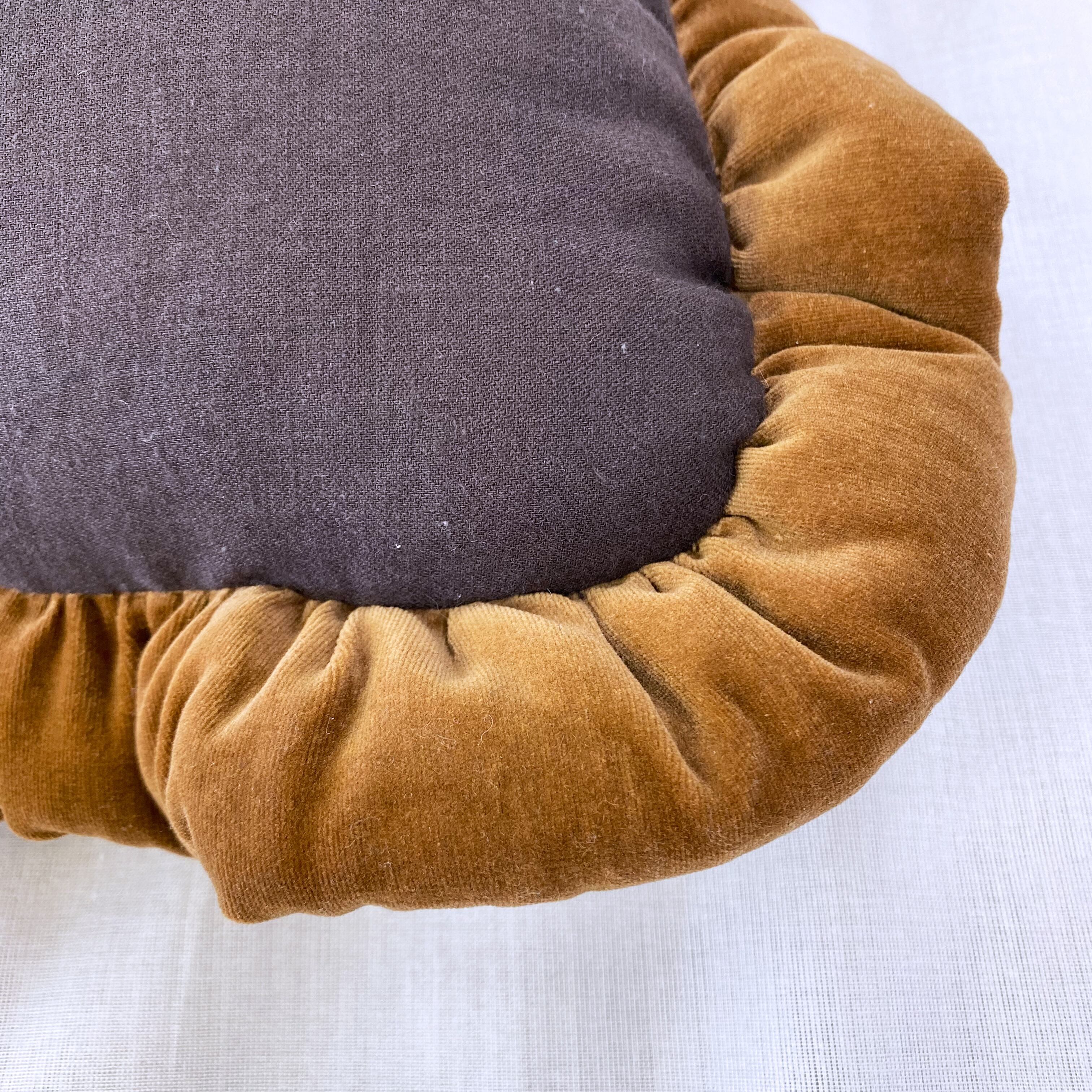 中世絵画をプリントした生地に、キャメル色のコットンベロア生地で中綿入りフリルを付けました。