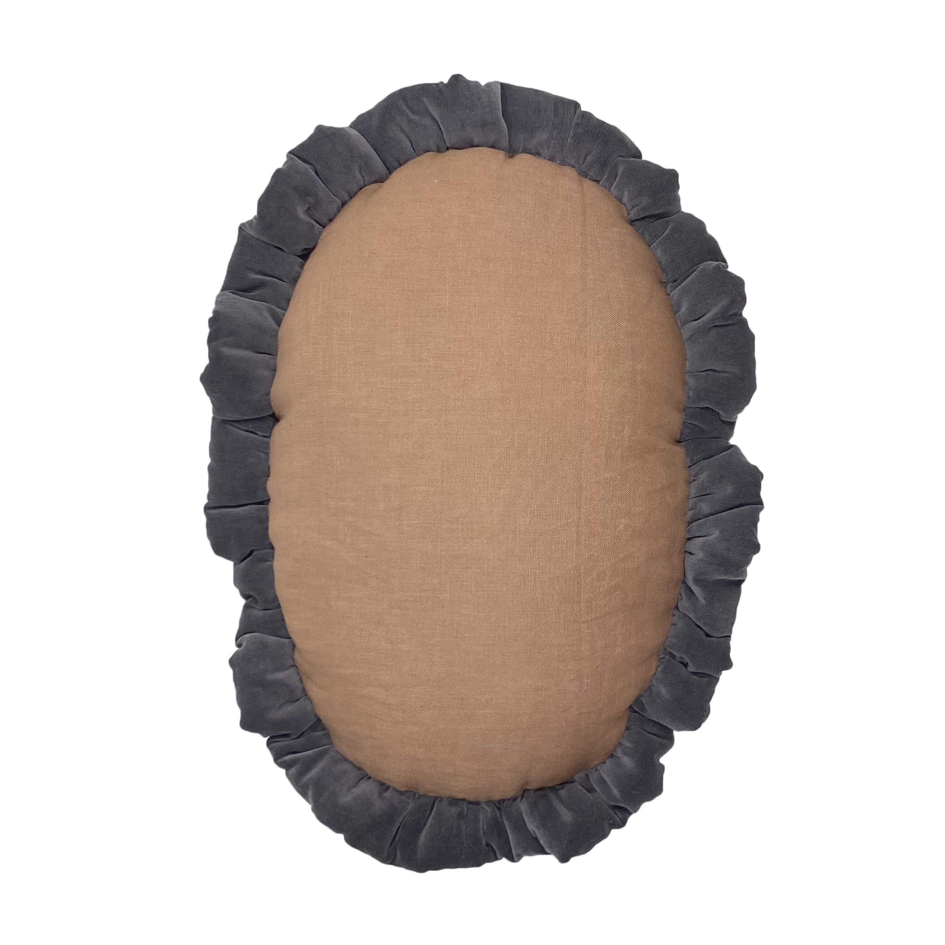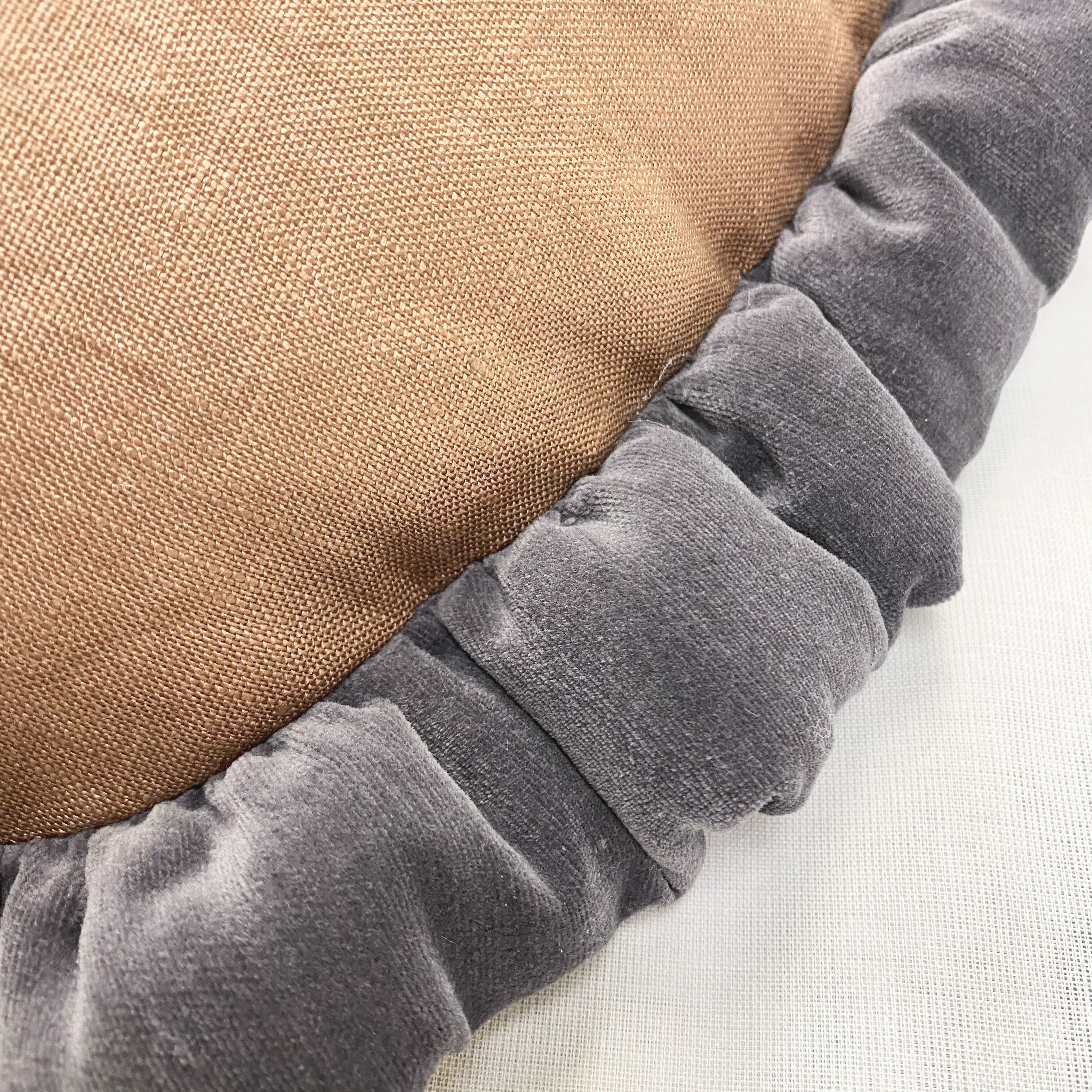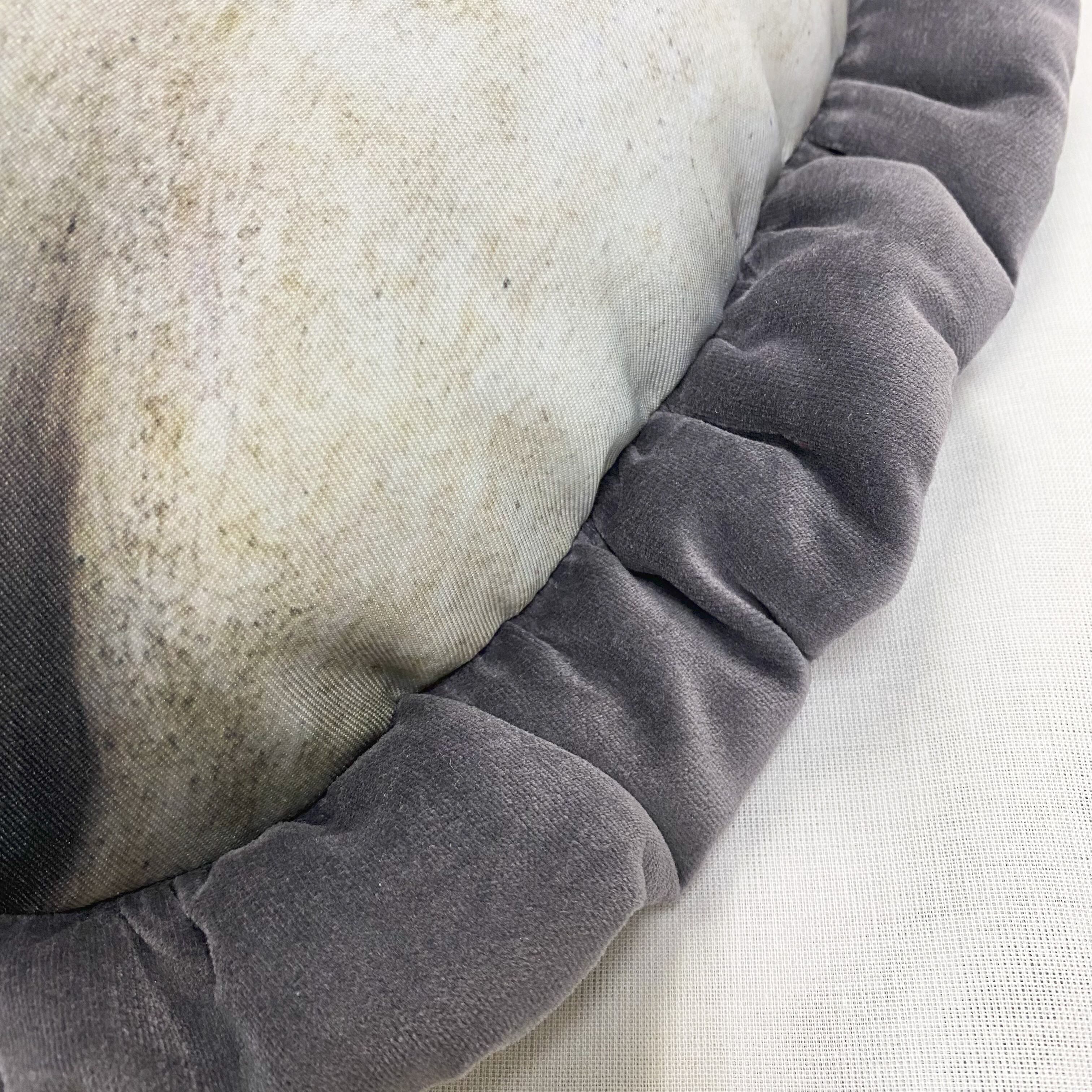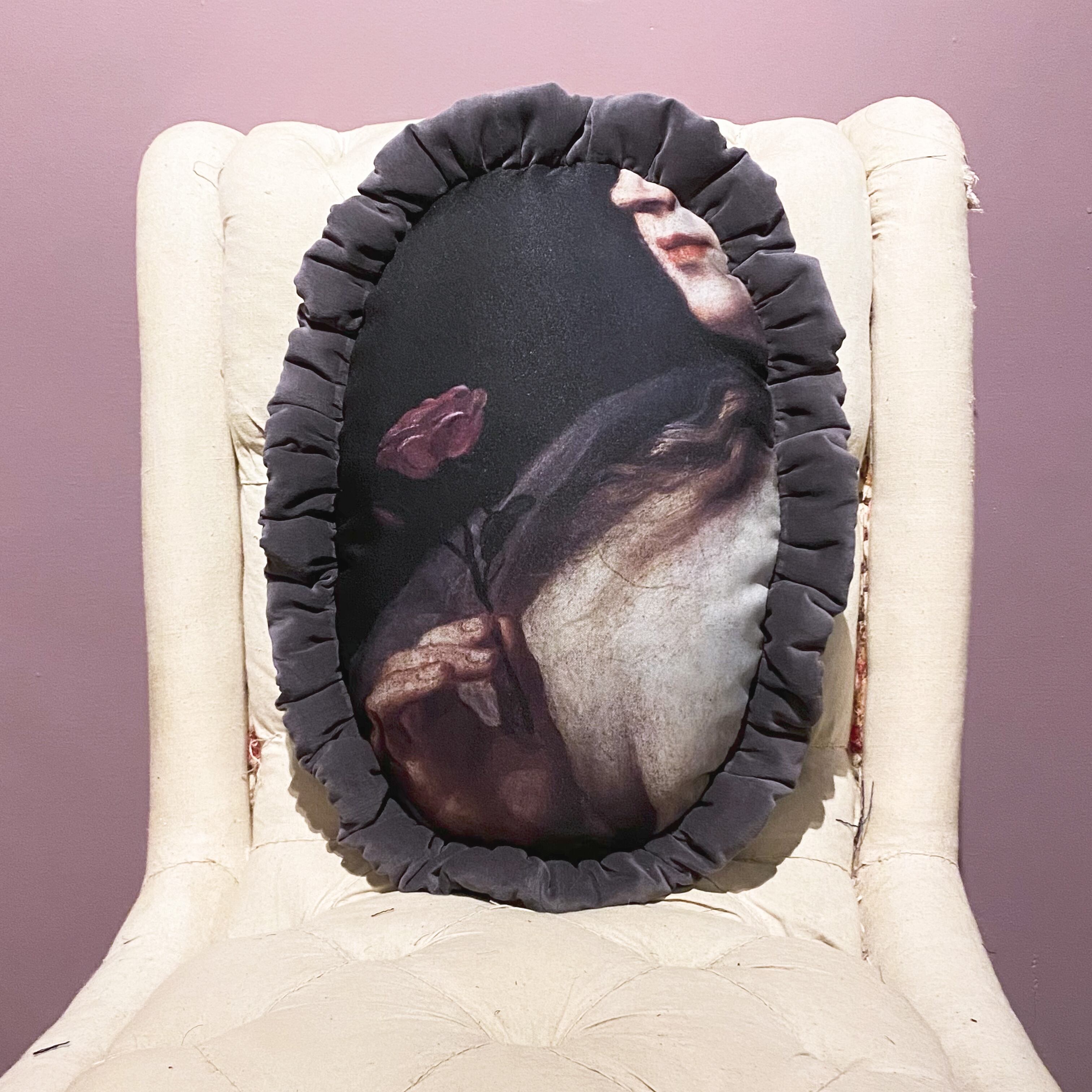 中世絵画をプリントした生地に、グレー色のコットンベロア生地で中綿入りフリルを付けました。