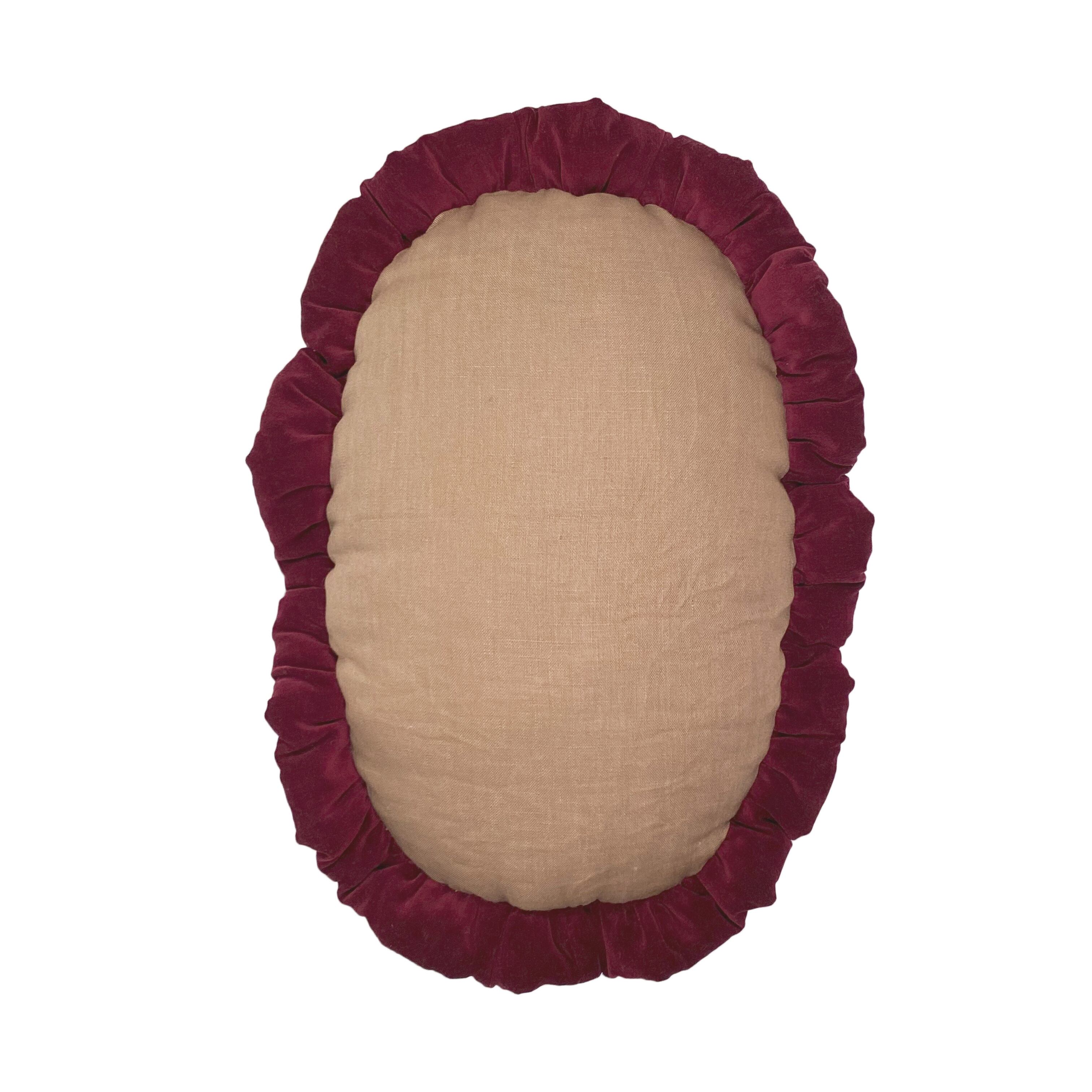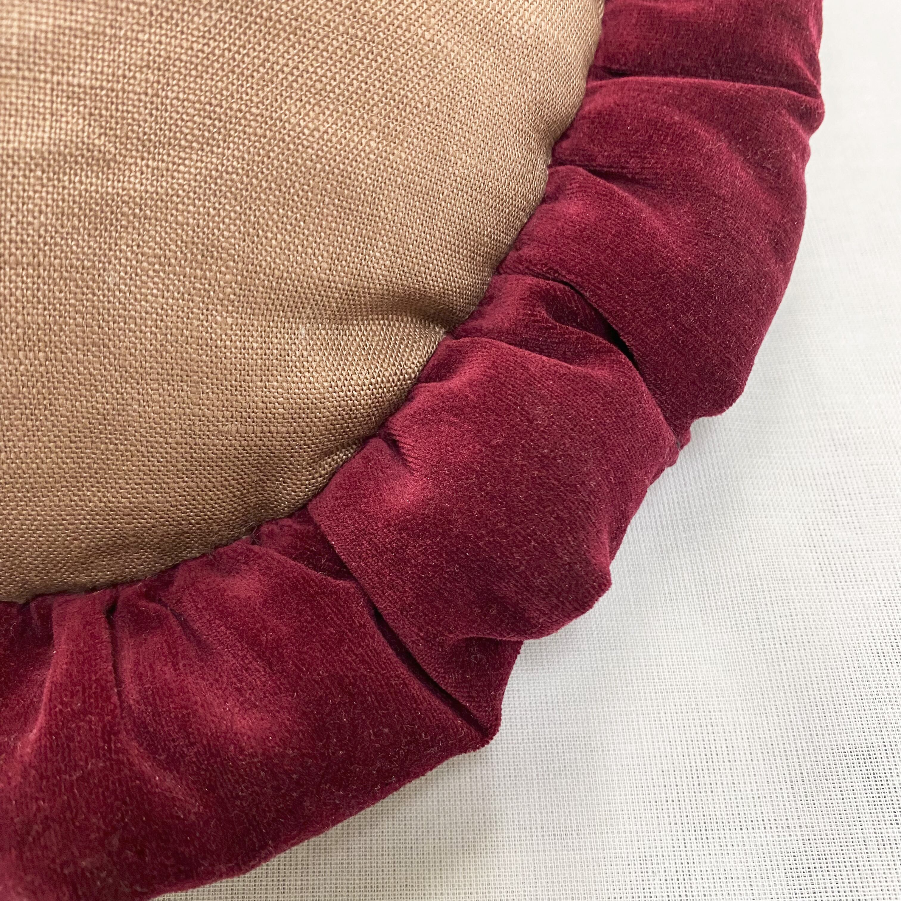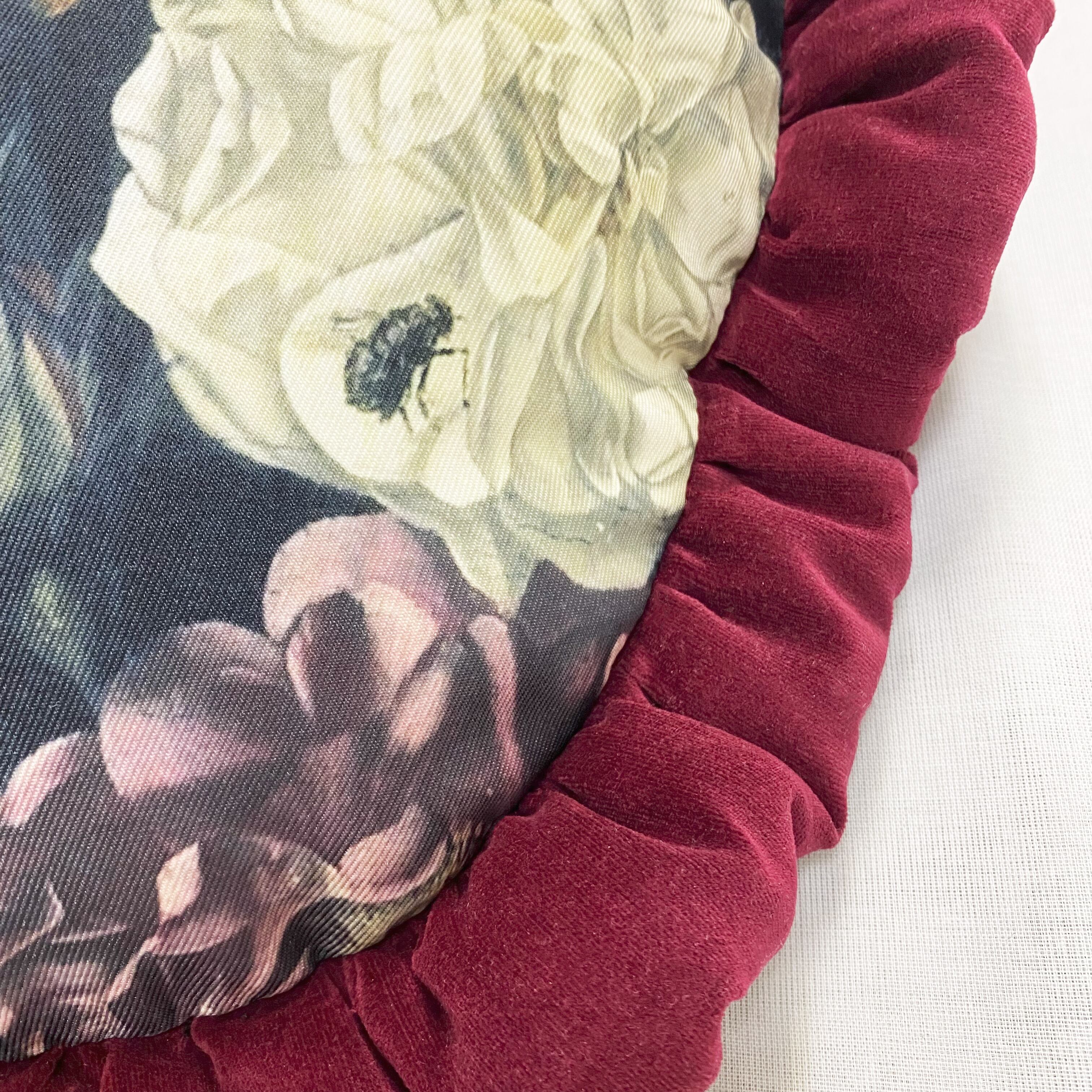 中世絵画をプリントした生地に、ボルドー色のコットンベロア生地で中綿入りフリルを付けました。