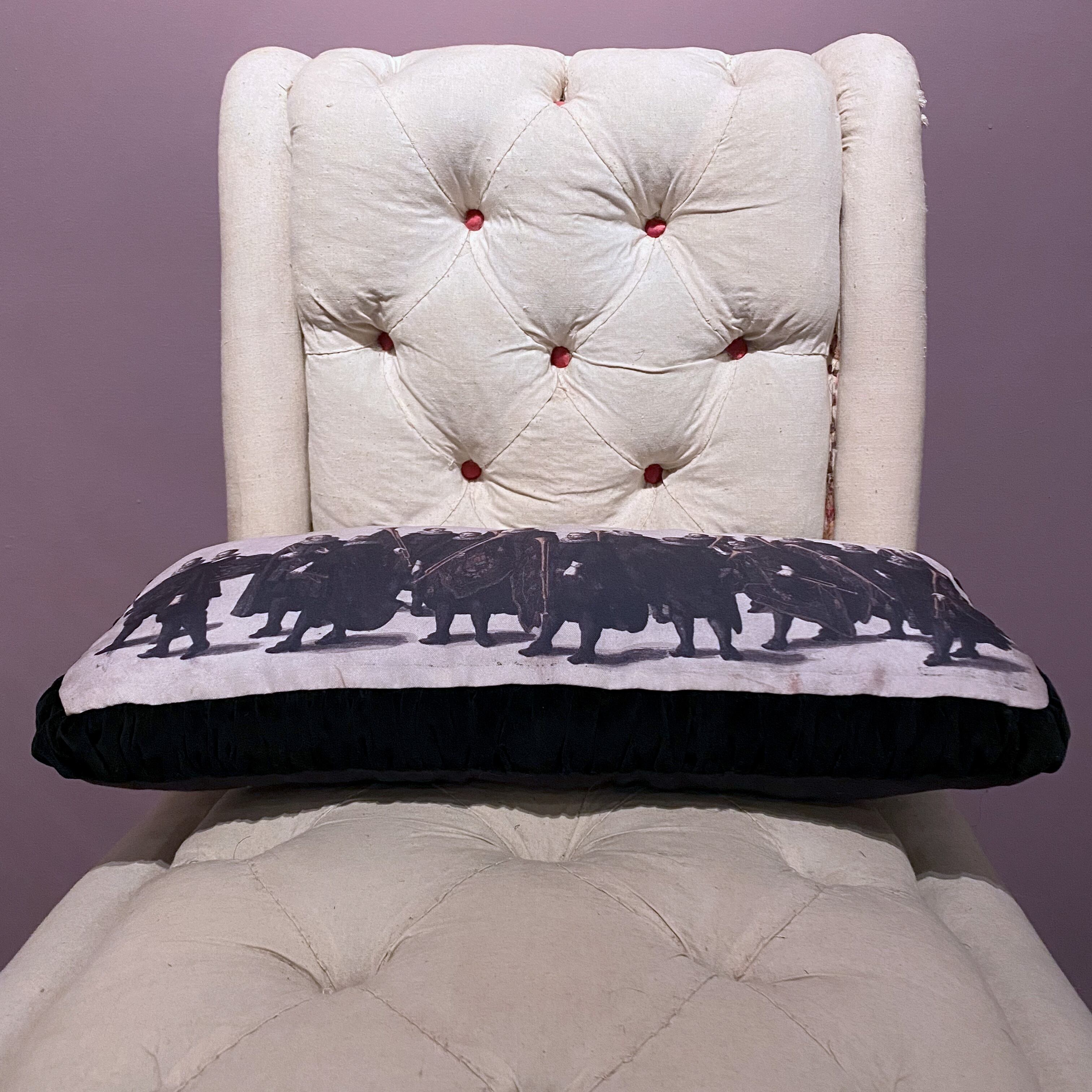 中世絵画をプリントした生地に、ブラックのコットンベロア生地でギャザーマチを付けました。