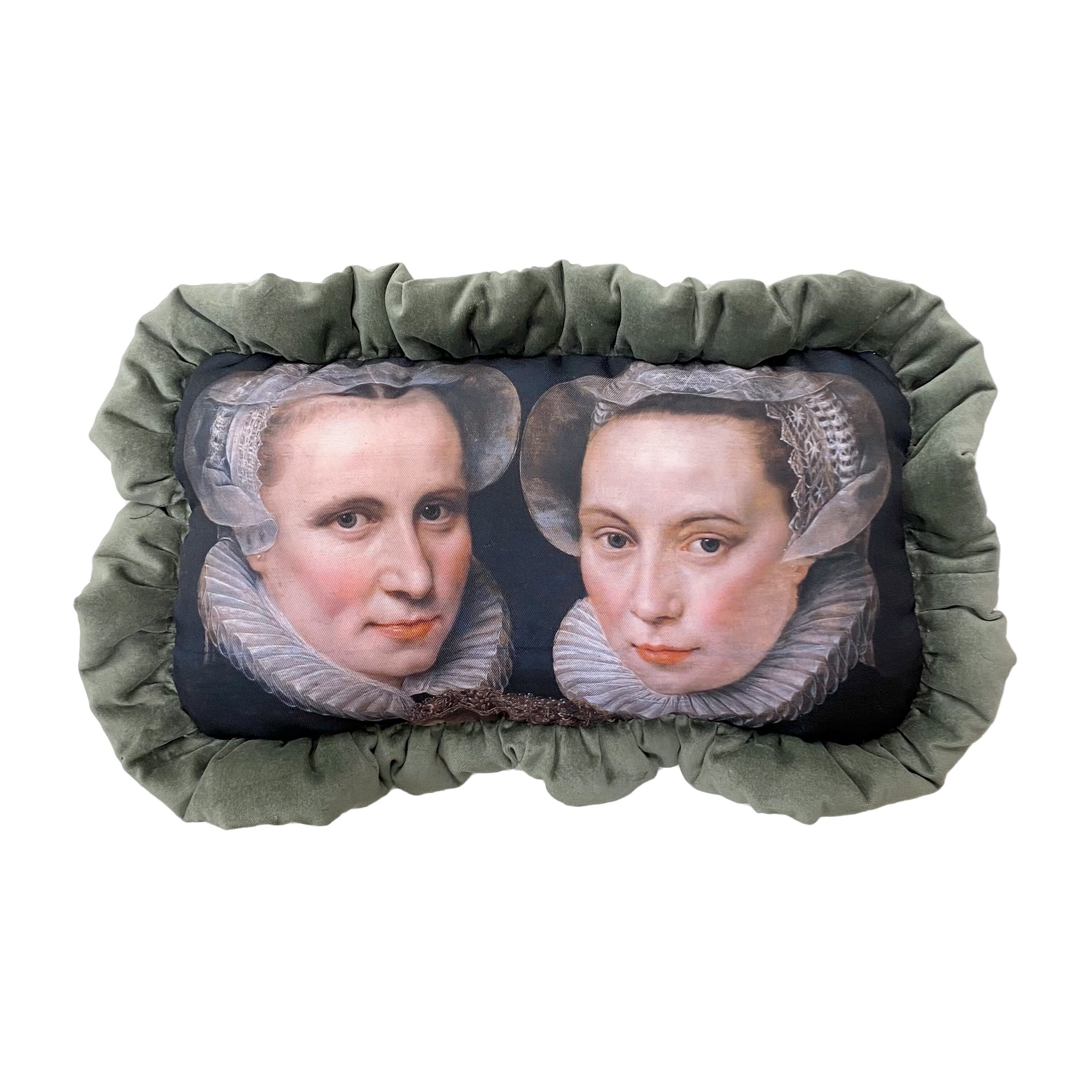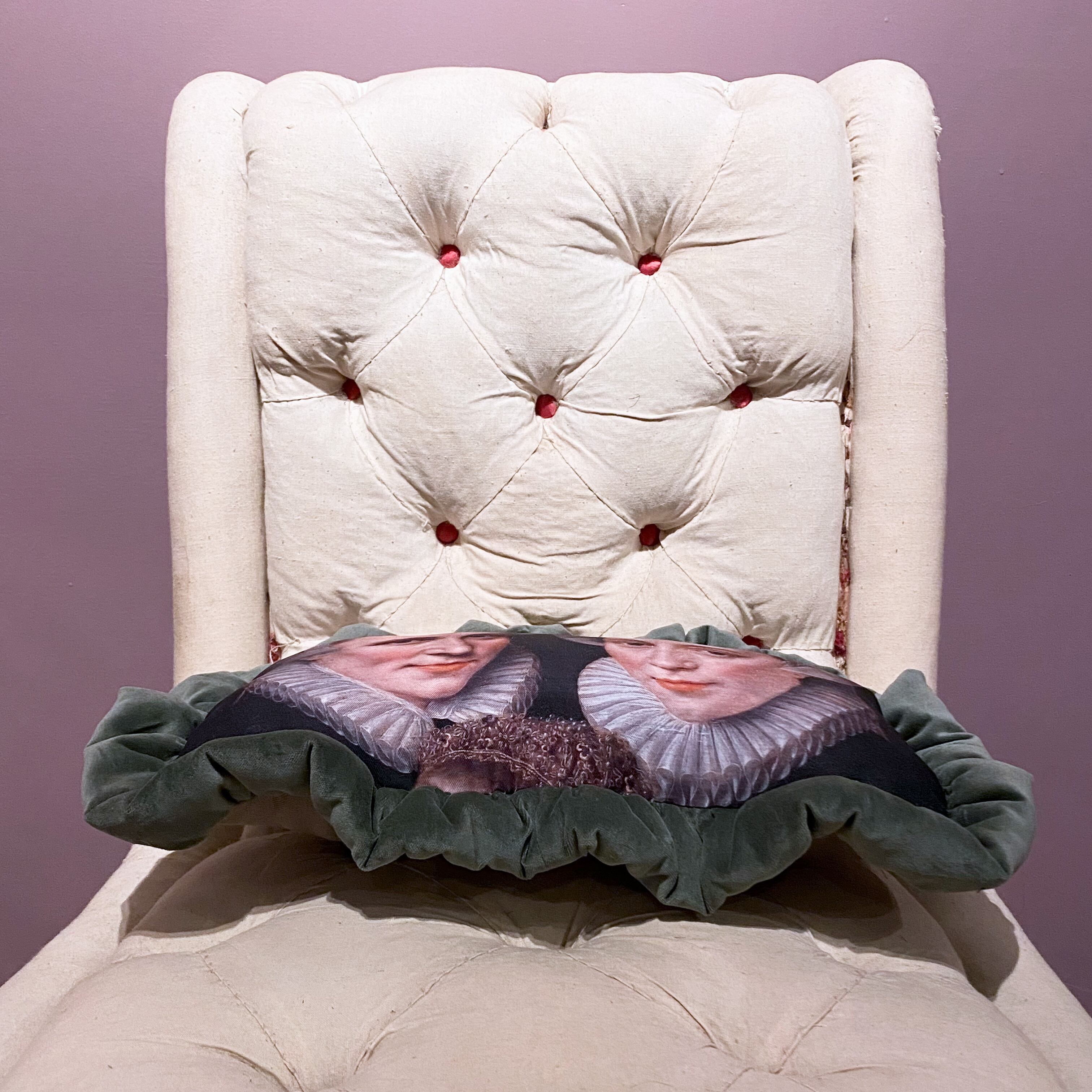 中世絵画をプリントした生地に、グレーグリーンのコットンベロア生地で中綿入りフリルを付けました。