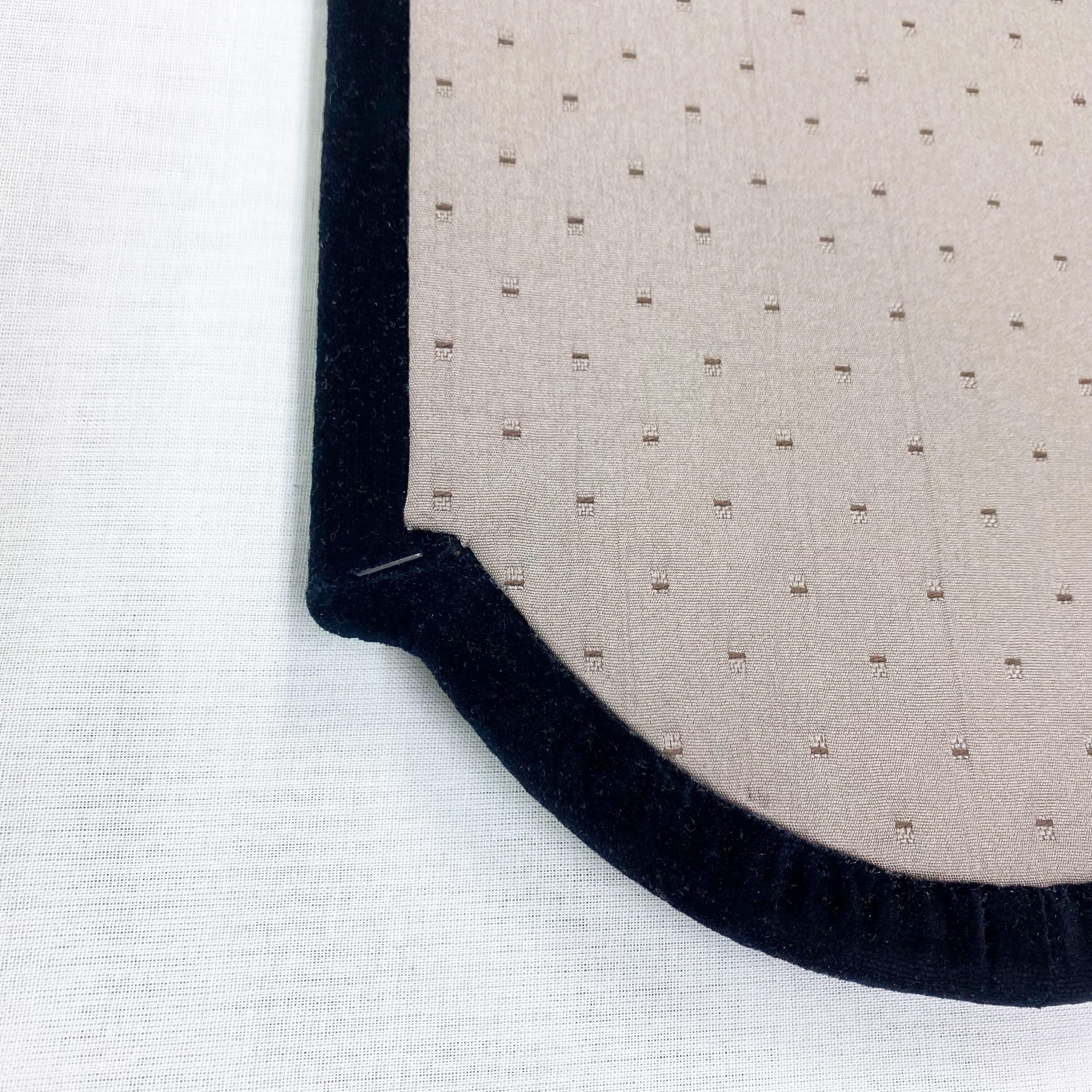 表は中世絵画をプリントした生地、縁はブラックのコットンベロア生地を使っています。