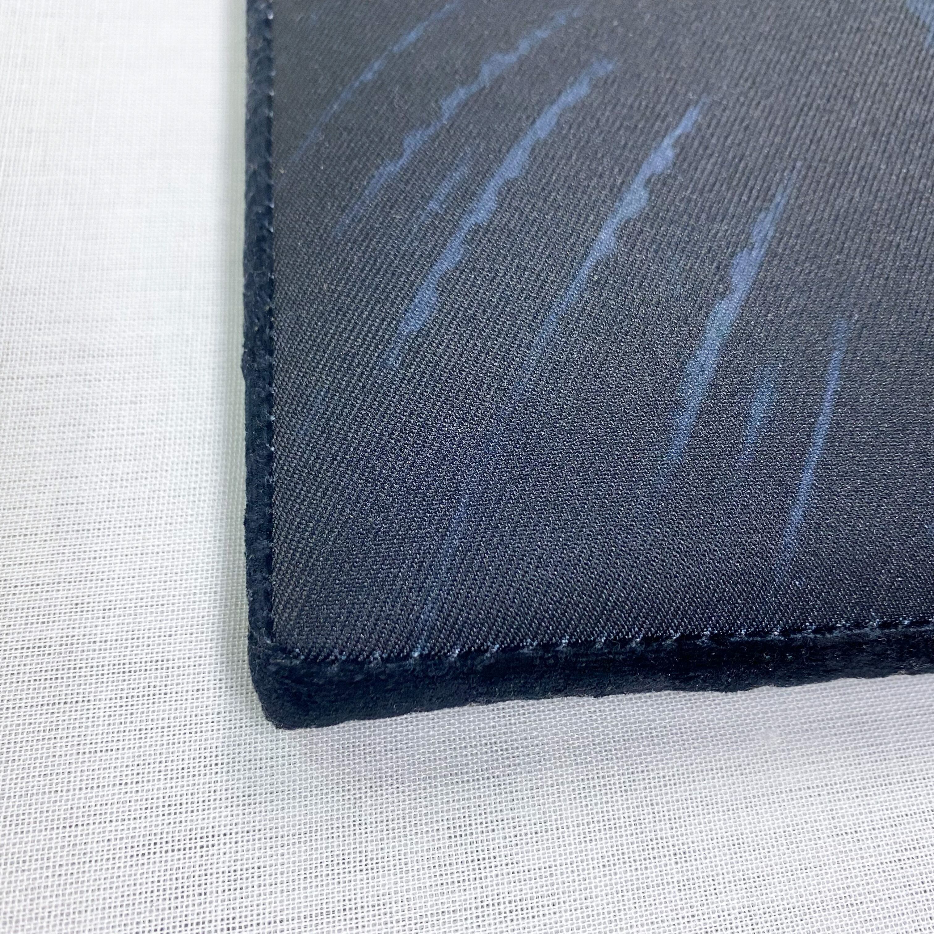 表は中世の絵画をプリントした生地、縁はブラックのコットンベロア生地を使っています。