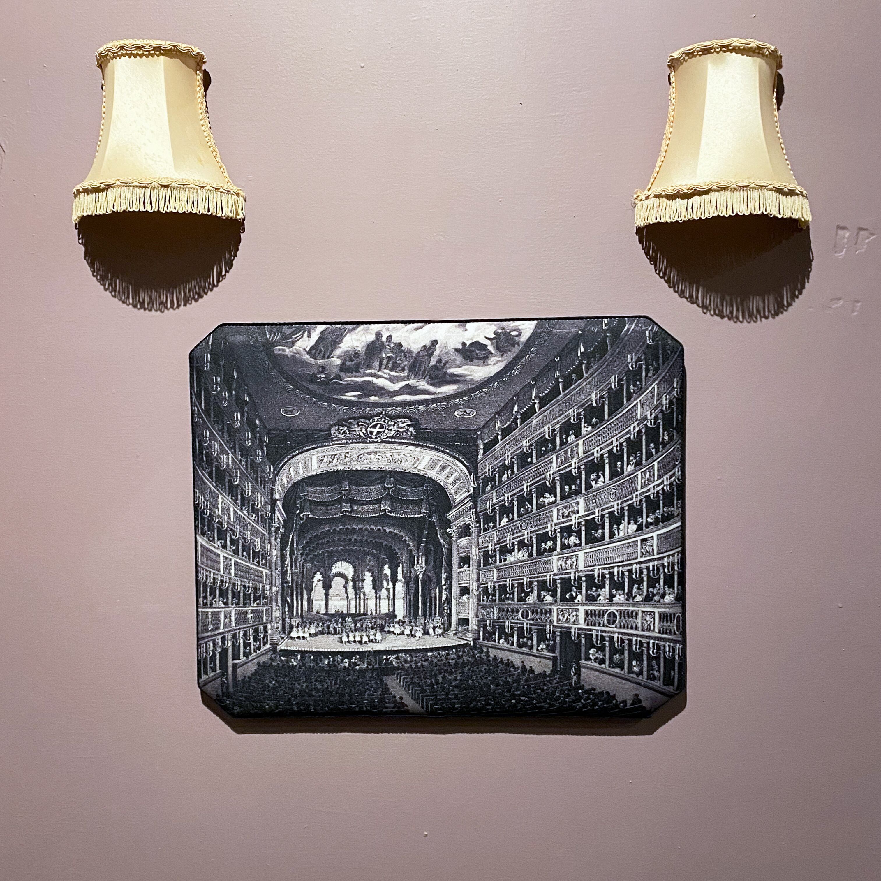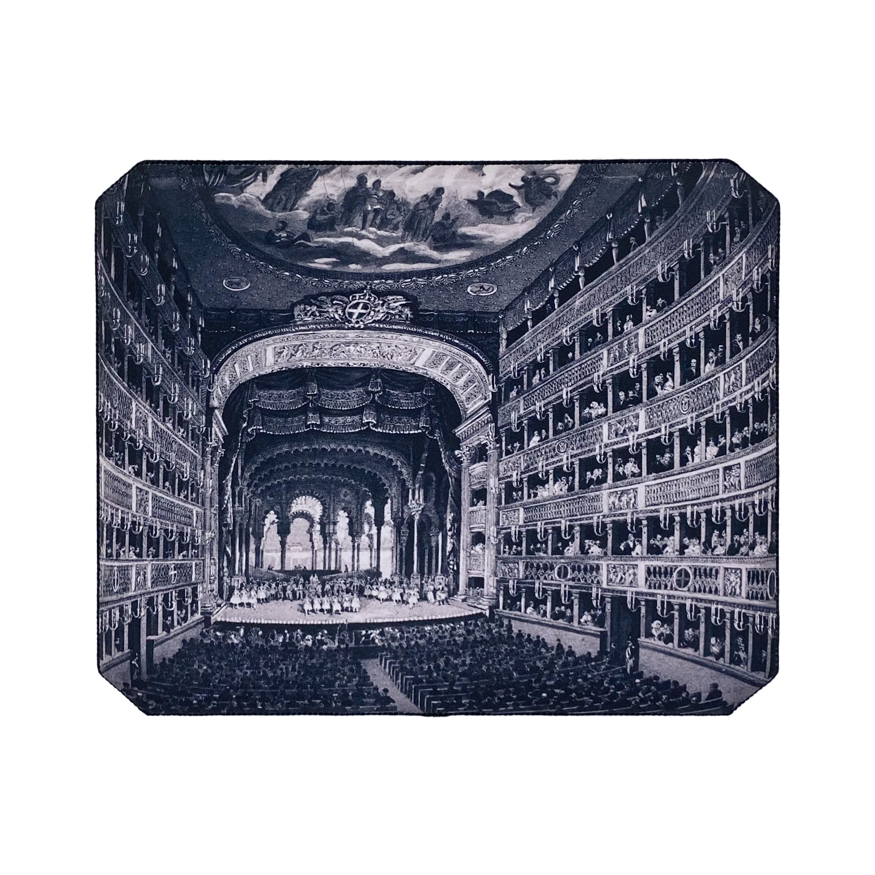 表は古い劇場の絵をプリントした生地、縁はブラックのコットンベロア生地を使っています。