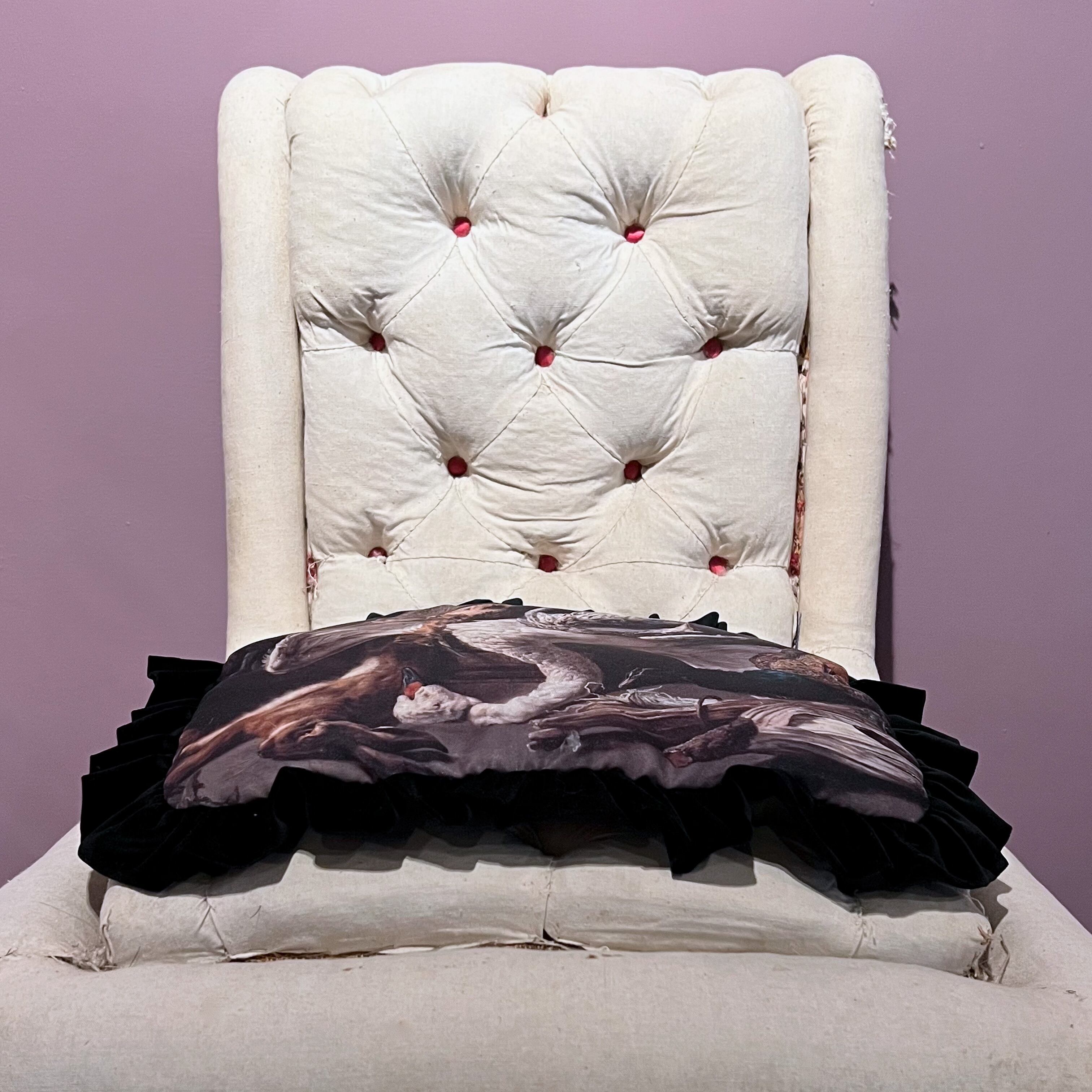 中世絵画をプリントした生地に、コットンベロアのフリルを付けました。
