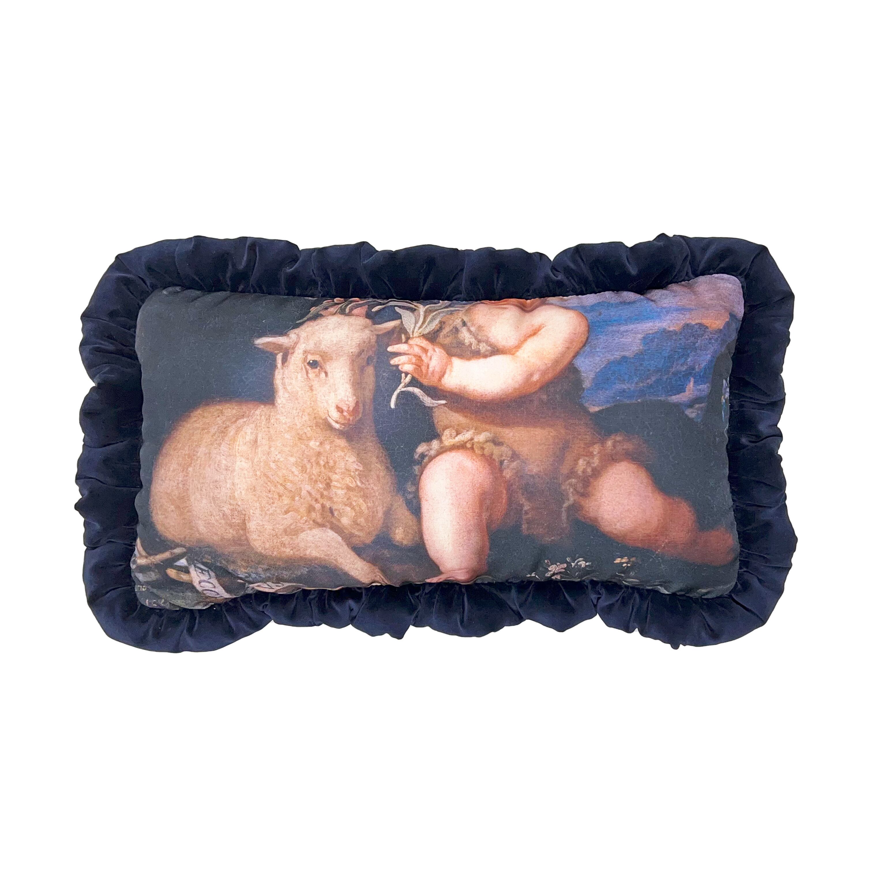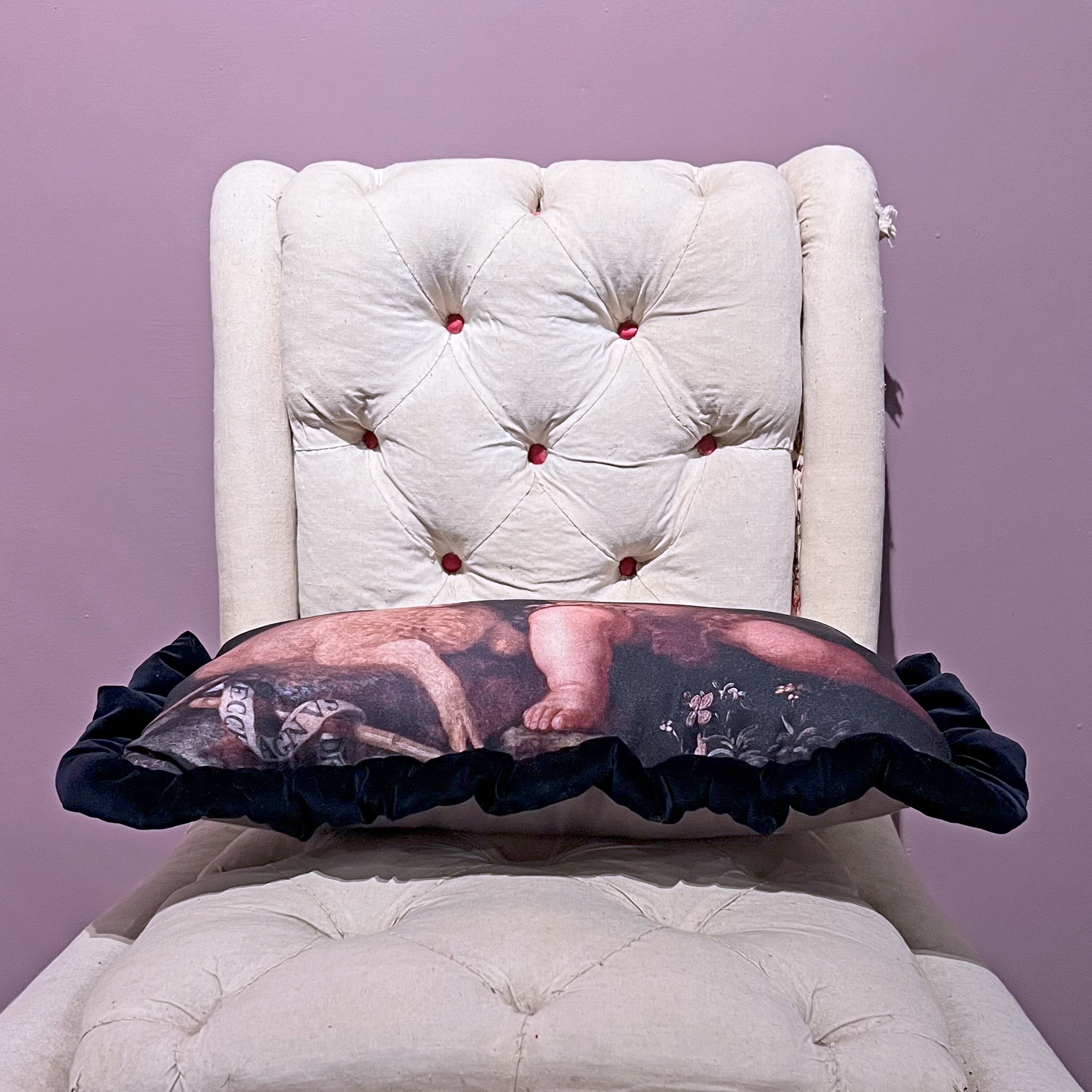 中世絵画をプリントした生地に、ダークネイビー色のコットンベロアでフリルを付けました。