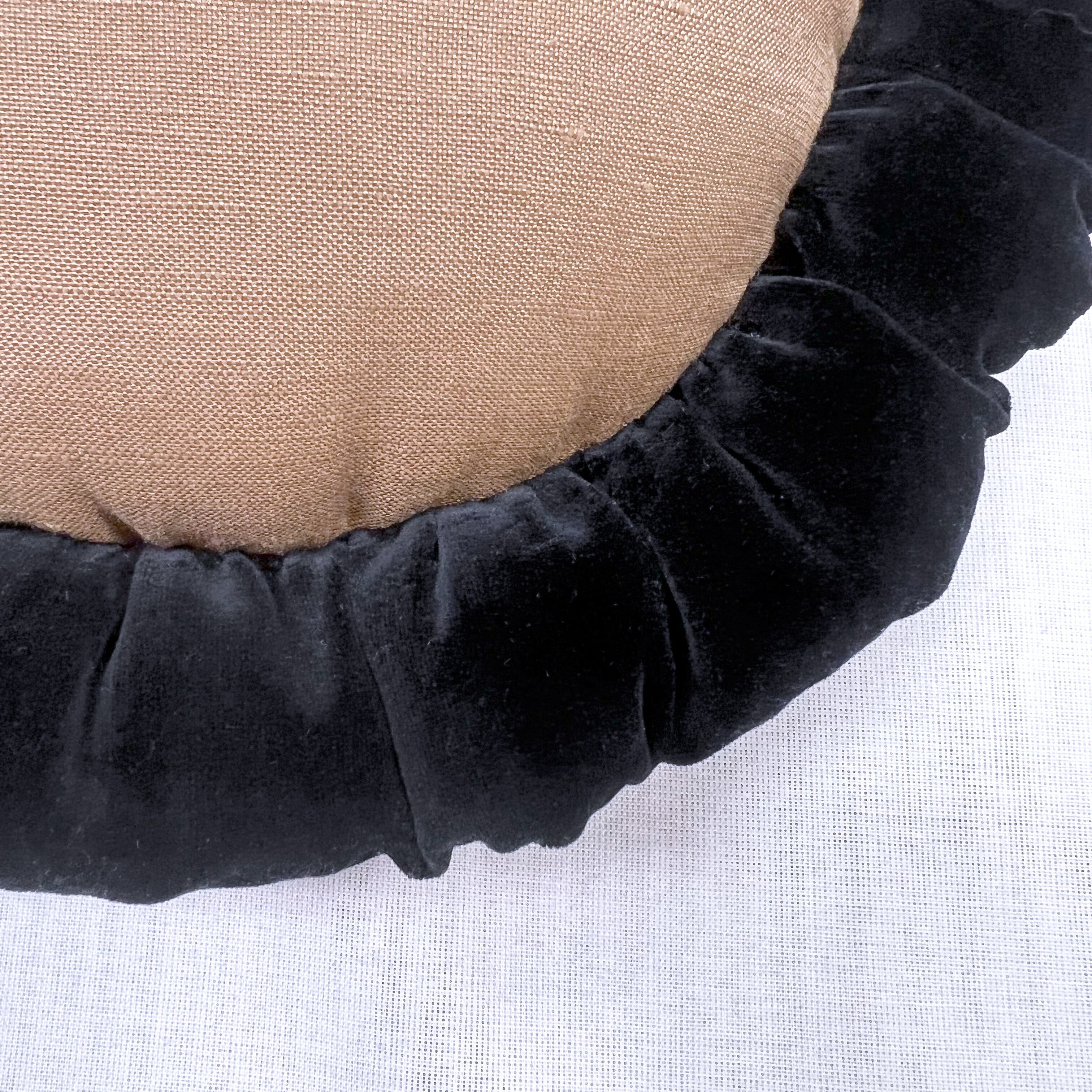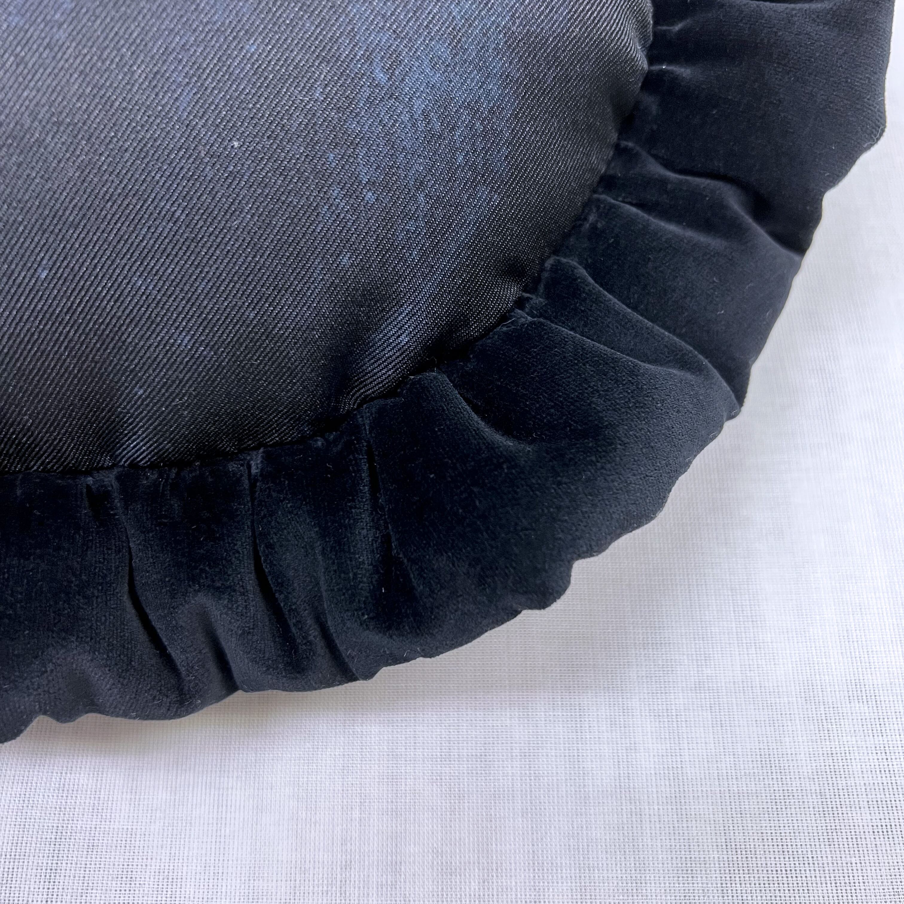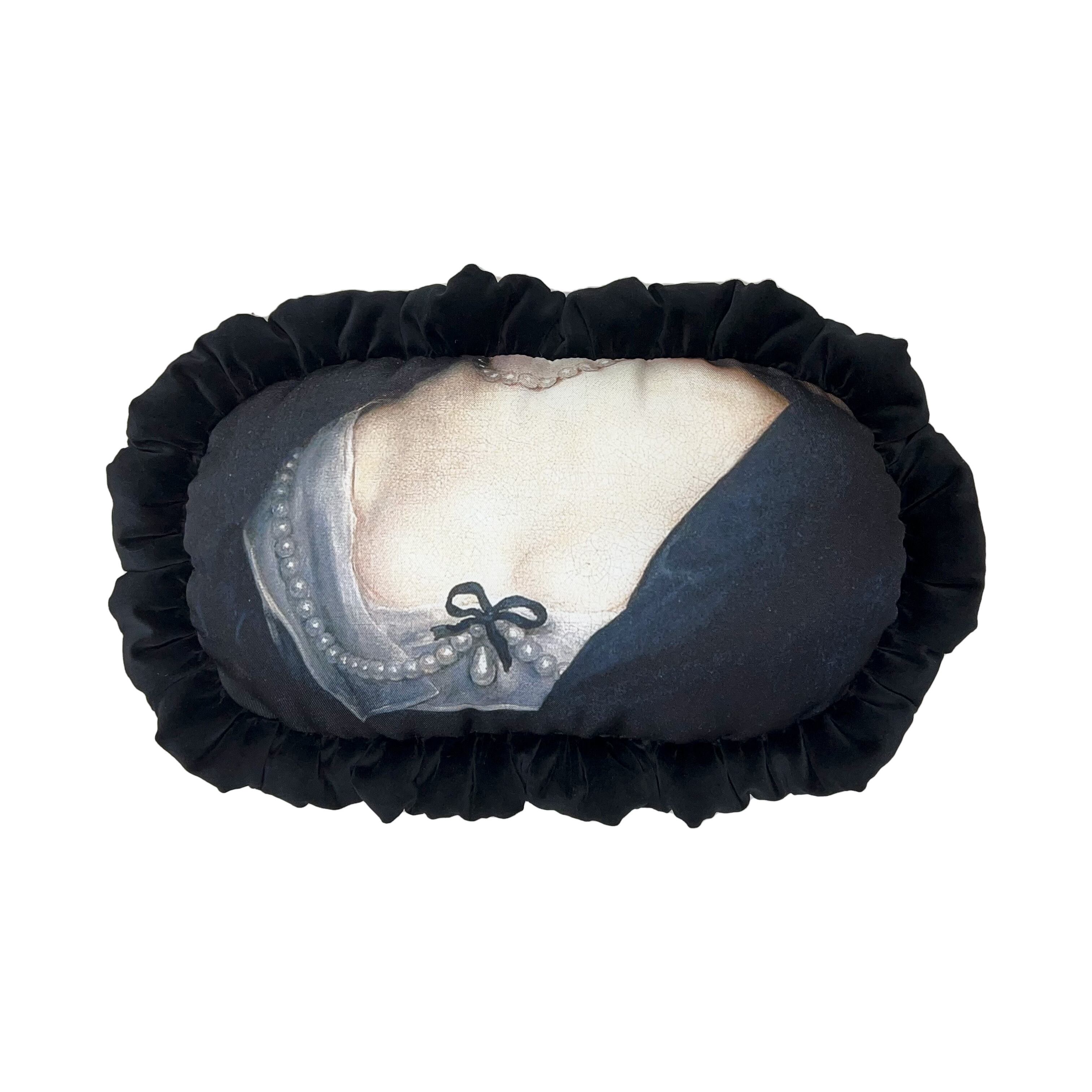中世絵画をプリントした生地に、ブラックのコットンベロア生地で中綿入りフリルを付けました。