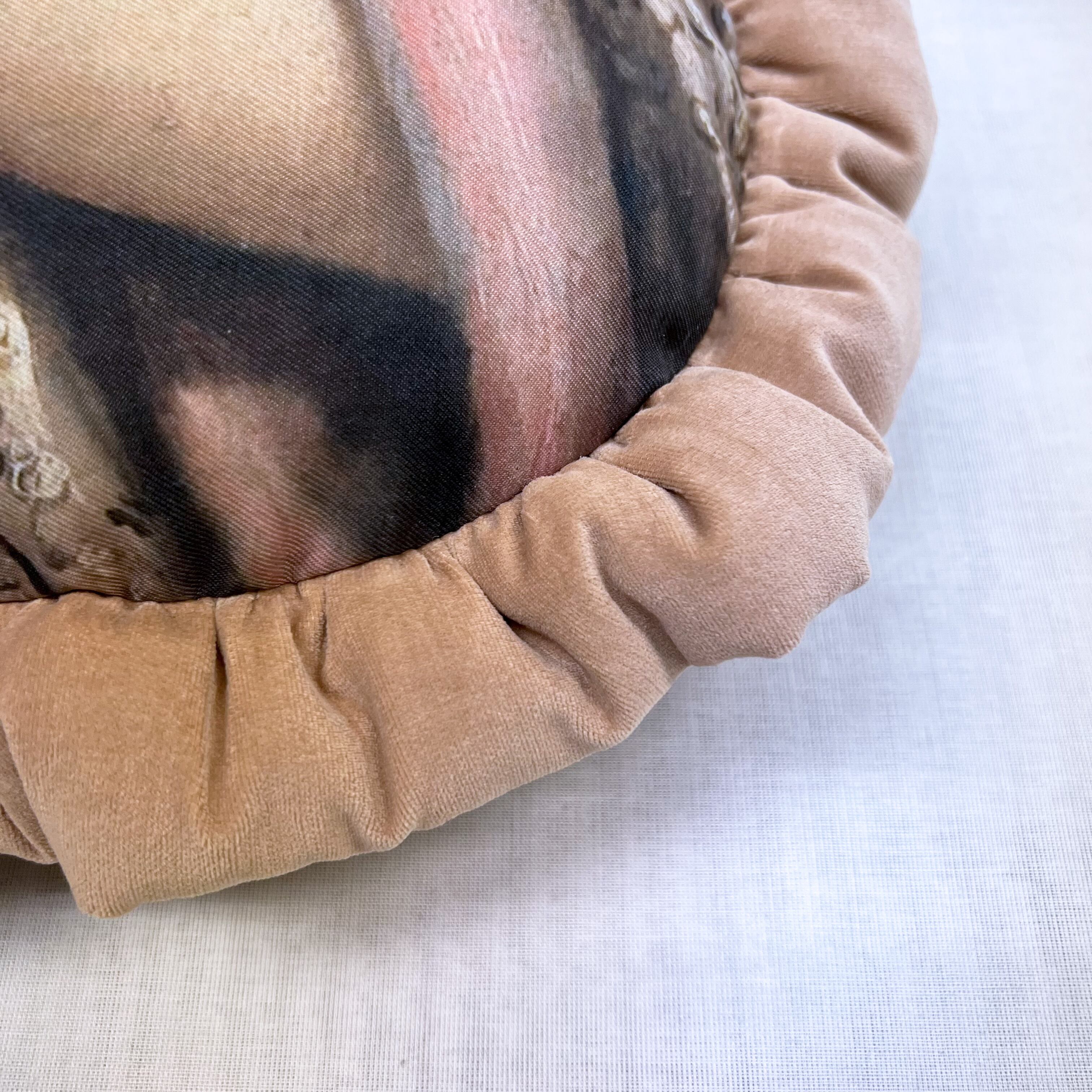 中世絵画をプリントした生地に、ピンクベージュのコットンベロア生地で中綿入りフリルを付けました。