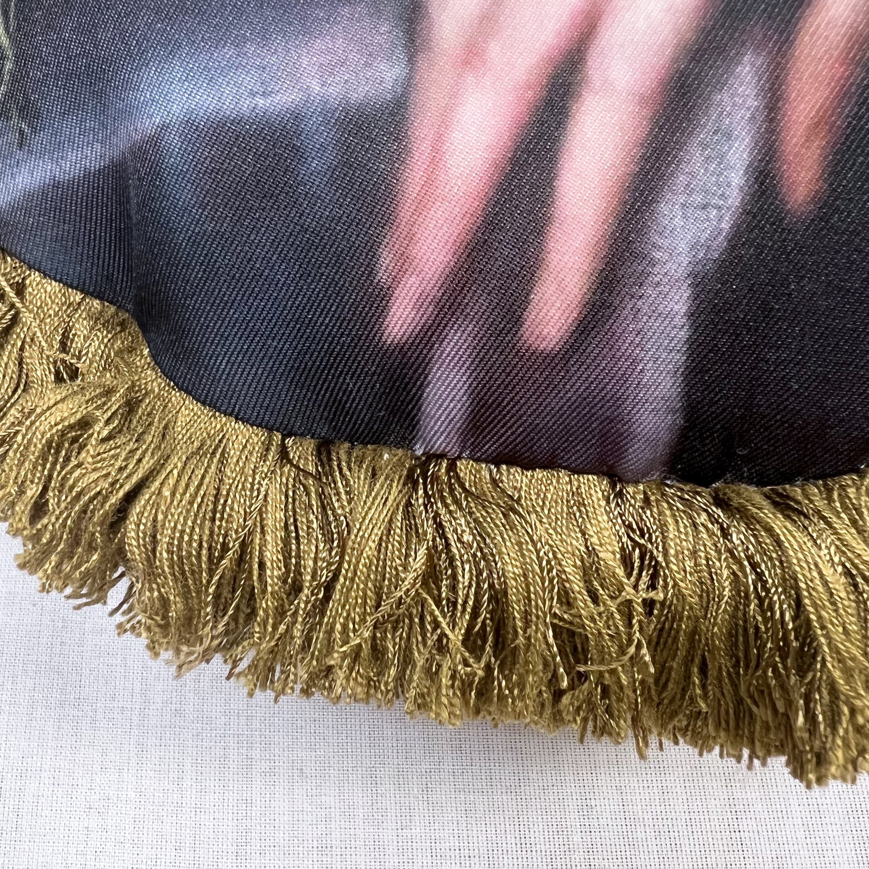 中世絵画をプリントした生地に、フランスのヴィンテージフリンジを付けました。