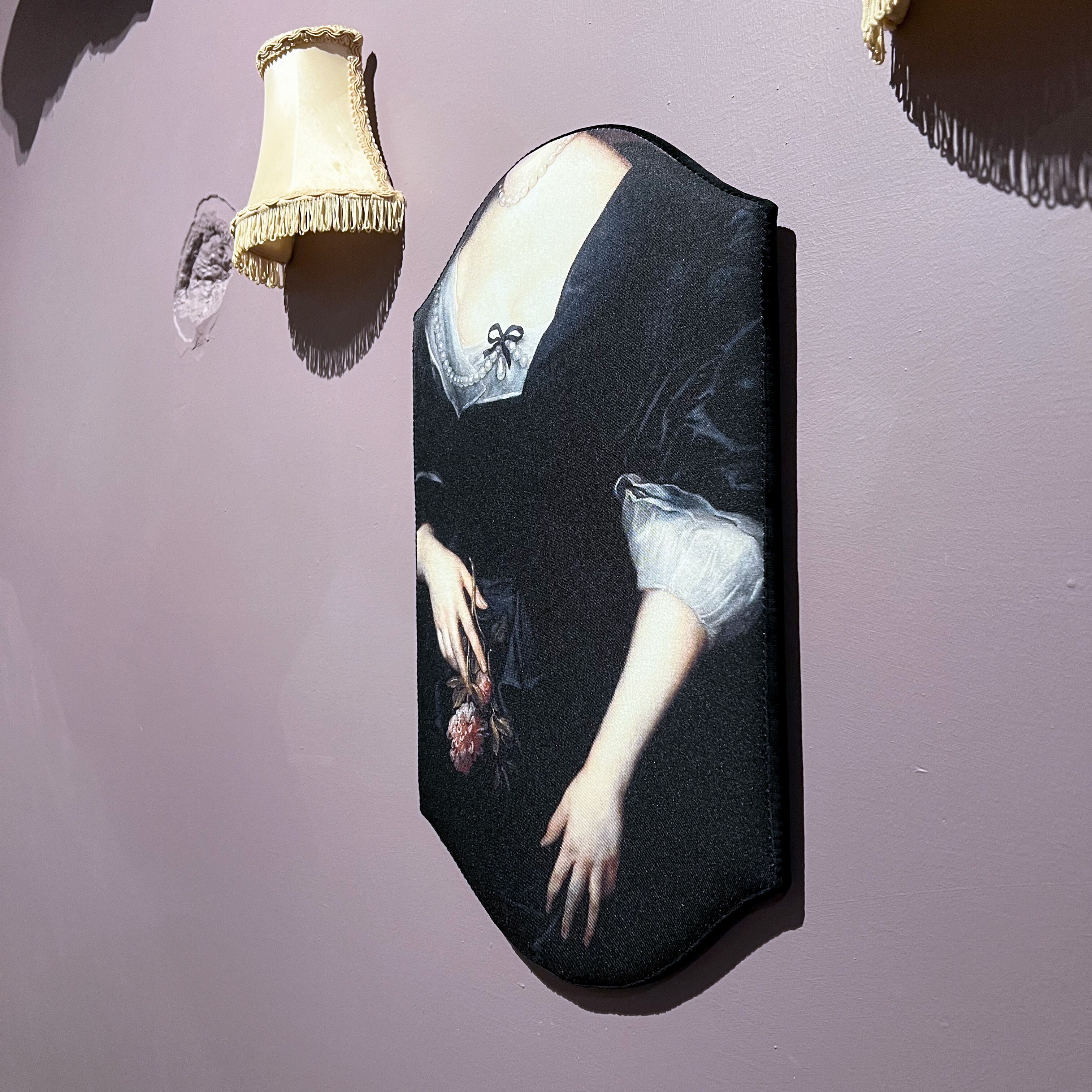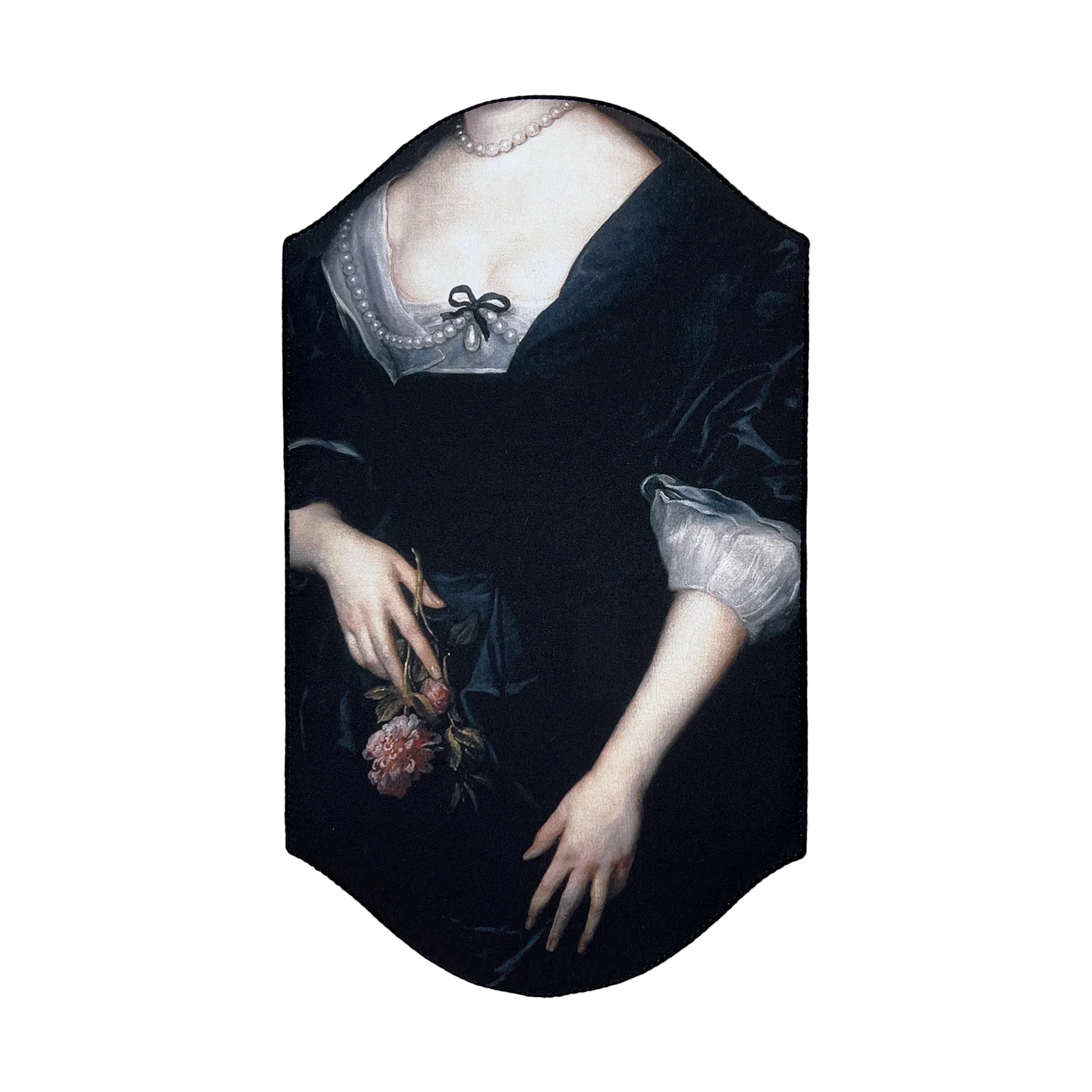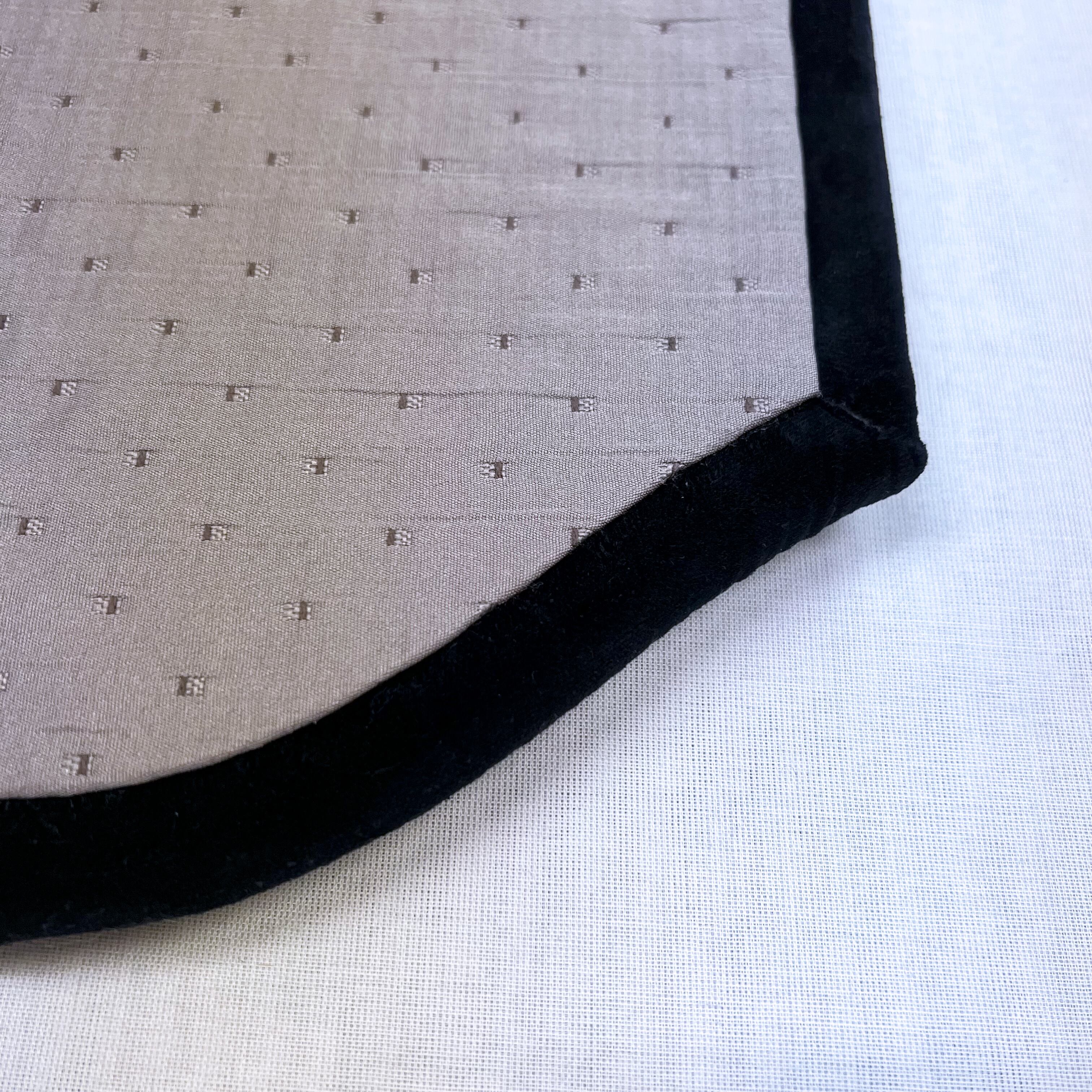 表は中世絵画をプリントした生地、縁はブラックのコットンベロア生地を使っています。