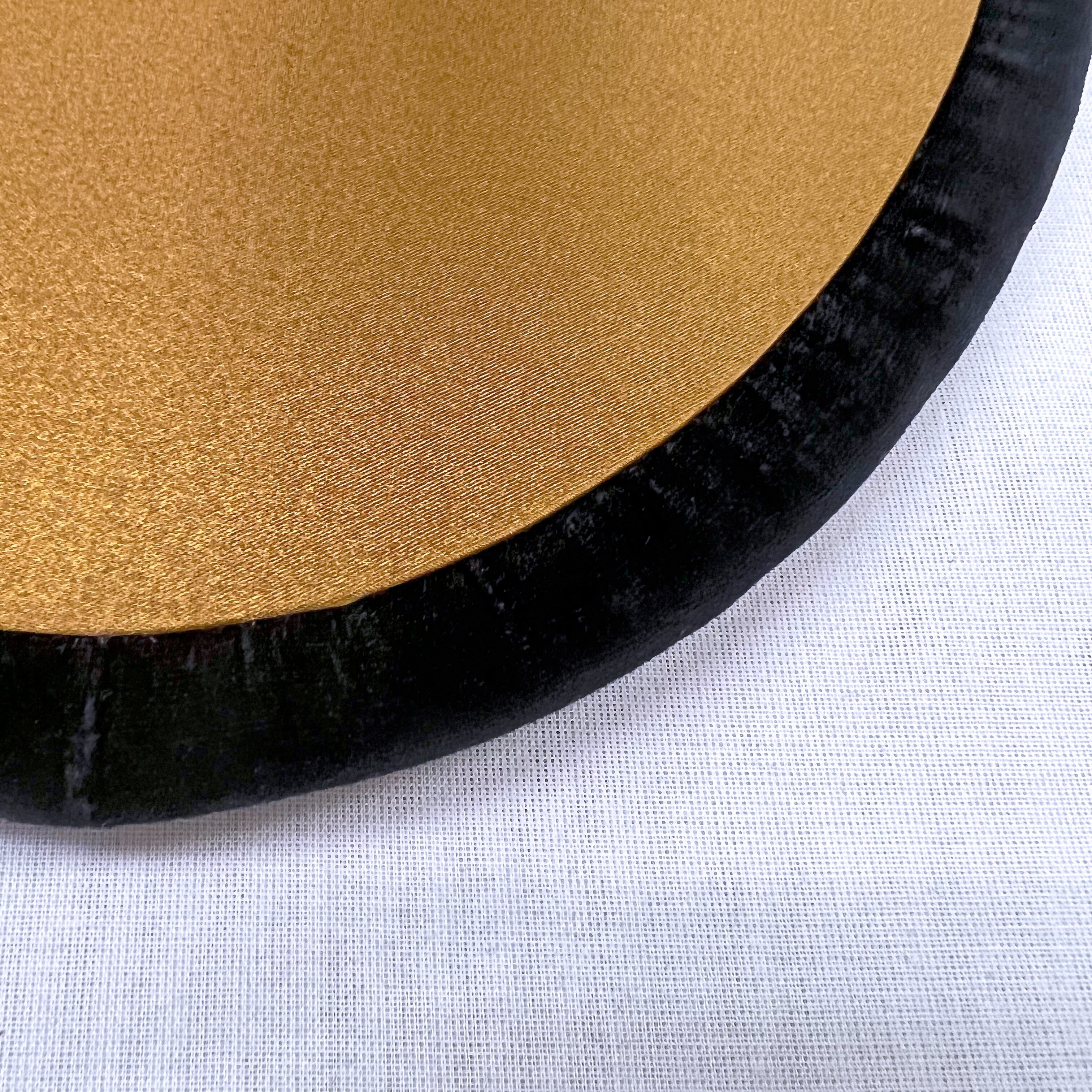 表は中世絵画をプリントした生地、縁はブラックのコットンベロア生地を使っています。