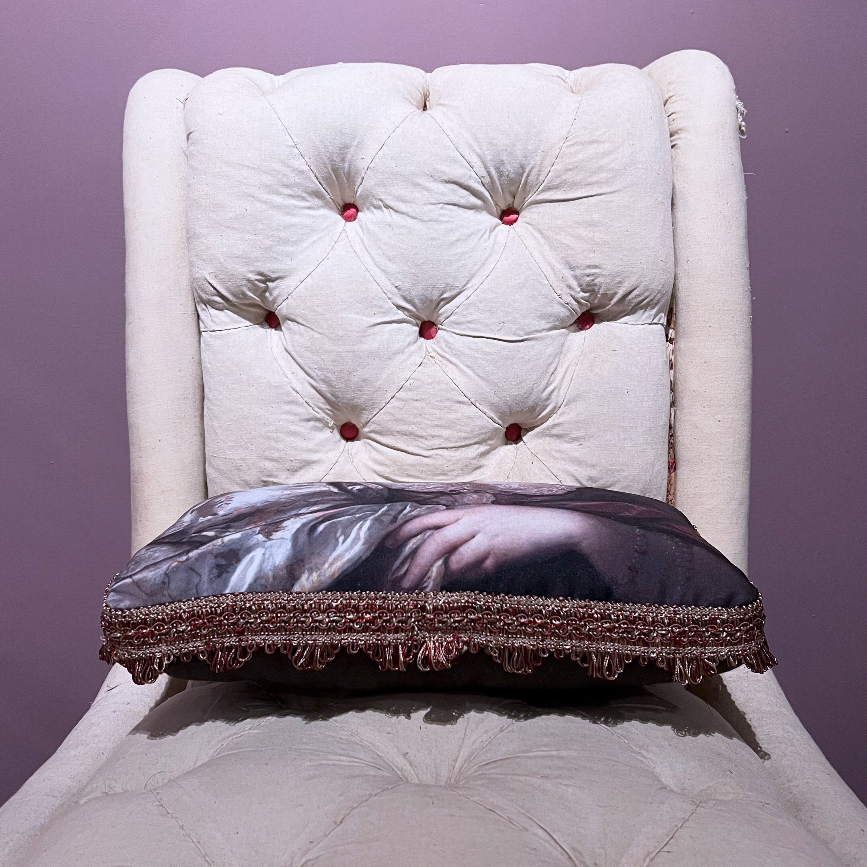 中世絵画をプリントした生地に、額縁のようなブレードを付けました。