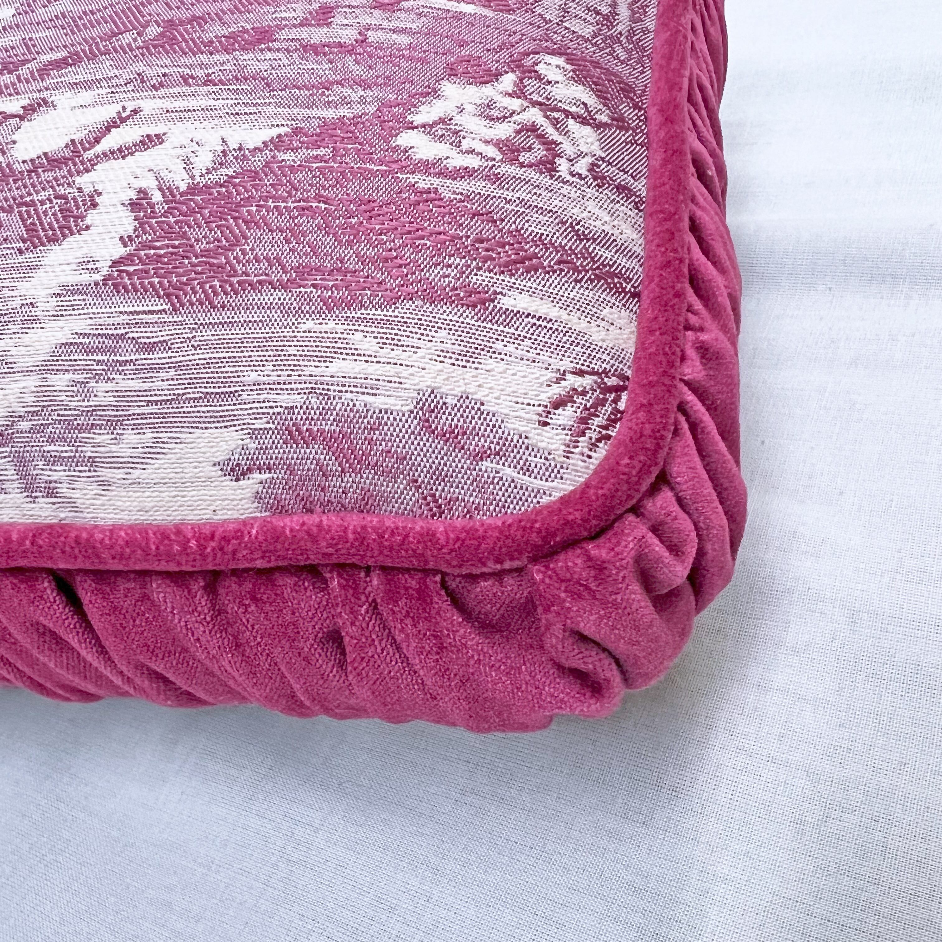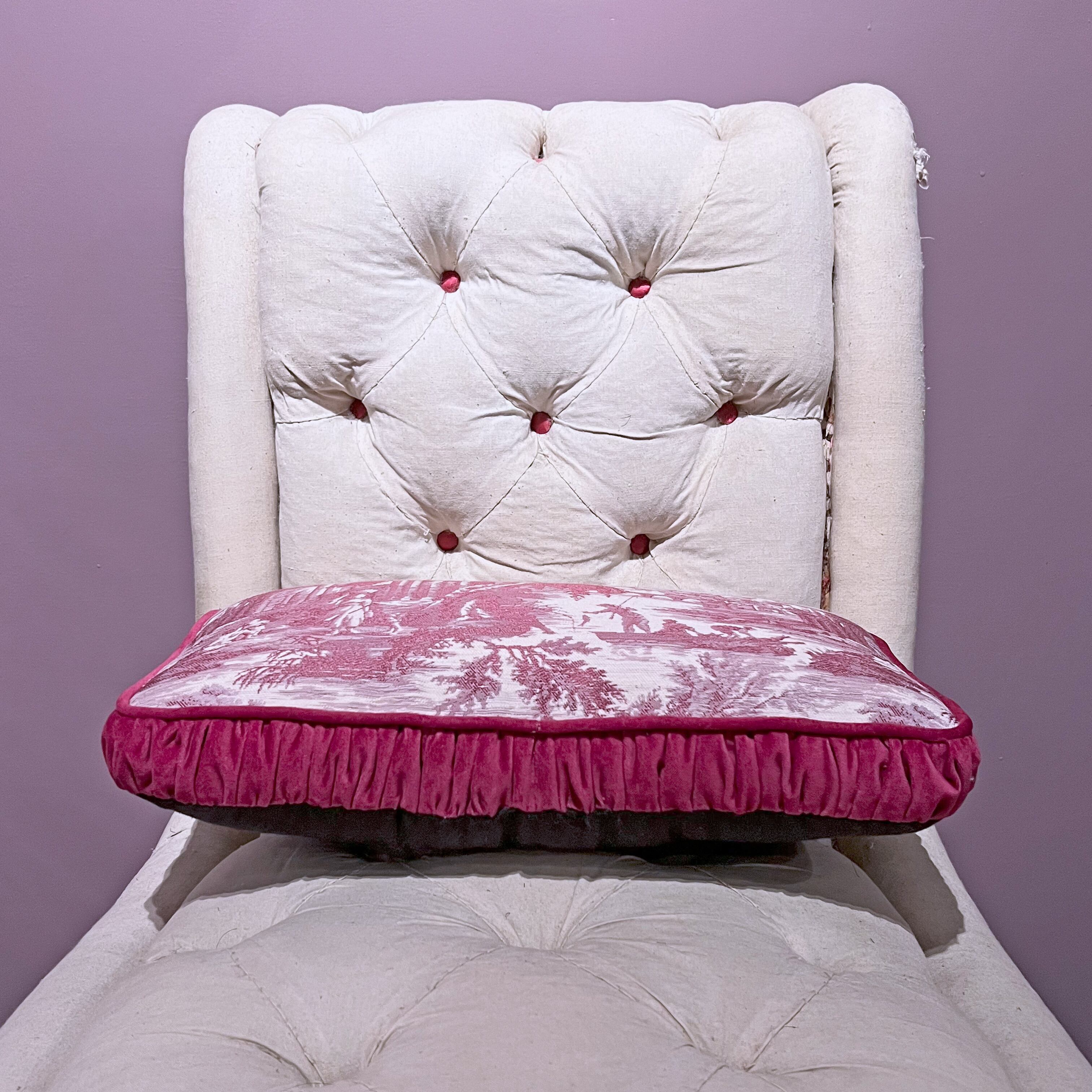 トルコから取り寄せためずらしいジャガード織りのトワルドジュイ生地に、コットンベロア生地のパイピングとギャザーマチを付けました。