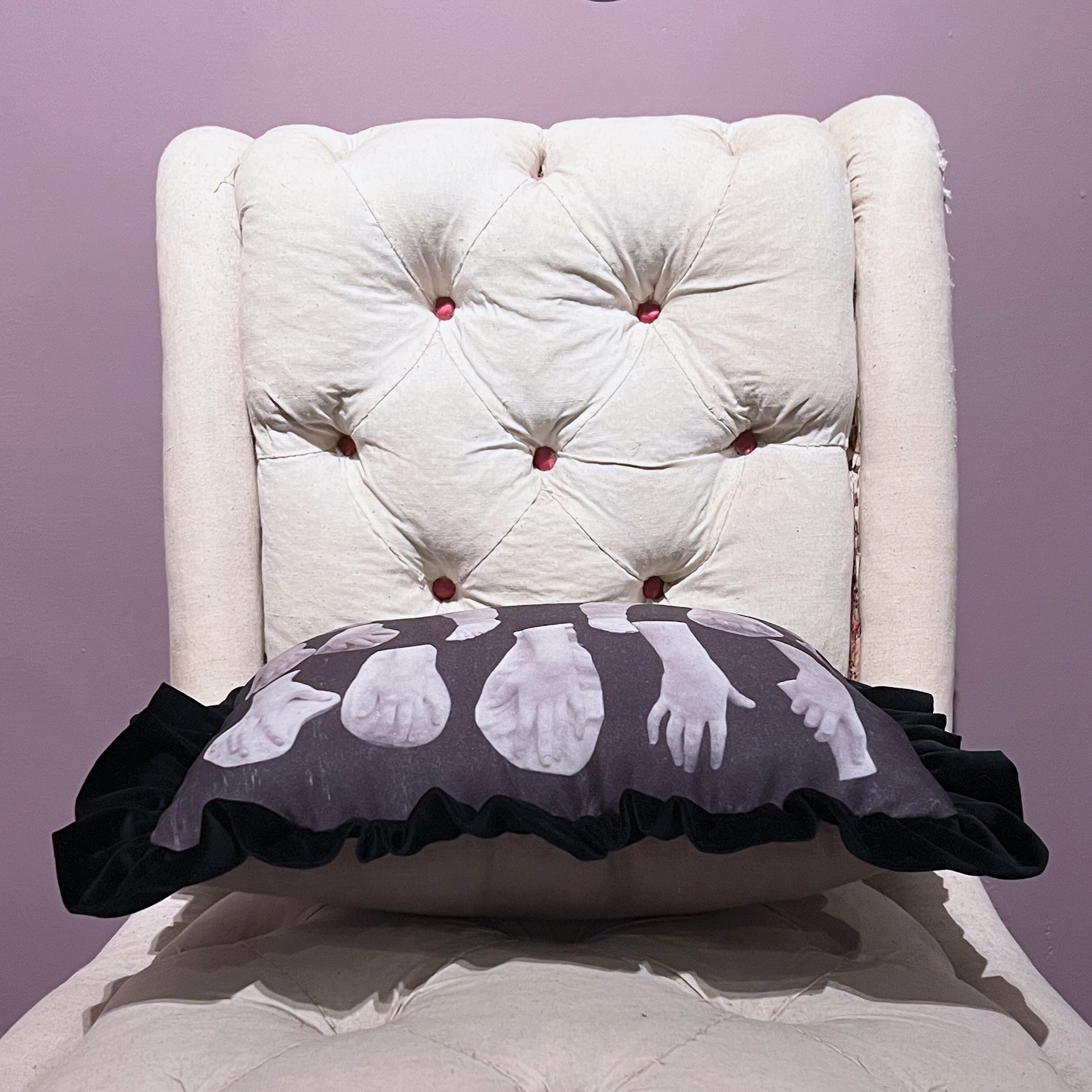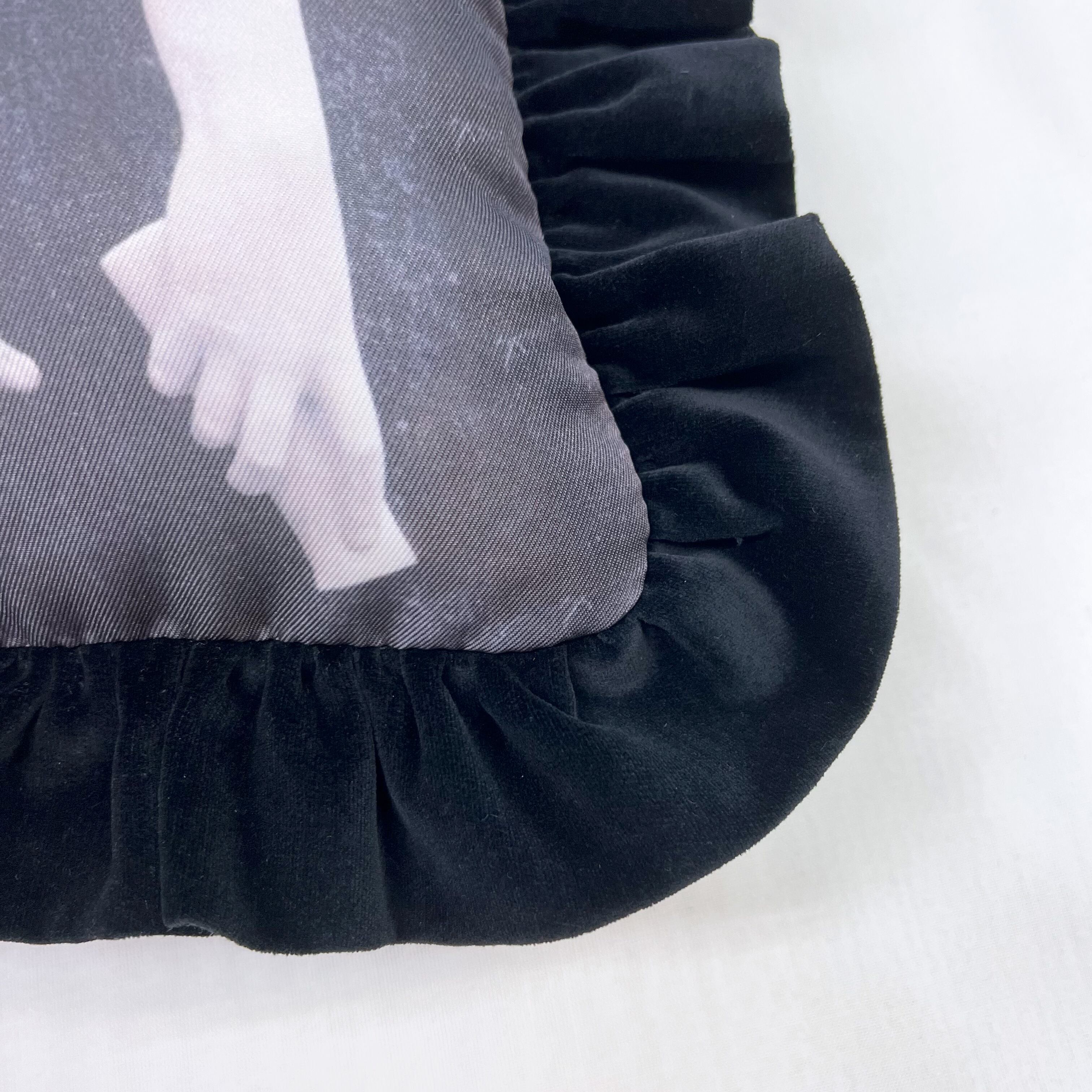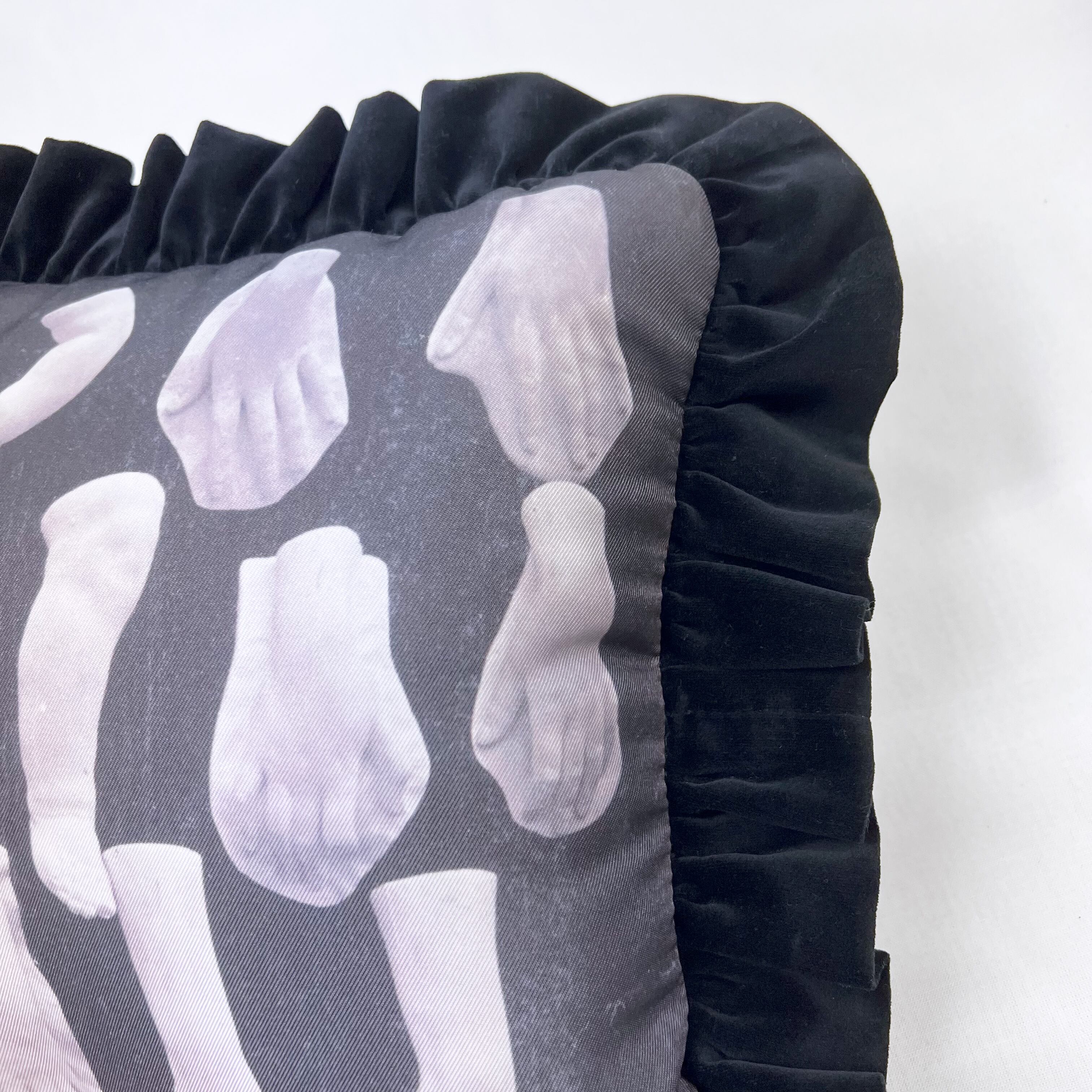 1800年代の石膏模型写真図録に収録された手足の彫刻の石膏模型をプリントした生地に、黒のコットンベロアでフリルを付けました。