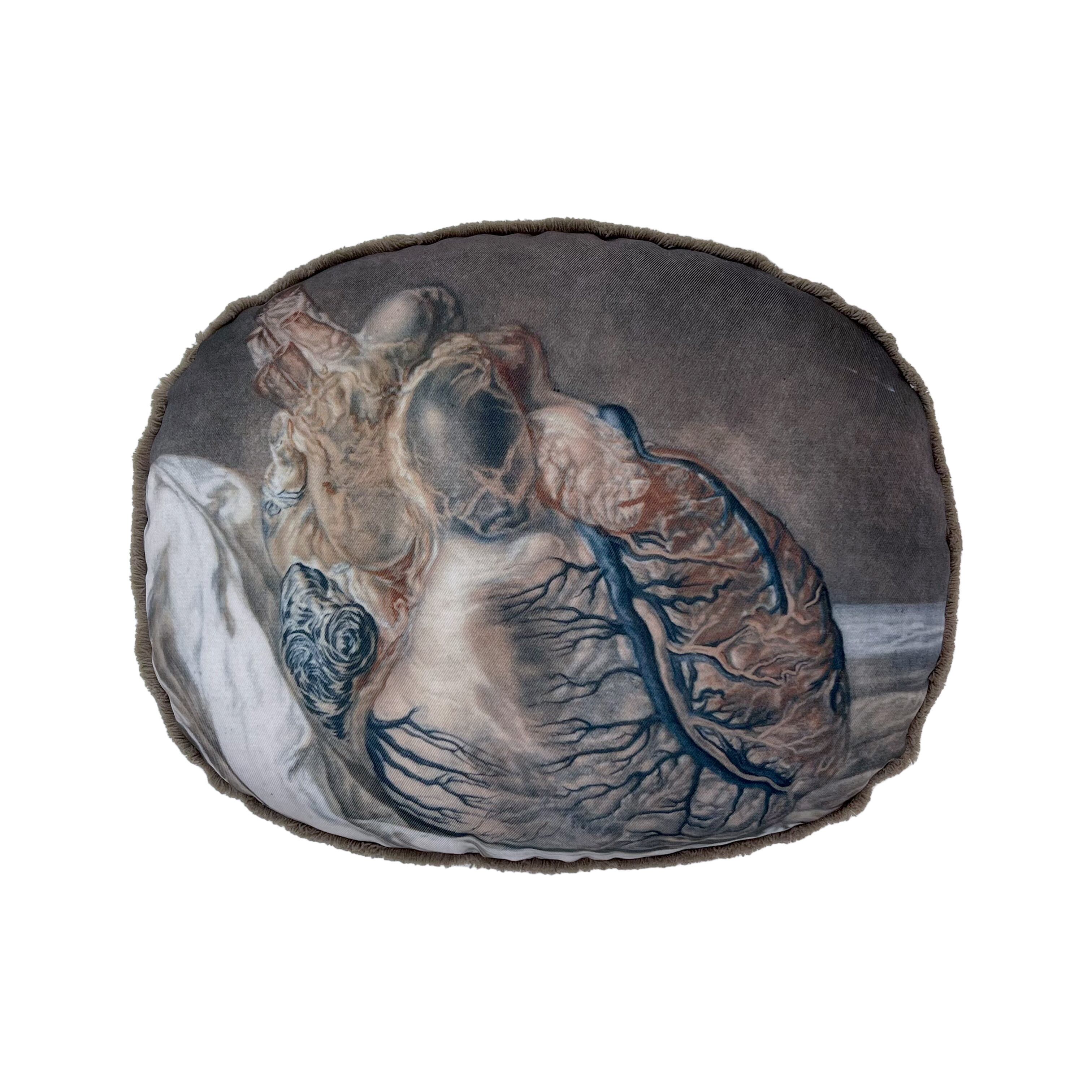 古い博物画の心臓をプリントした生地に、グレージュ色のフリンジを付けました。