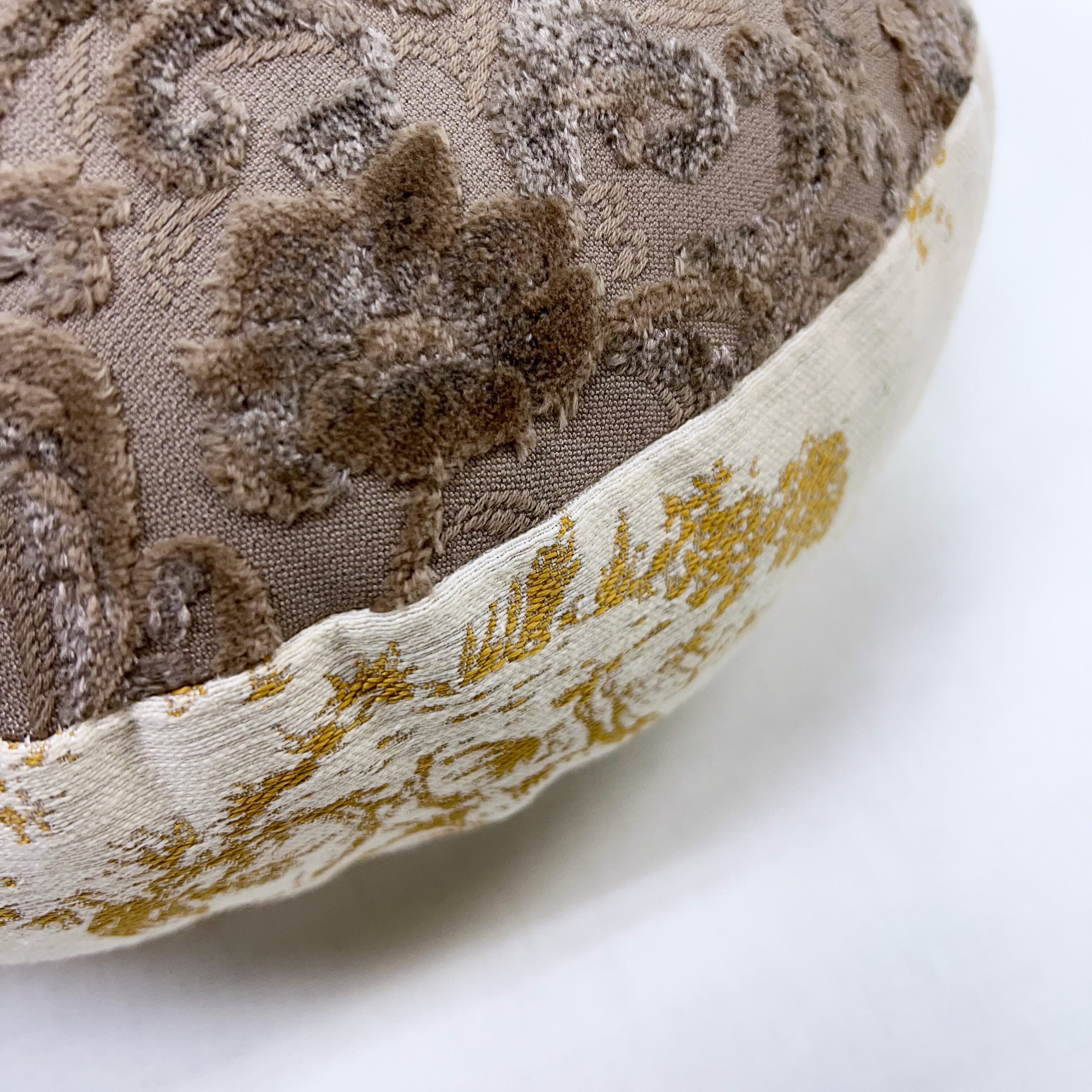 表面はオリジナルプリントの生地、裏面の生地とブレードは端切れやヴィンテージのものなど製作する際にアトリエにあるものや大切にコレクションしている材料を組み合わせて作っています。