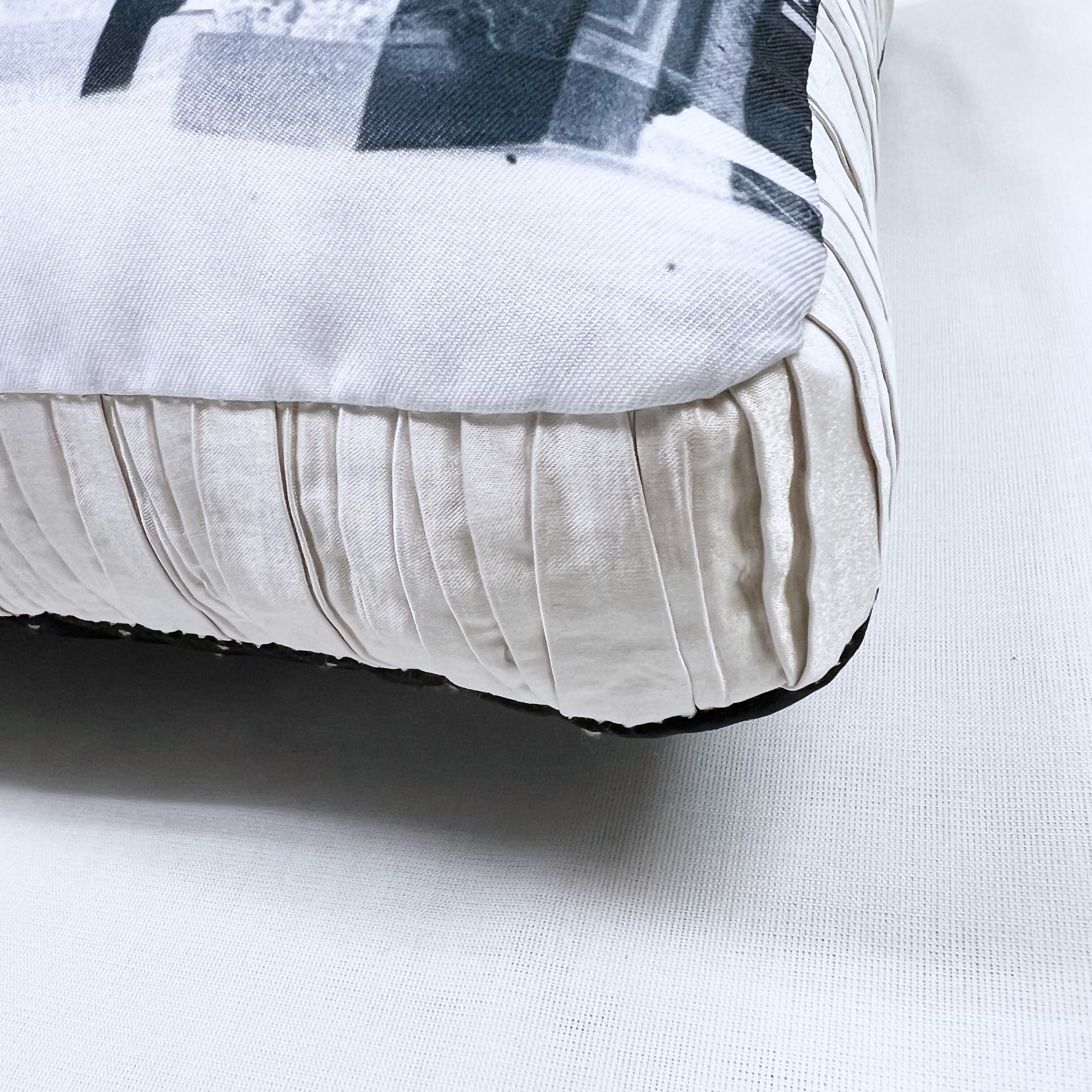 古いポストカードに使われていた写真をプリントした生地に、マチはアイボリー色のランダムプリーツのサテン生地、裏側にはブラックのジャガード生地を使っています。