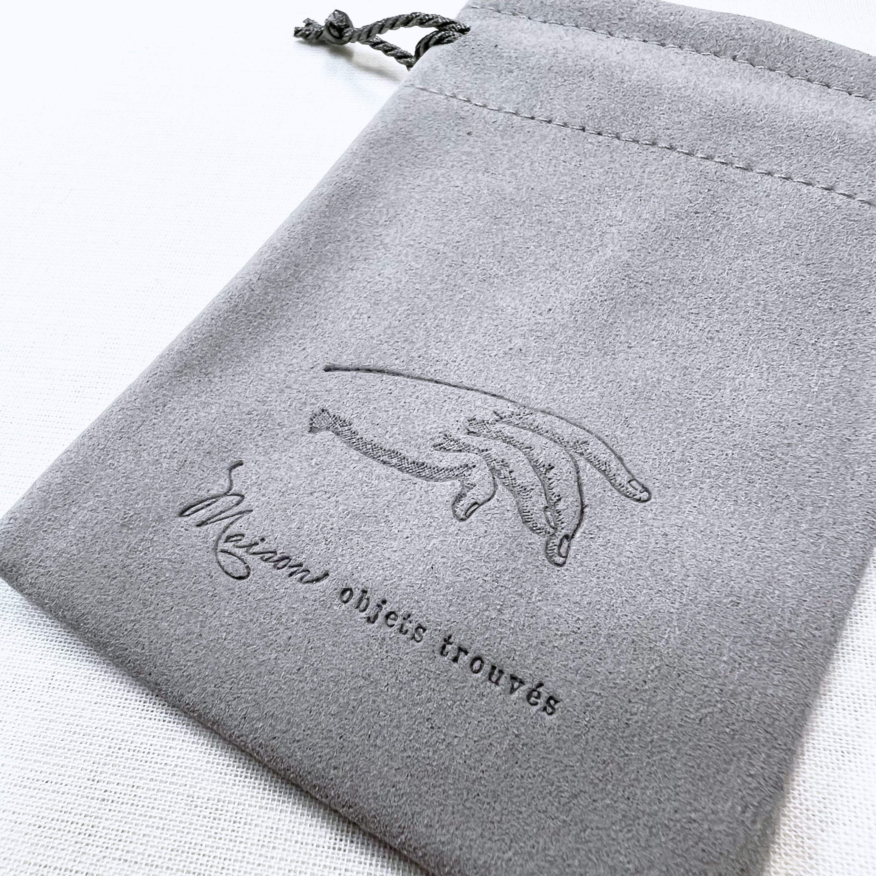 グレーの生地にダークグレーの紐を合わせた専用の巾着ポーチには博物画の手を型押ししています。