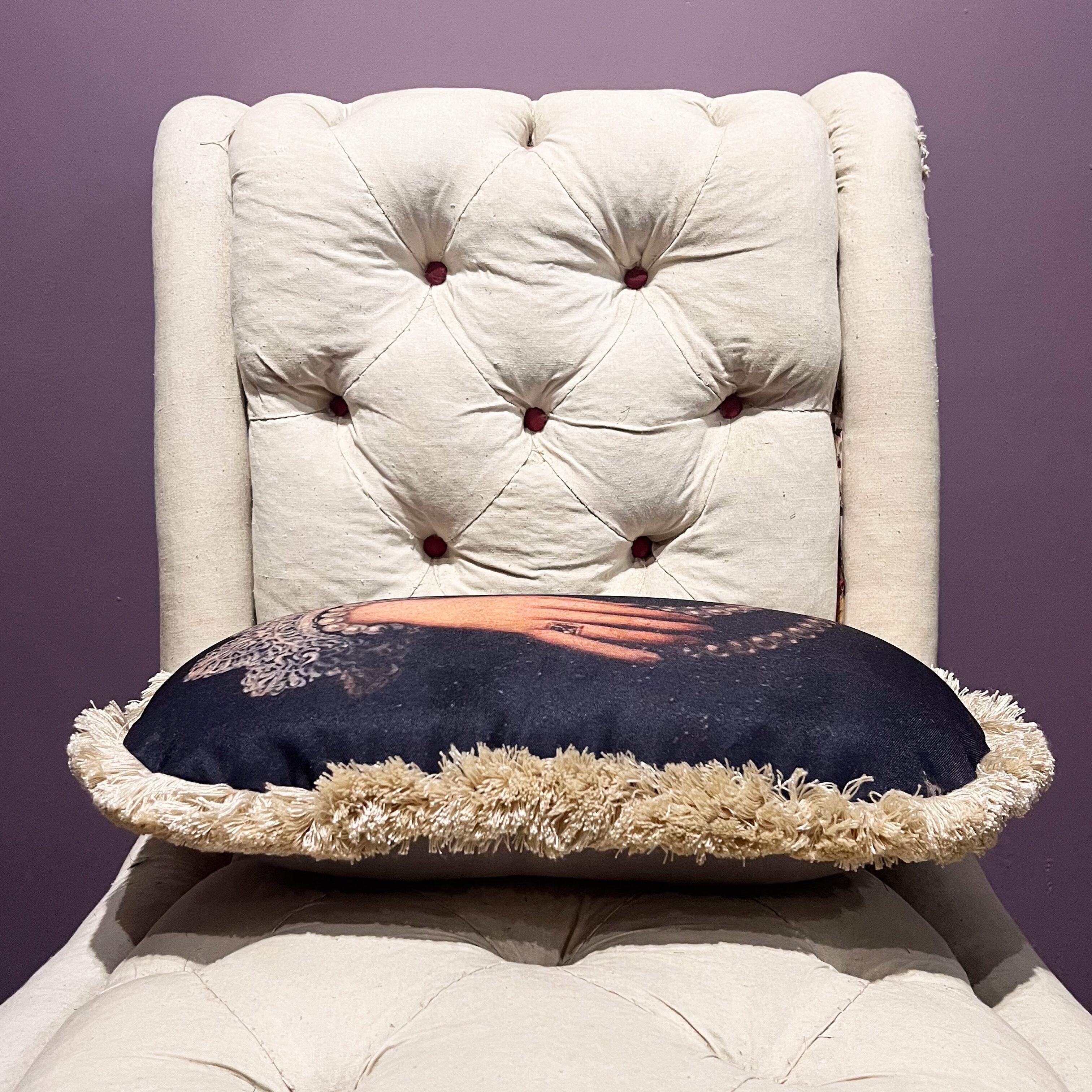 中世絵画をプリントした生地に、フランスのヴィンテージフリンジを付けました。