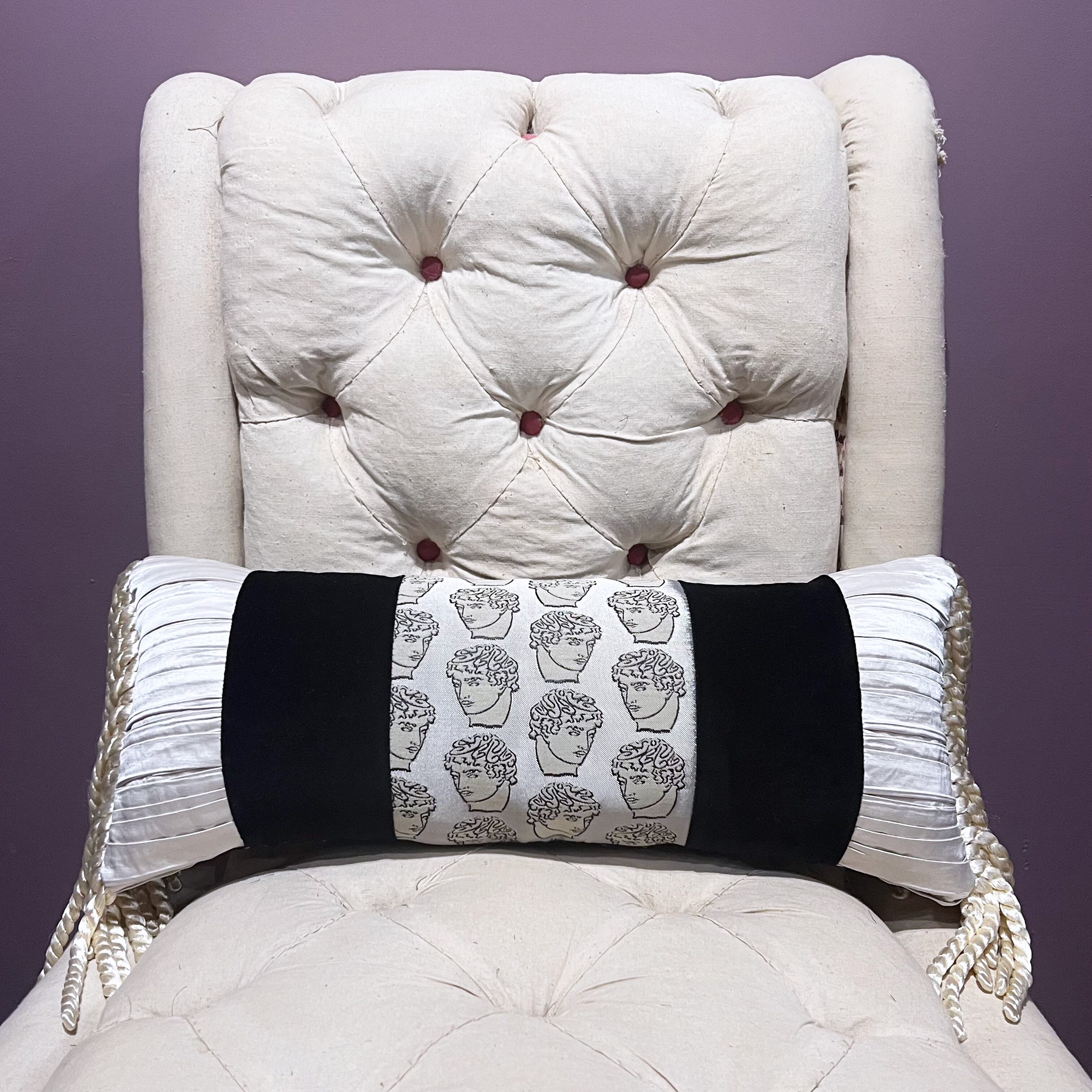アンティークのボルスタークッションのデザインを踏襲しました。