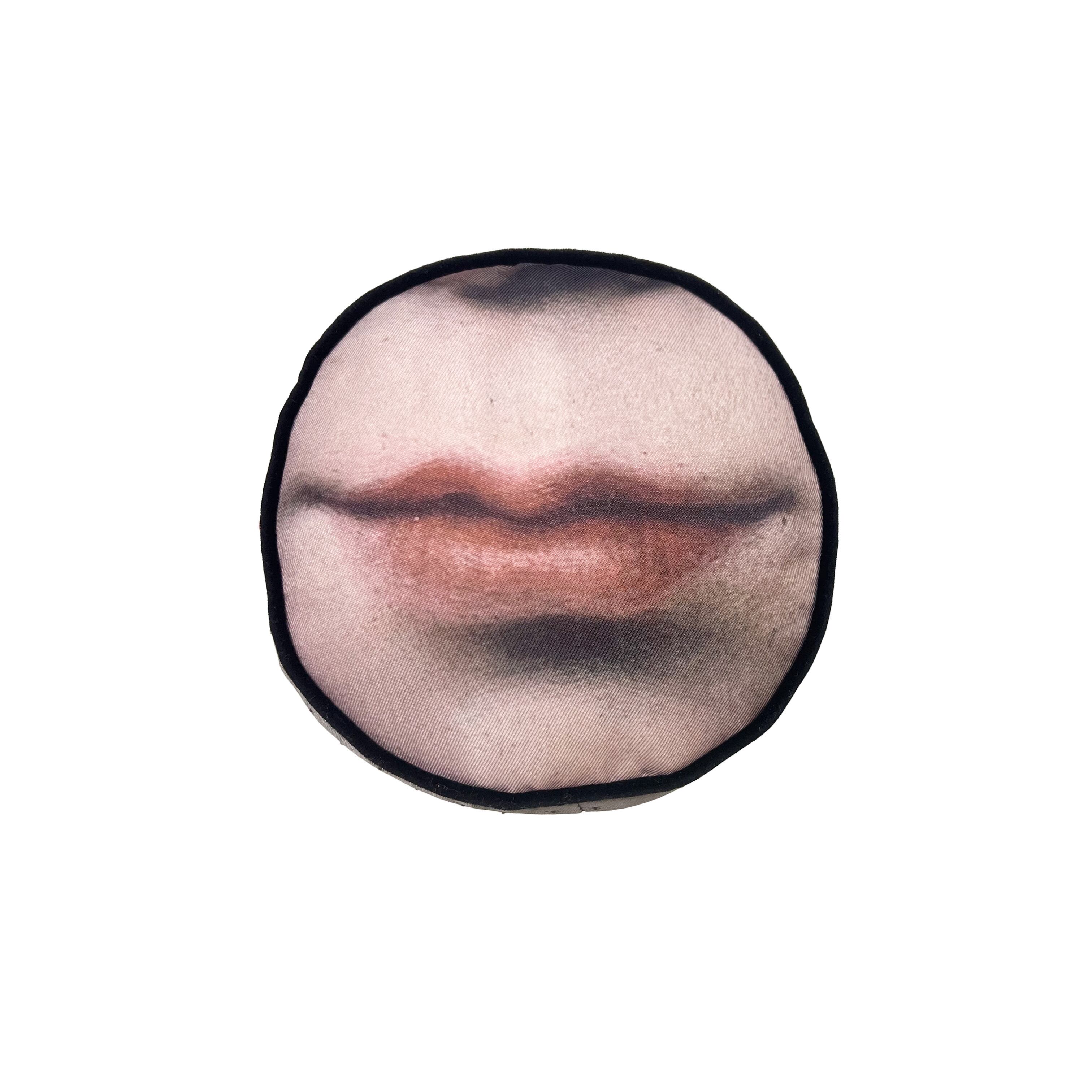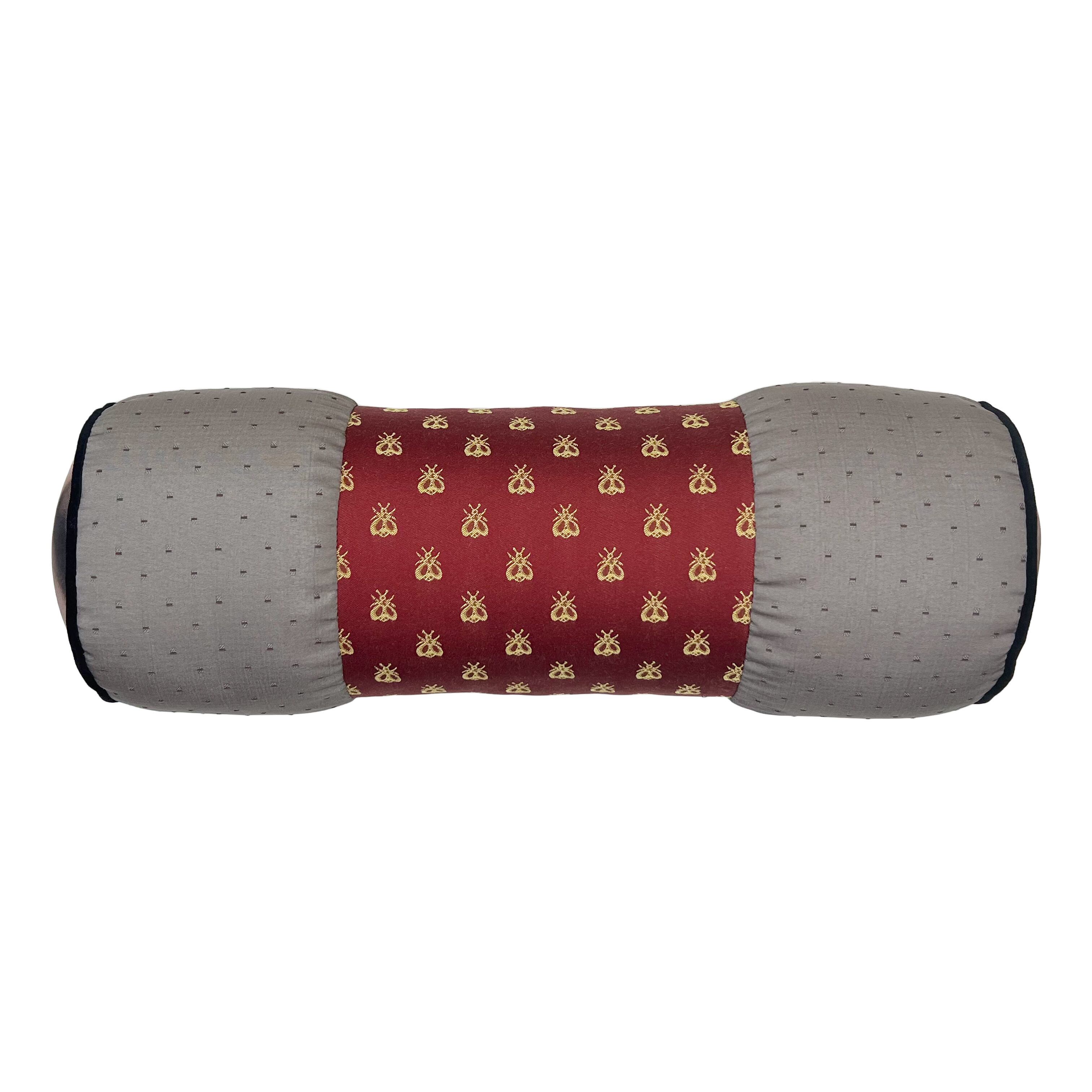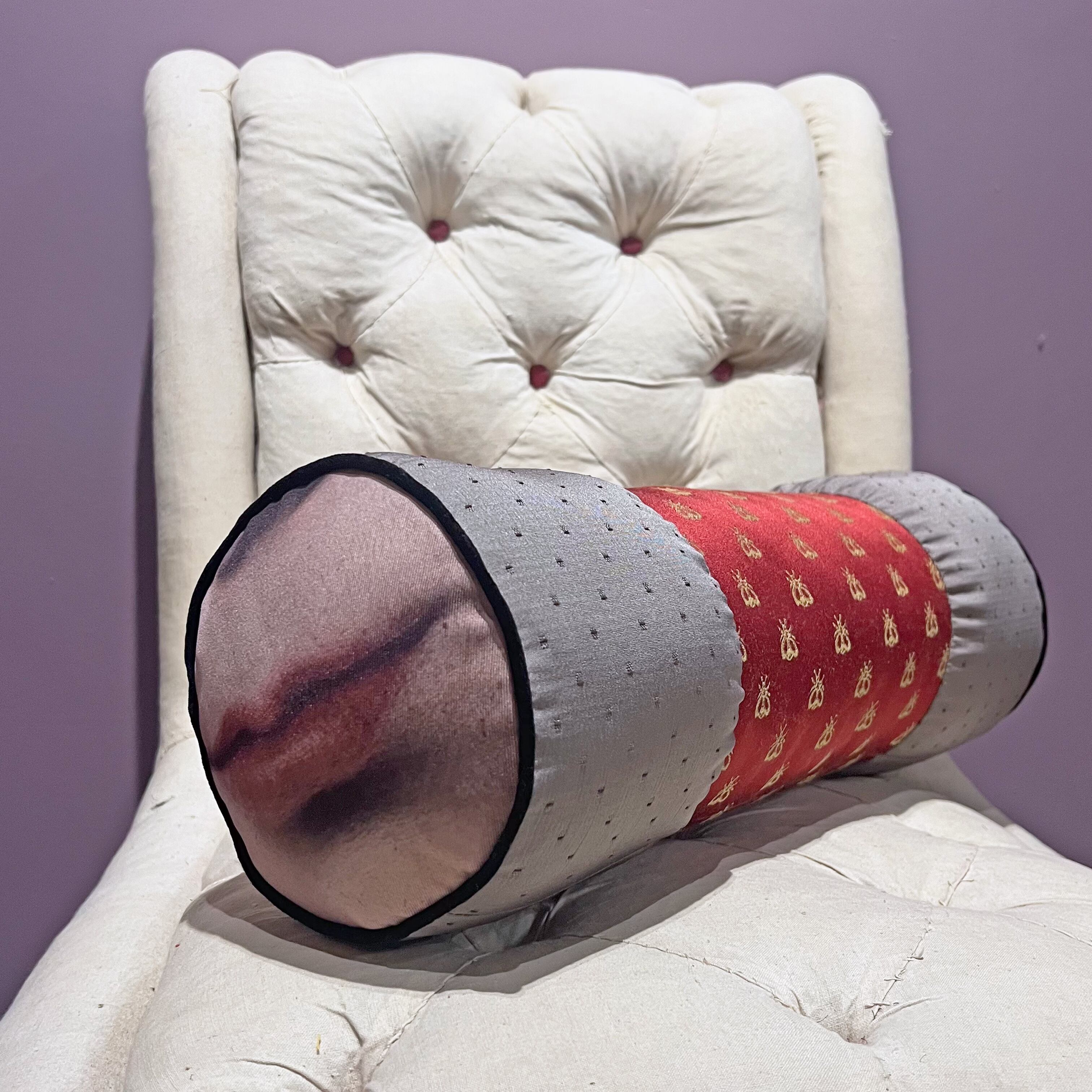 両端に中世絵画をプリントした生地を使ったボルスタークッション。