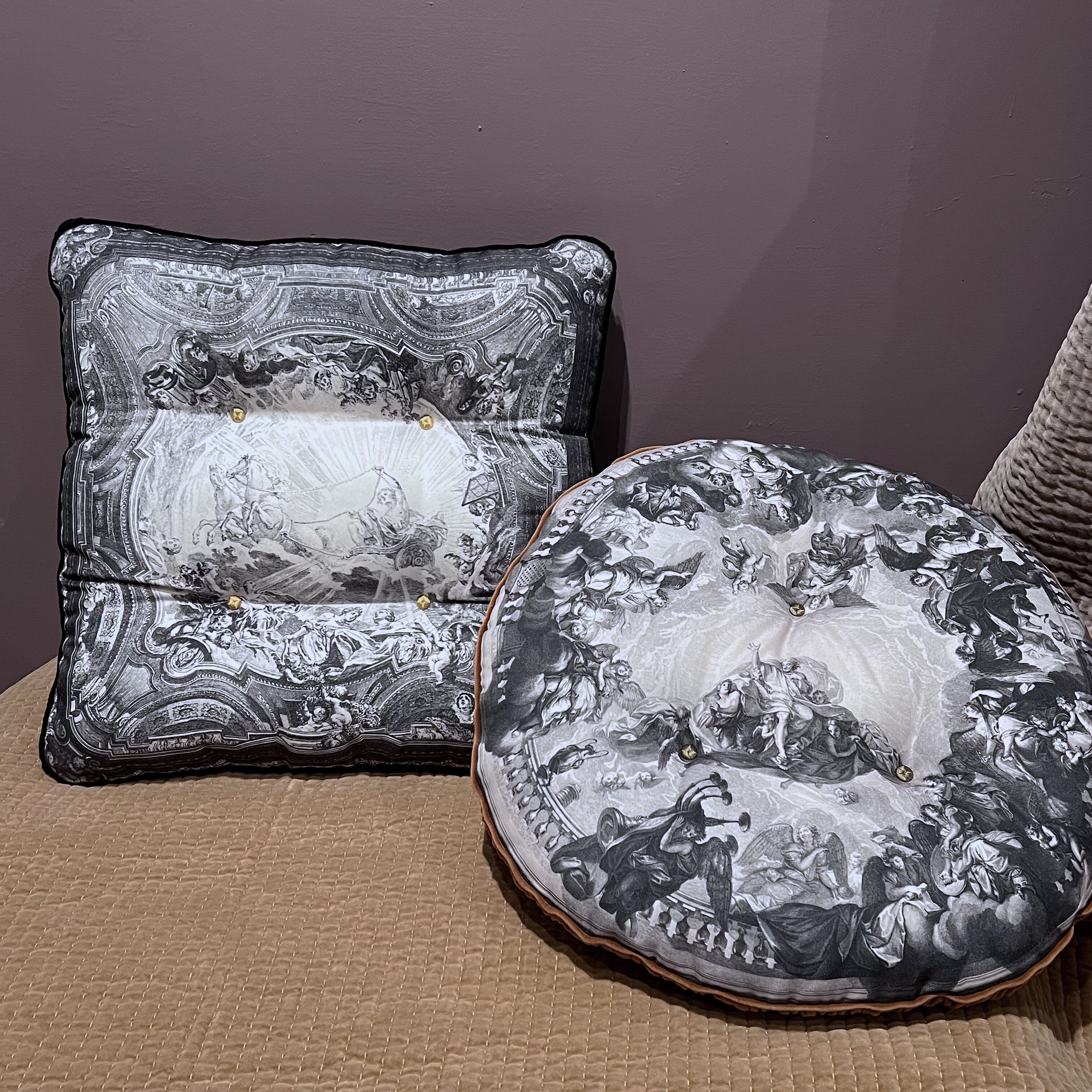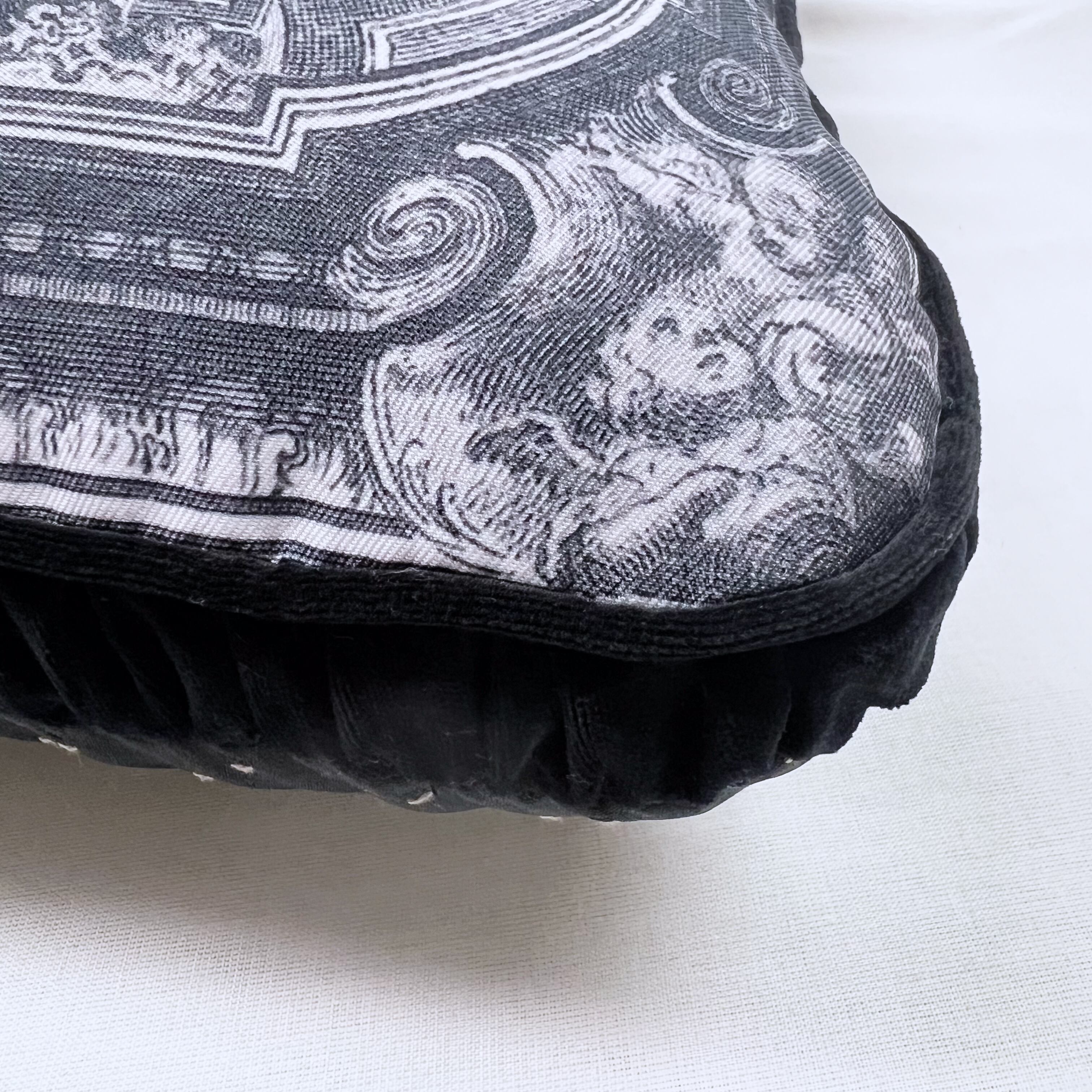 フランスの古い天井画をプリントした生地に、ブラックのコットンベロア生地でパイピングとギャザーマチを付けました。
