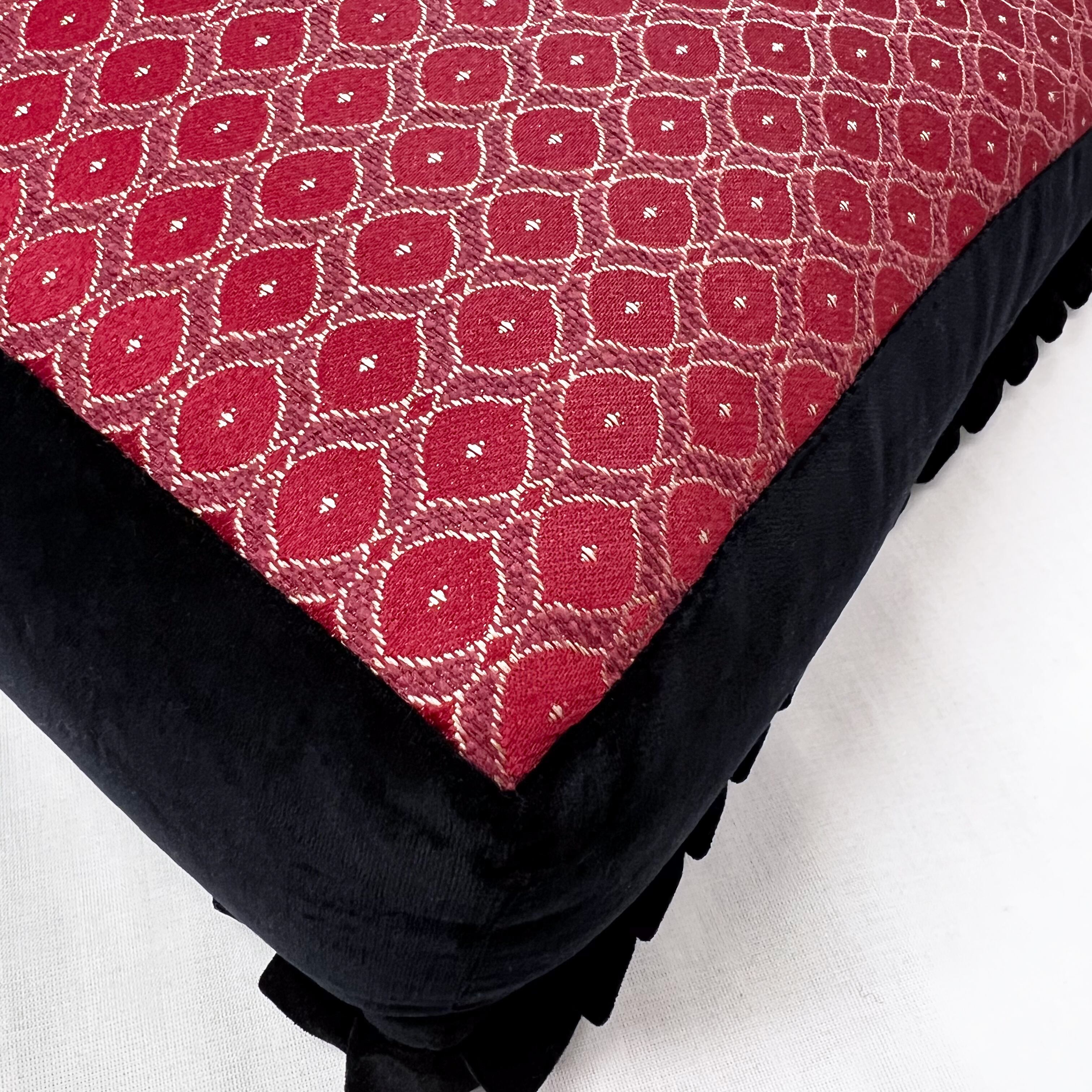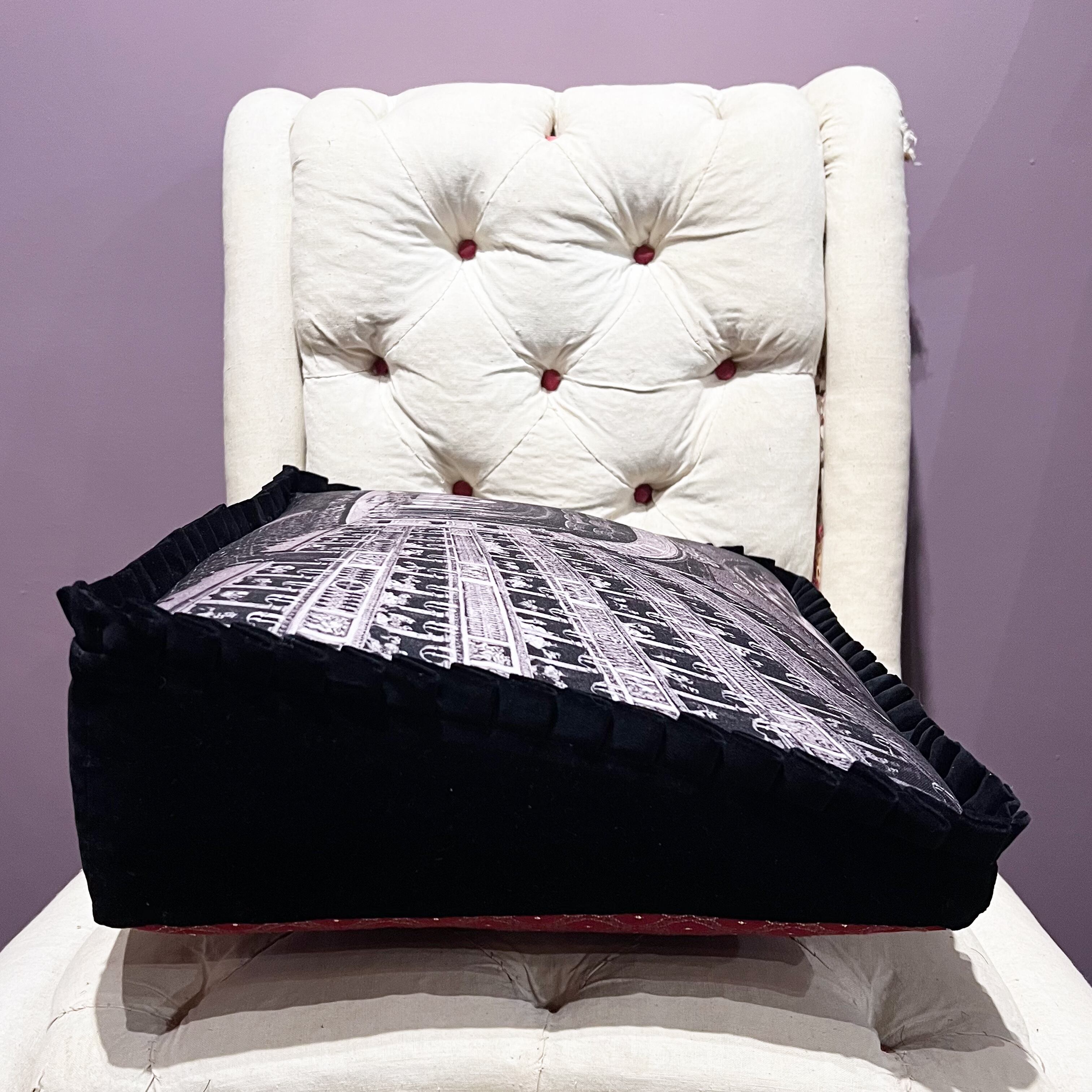 古い劇場の絵をプリントした生地に、コットンベロアのプリーツを付けました。