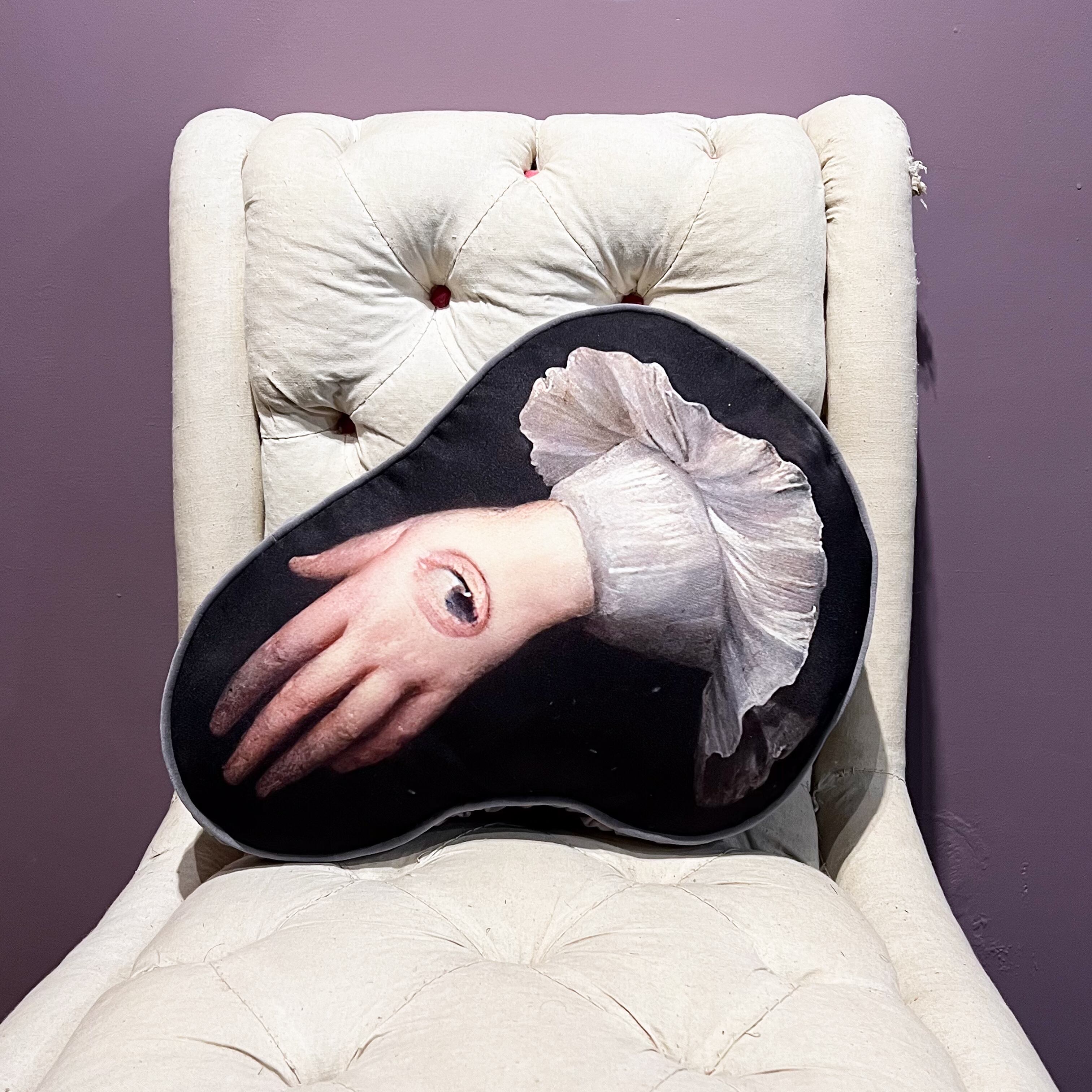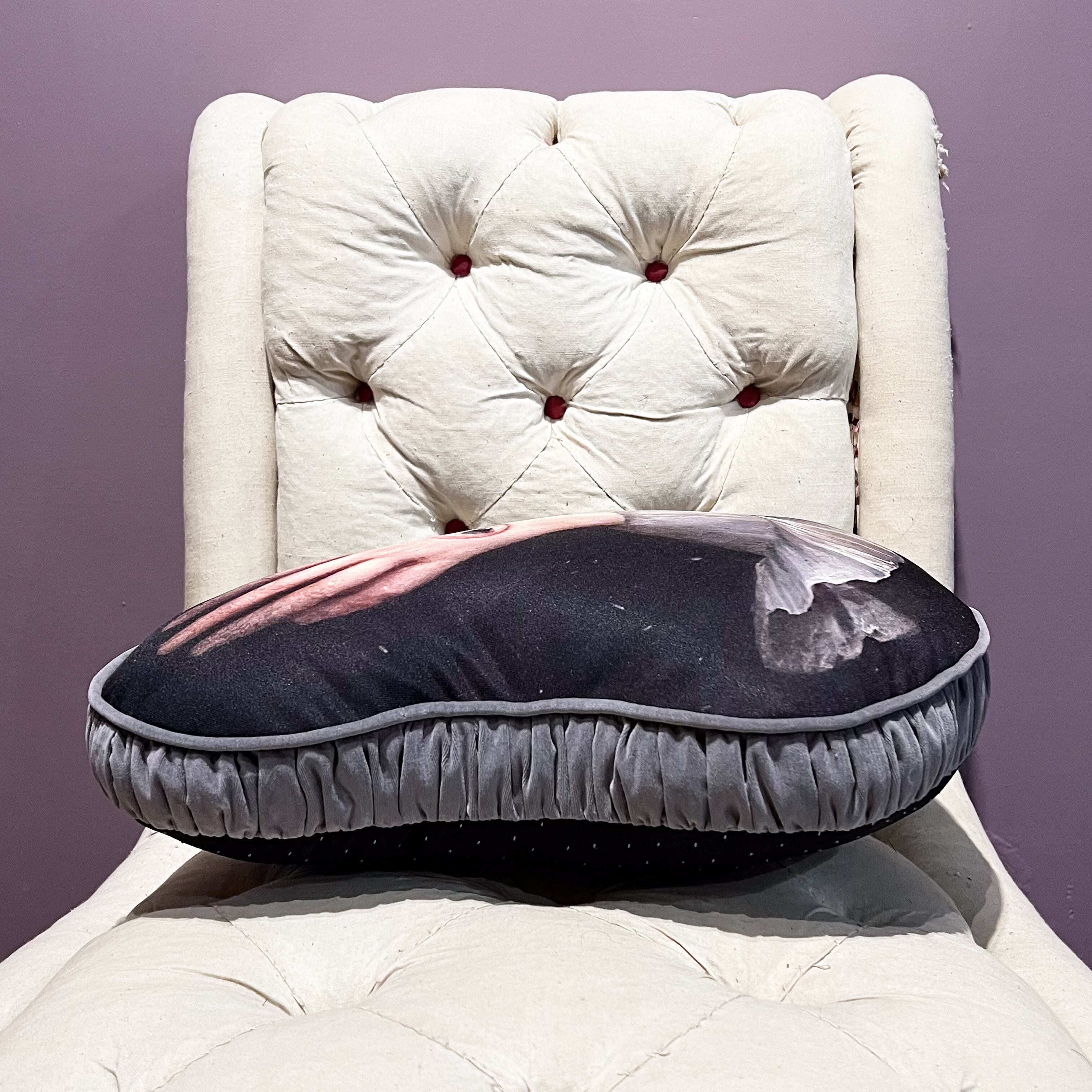 中世の絵画をプリントした生地に、グレーのコットンベロア生地でパイピングとギャザーマチを付けました。