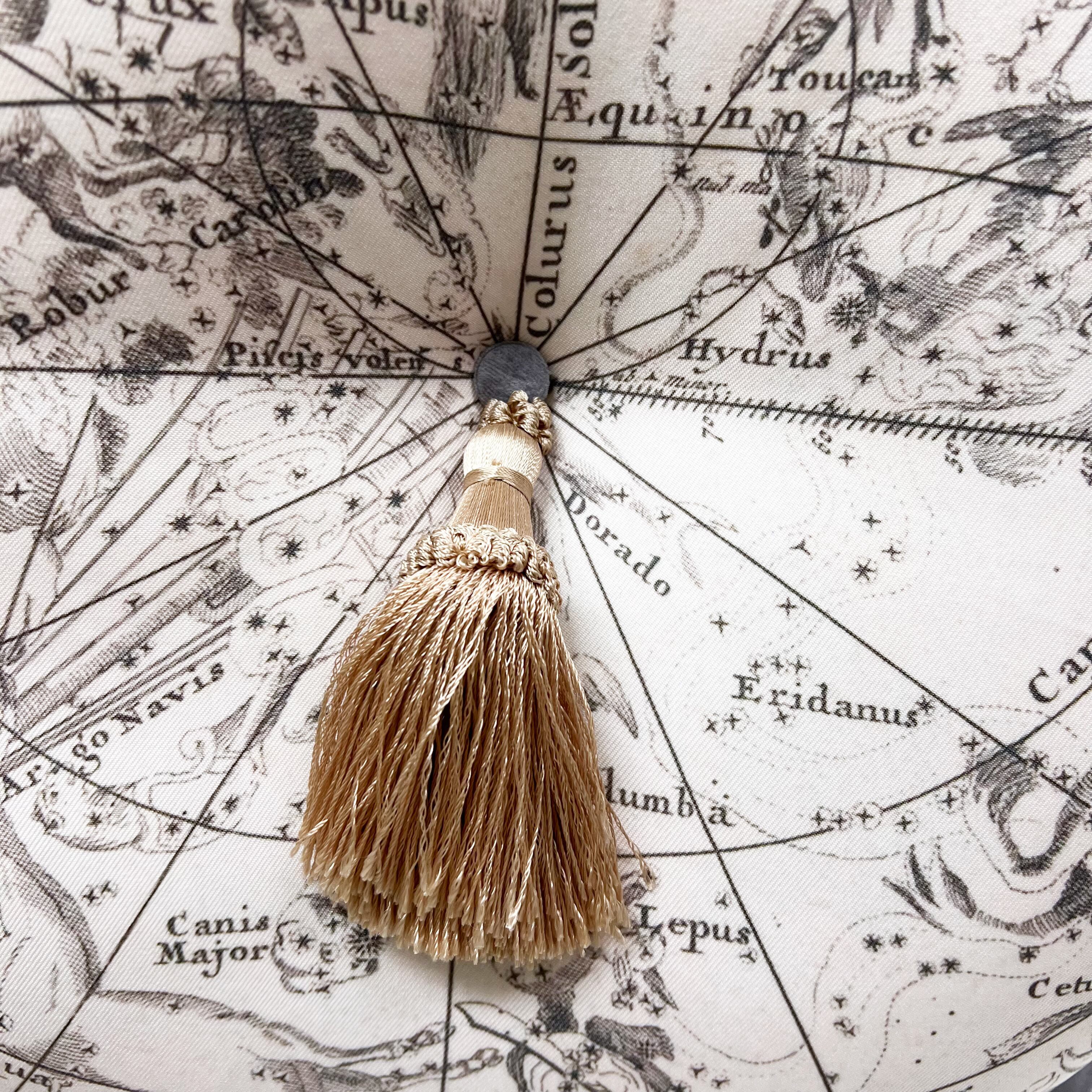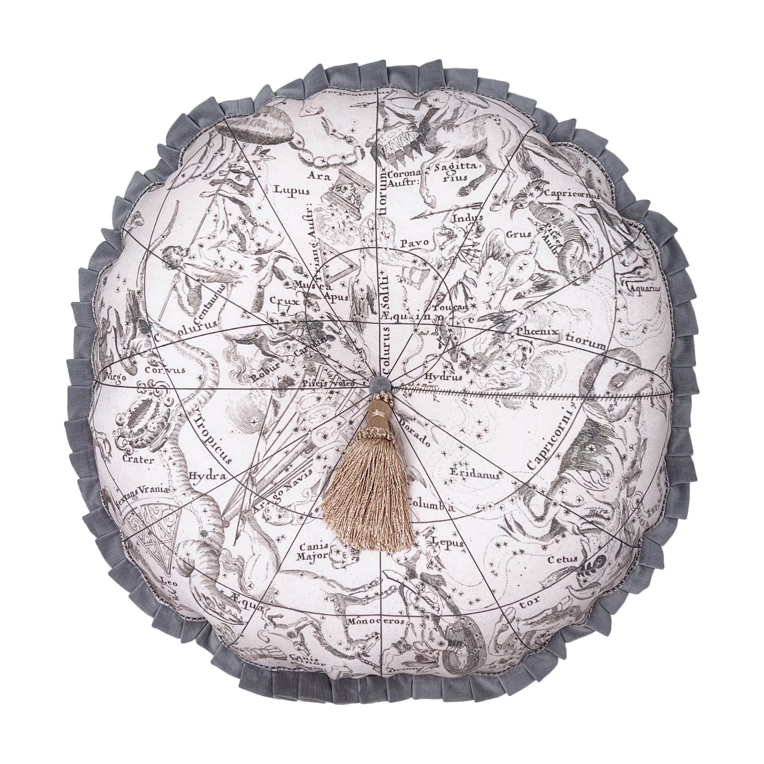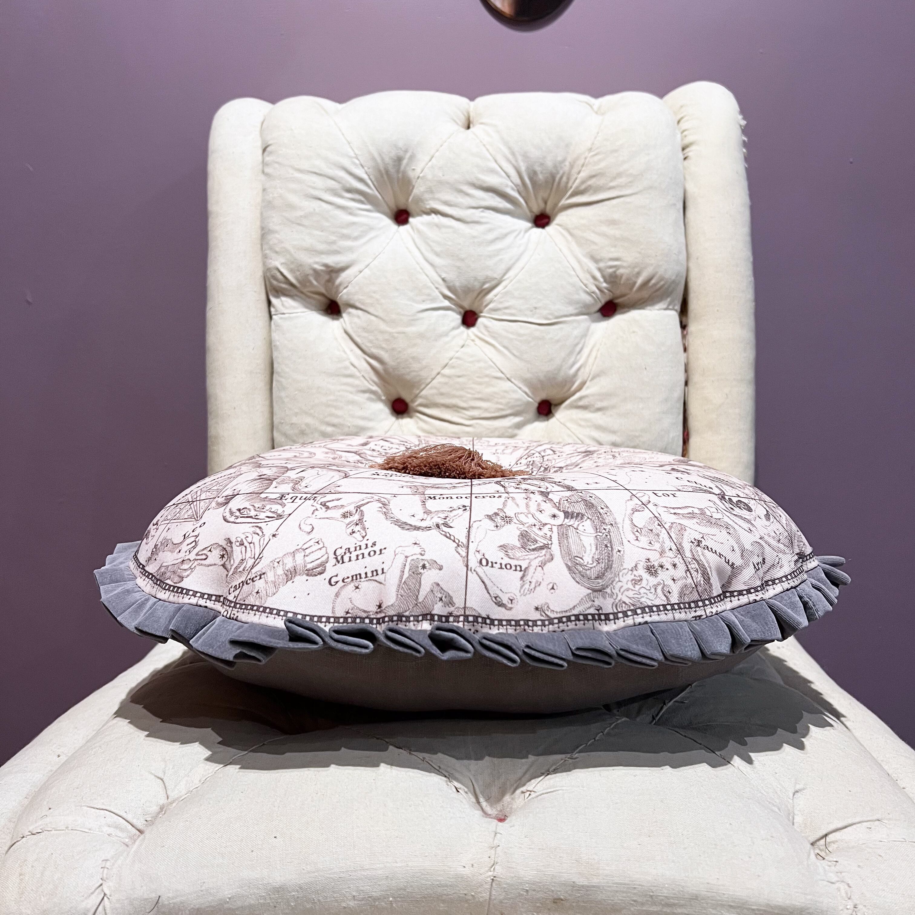 1700年代の天体図(南)をプリントした生地に、グレーのコットンベロアでプリーツを付けました。