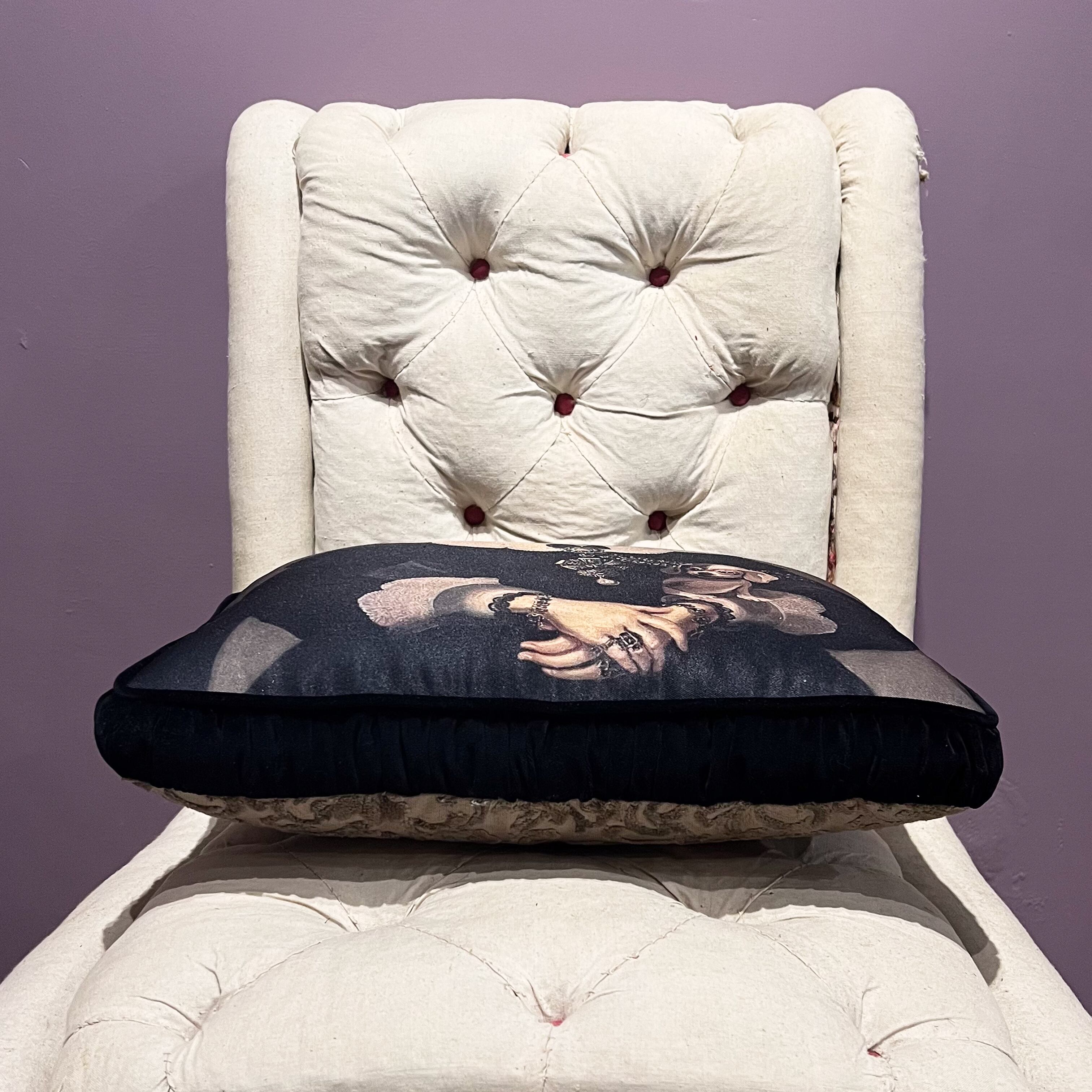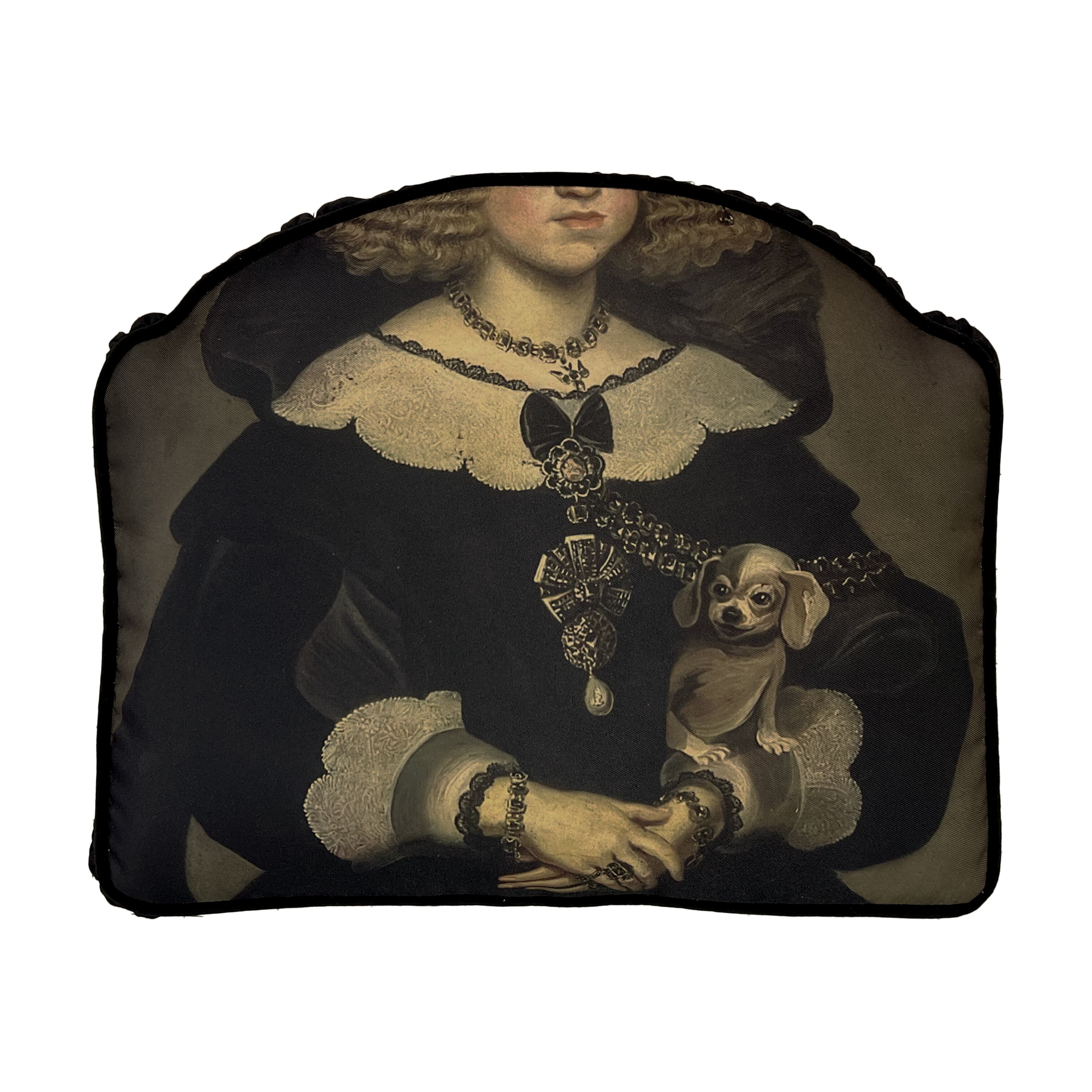 中世の絵画をプリントした生地に、ブラックのコットンベロア生地でパイピングとギャザーマチを付けました。