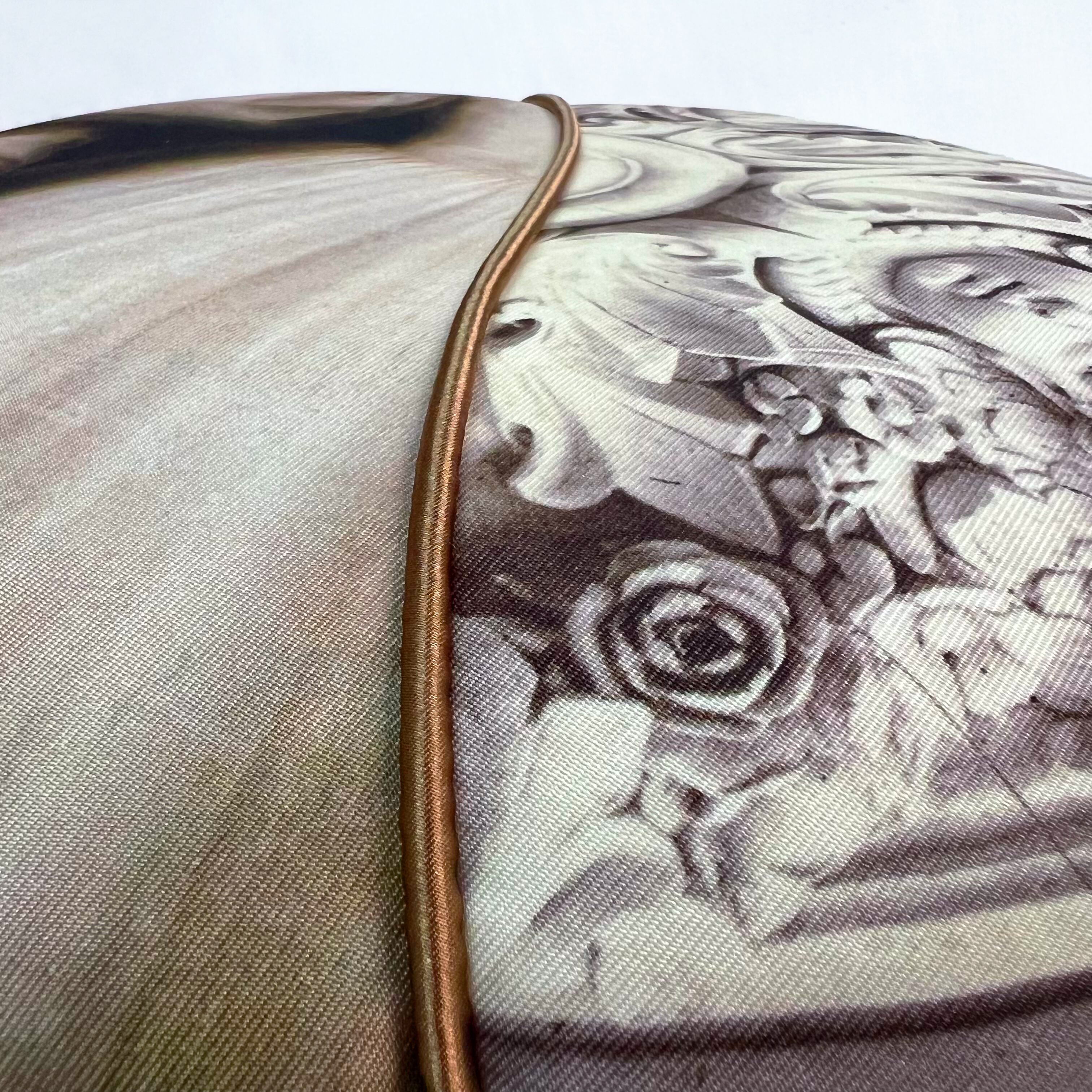 中世の絵画と彫刻をプリントした生地に、ゴールドサテンのパイピングとジャガードのフリル、ゴールドのオニオンタッセルを合わせました。
