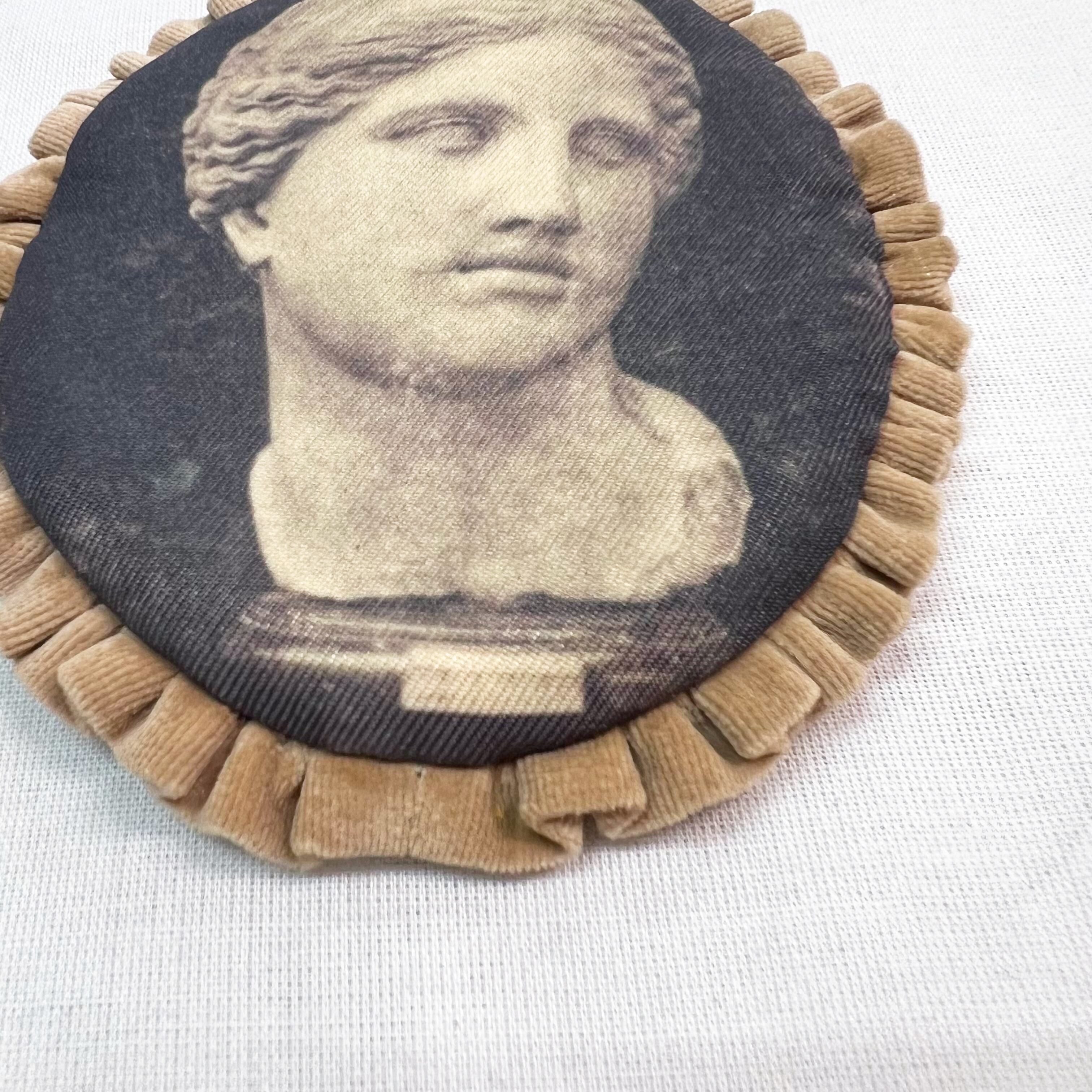 中世の彫像をプリントした生地に、くすんだピンクベージュのコットンベロア生地でフリルを付けました。