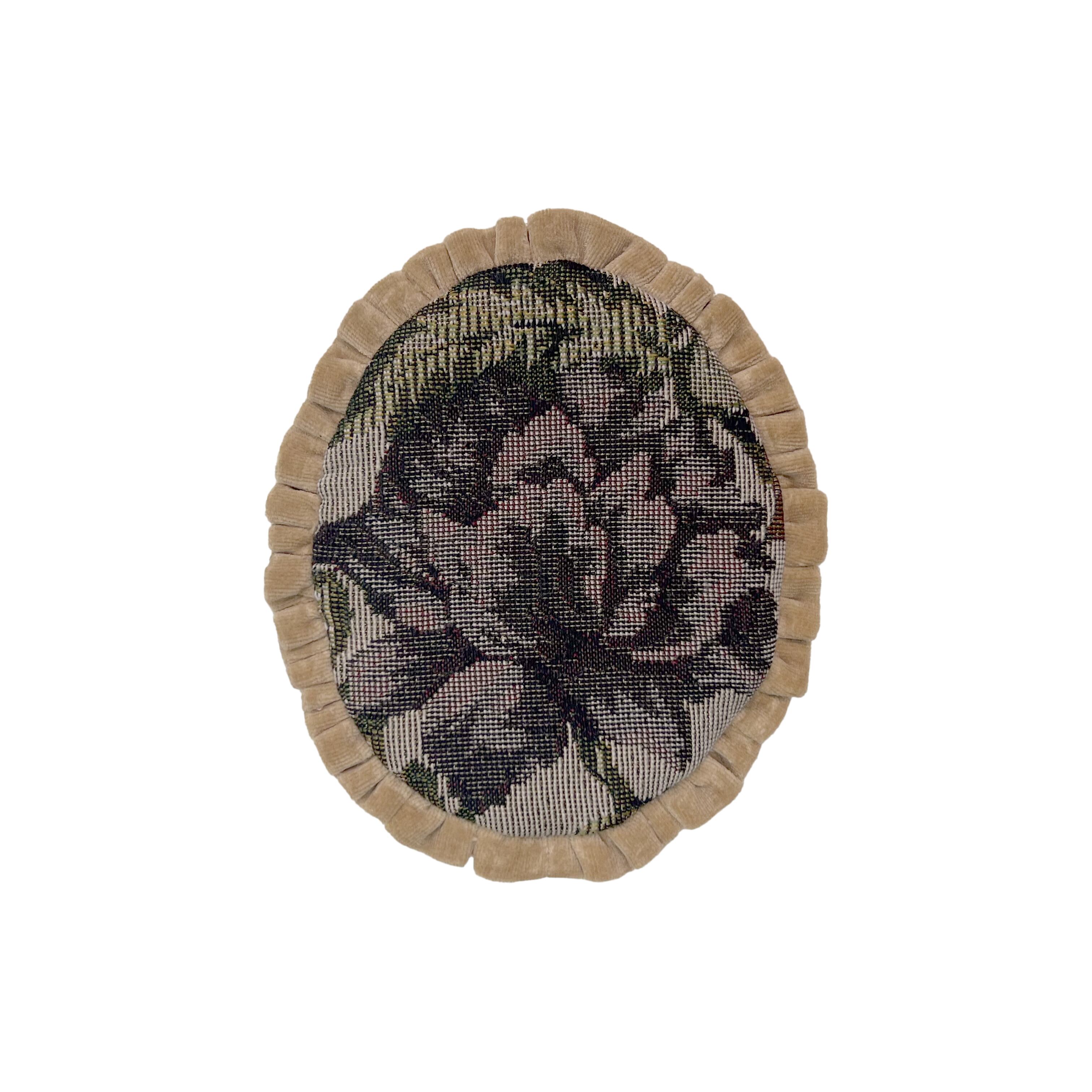表面はオリジナルプリントの生地、裏面の生地と装飾は端切れやヴィンテージのものなど製作する際にアトリエにあるものや大切にコレクションしている材料を組み合わせて作っています。