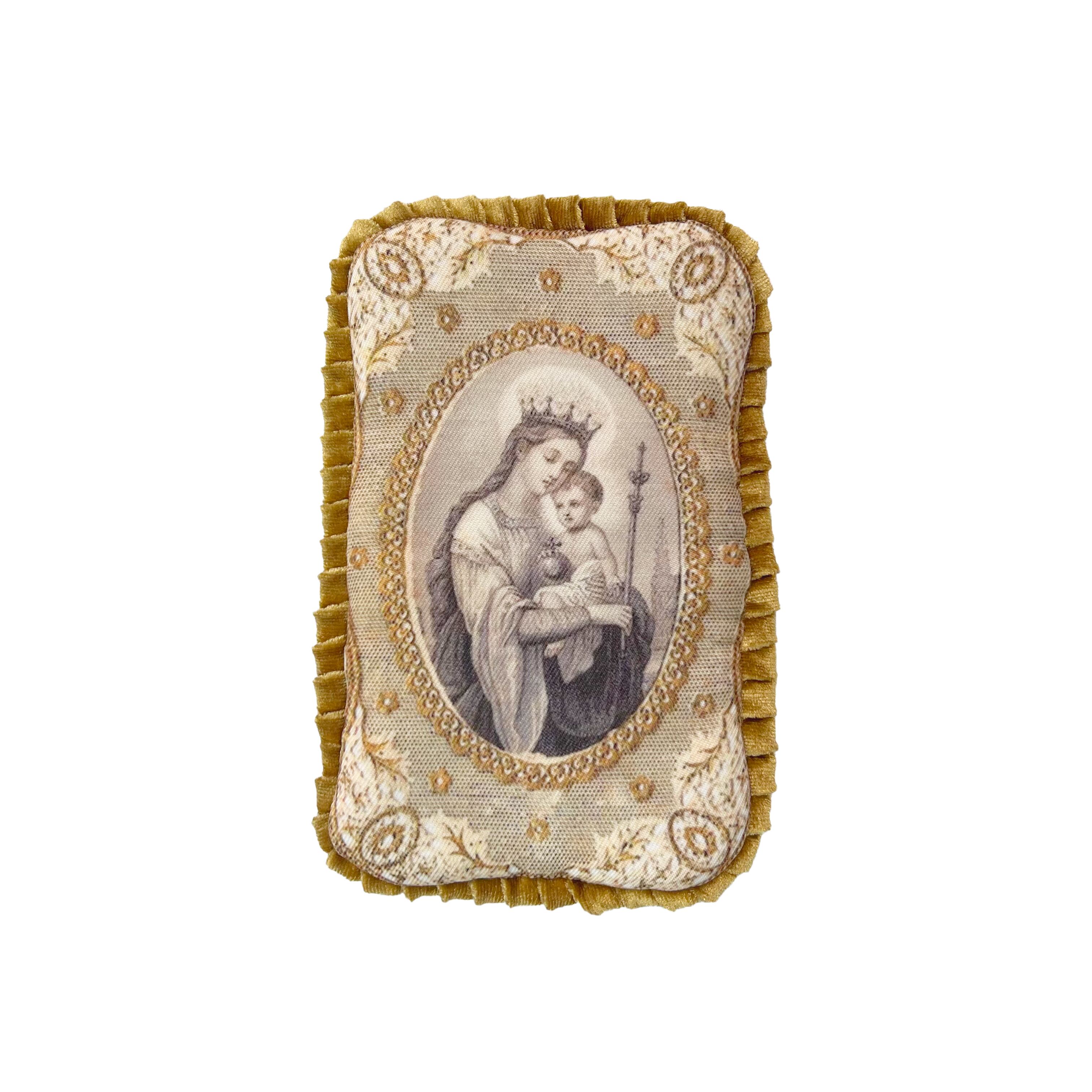 アンティークのホーリーカードをプリントした生地に、マスタードゴールドのベロア生地でプリーツを付けました。