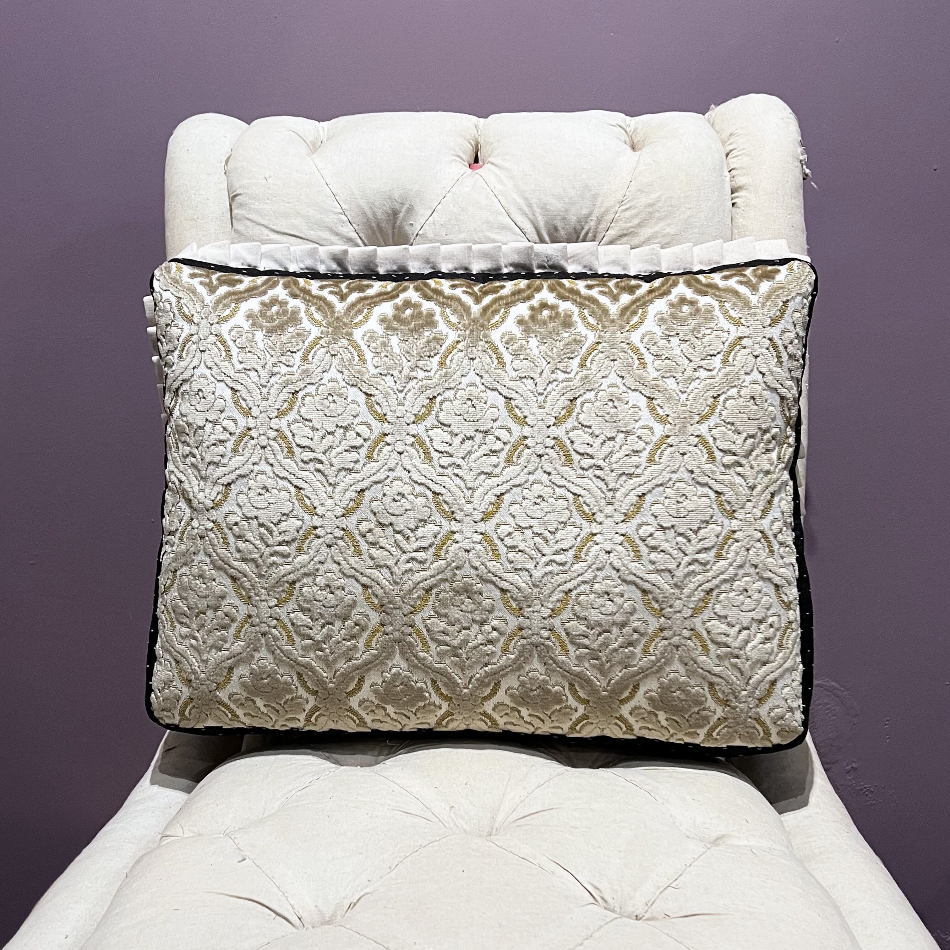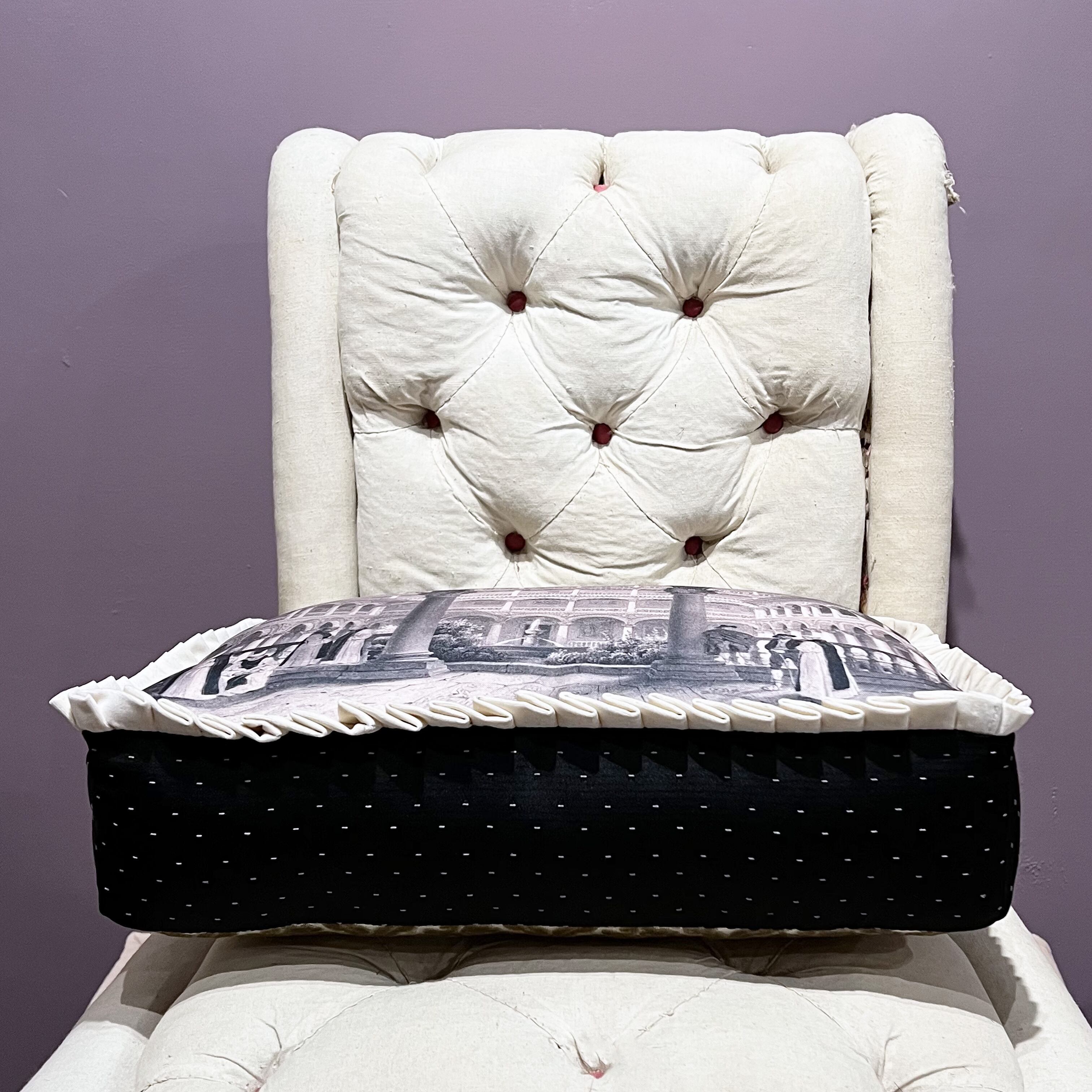 古い絵画をプリントした生地に、ホワイトのコットンベロアプリーツを付けました。